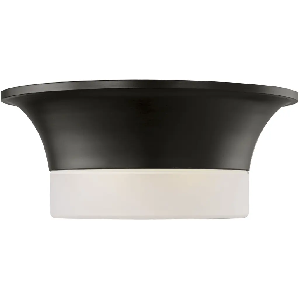 The Sina flush mount by Alexa Hampton plays with proportion through a shallow cylinder and generous flared silhouette. The striking contrast between the dark metal band and white glass diffuser is complemented by a softly cast glow. Available in two finishes, the Sina flush mount silhouette will fit effortlessly into any room.
