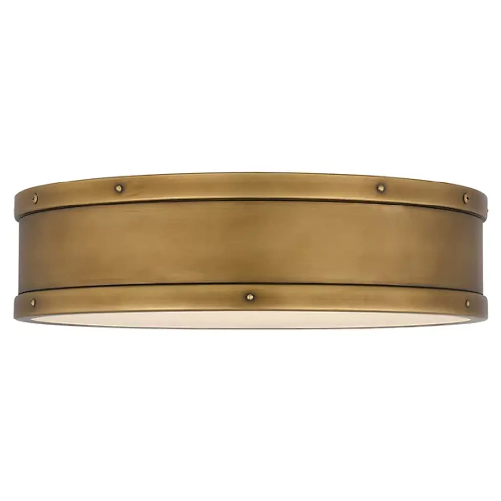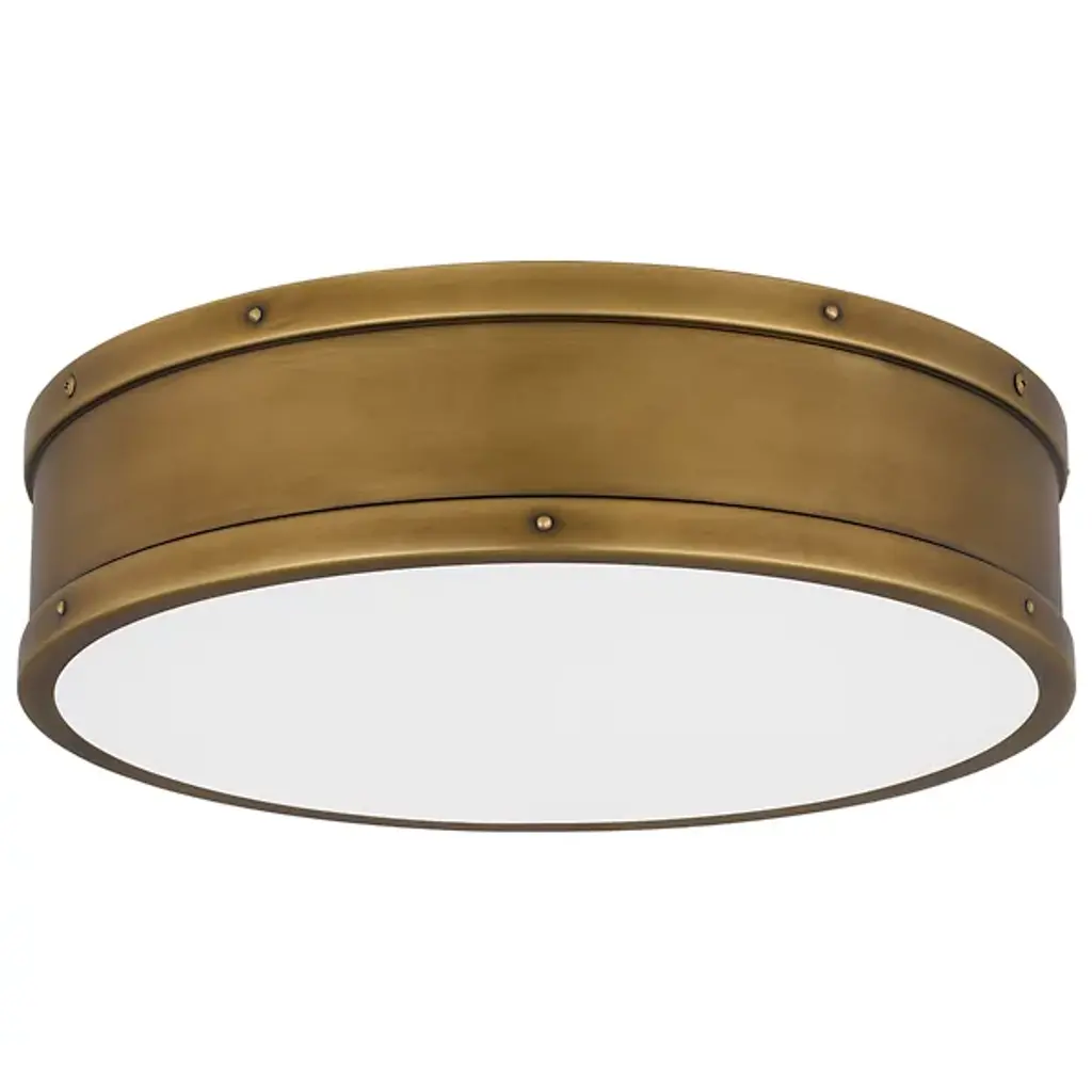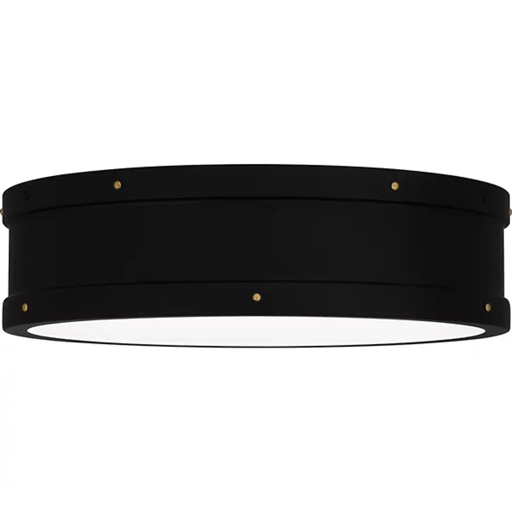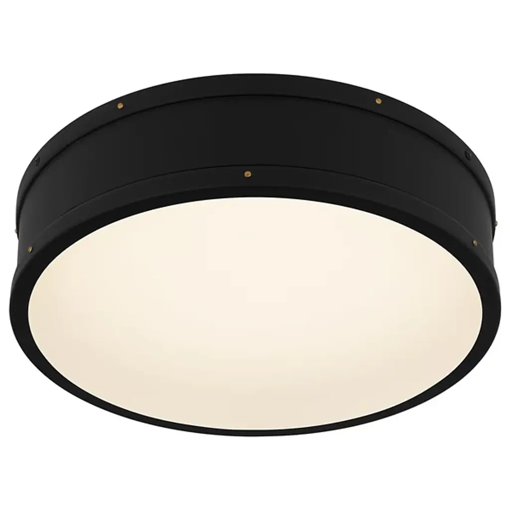 A crisp design with coastal flair. The Ahoy LED Flushmount by Quoizel is a stout fixture that brings energy-efficient illumination through a nautical-inspired design. Crafted from smooth steel, its drum-shaped silhouette boasts a series of exposed bolt details, lending an industrial quality while remaining sophisticated and straightforward. A frosted diffuser softens the glow from its integrated LED light source, supplying ample illumination that is evenly balanced and long-lasting. This fixture is suitable for dry or damp spaces for maximum adaptability