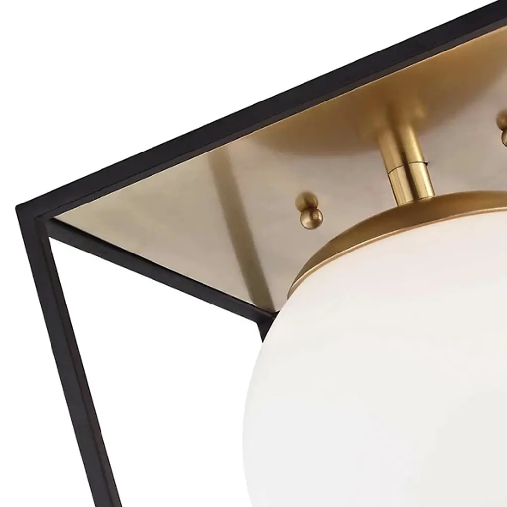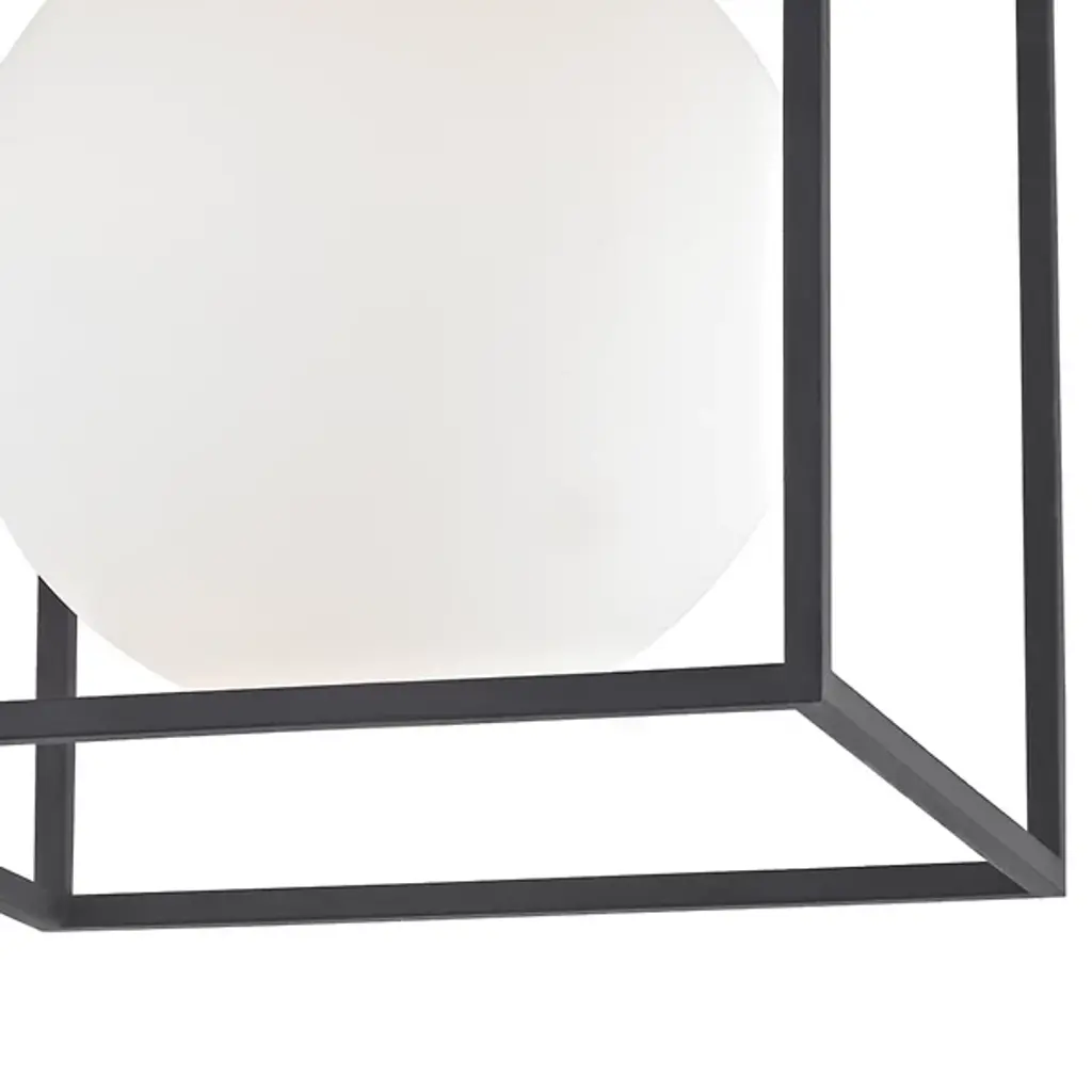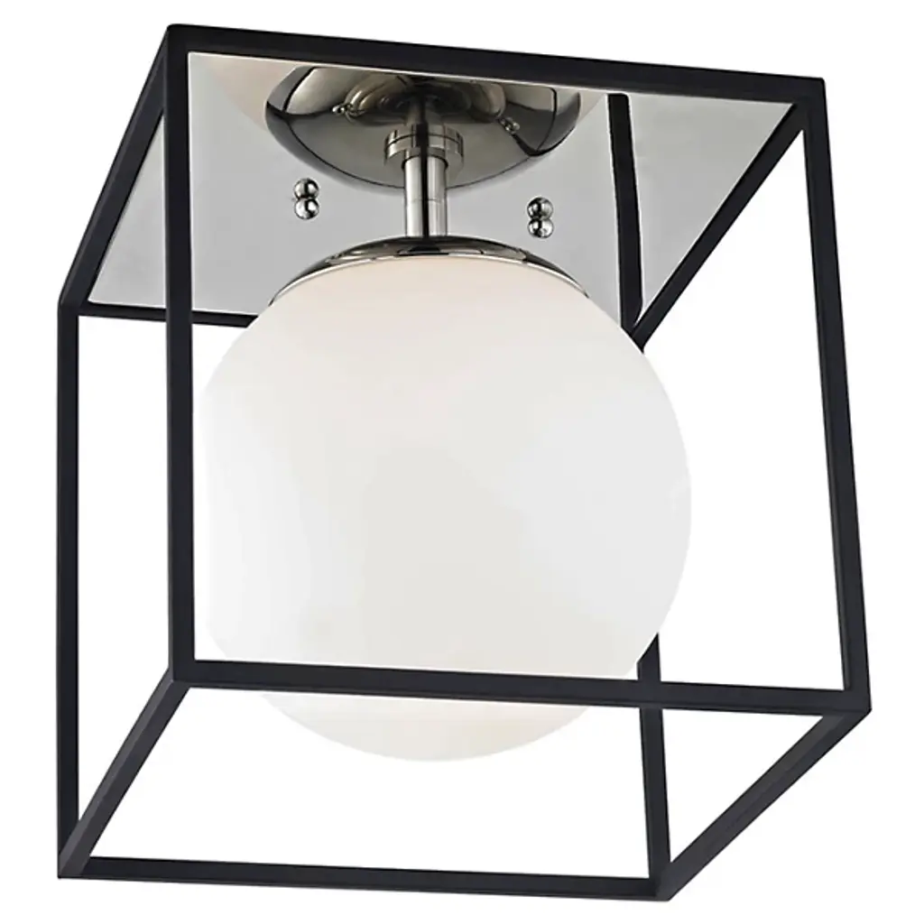 A simple open-side cube box is home to the Aira Flushmount by Mitzi - Hudson Valley Design. Inside the Metal framework, a large Opal Etched Glass sphere covers an incandescent lamp. This mostly minimalist design showcases a gleaming metal ceiling plate and cap holder with a pair of round finial accents, reflecting a warm glow over a foyer, kitchen, dining room or office.