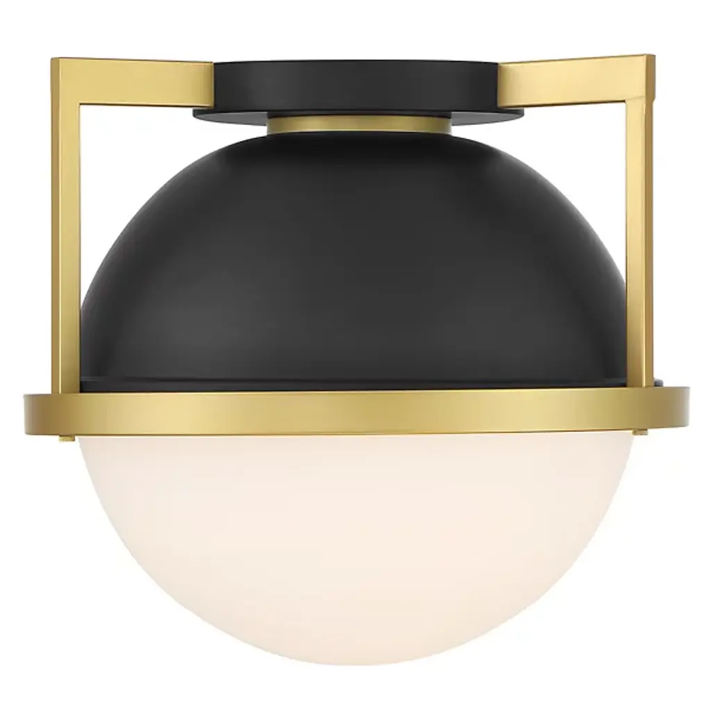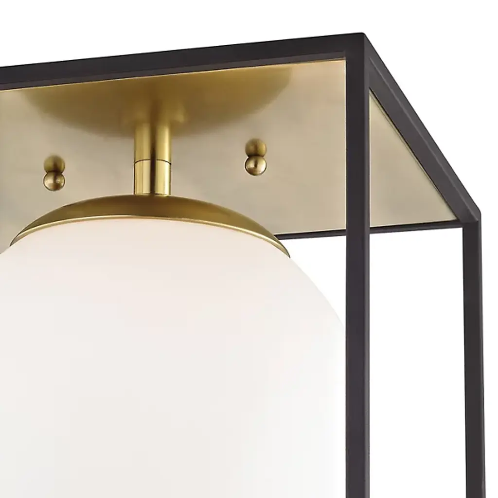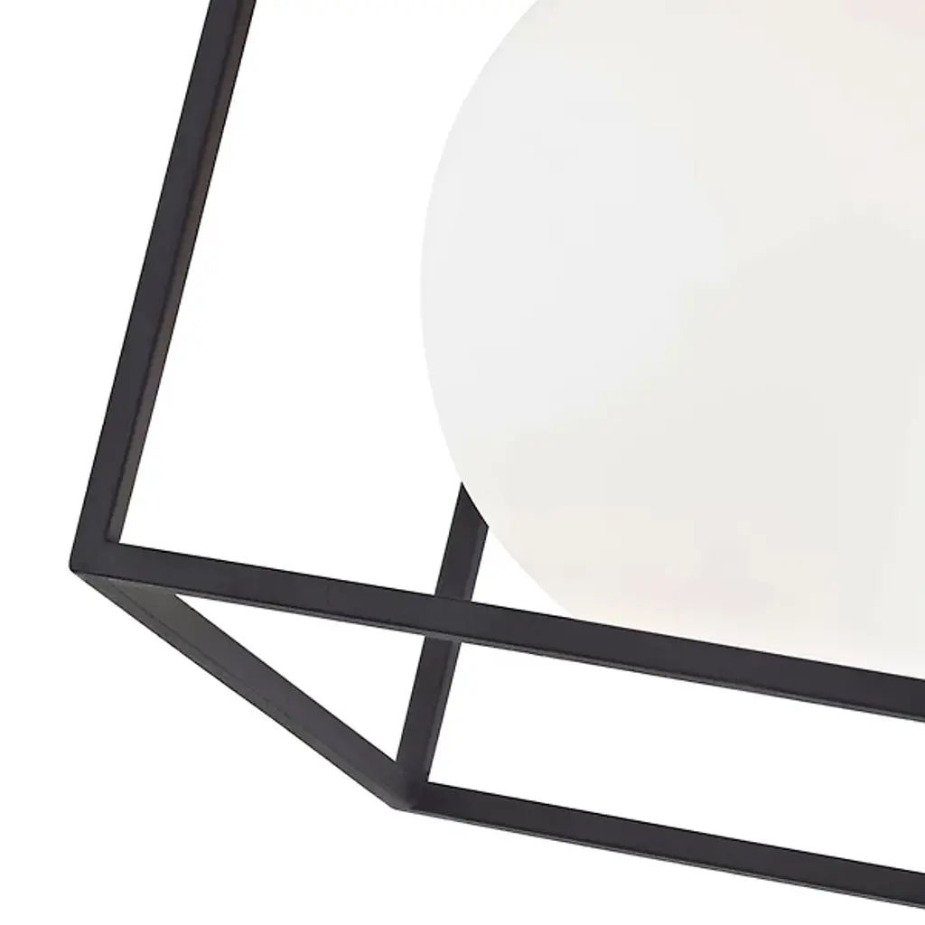 A simple open-side cube box is home to the Aira Flushmount by Mitzi - Hudson Valley Design. Inside the Metal framework, a large Opal Etched Glass sphere covers an incandescent lamp. This mostly minimalist design showcases a gleaming metal ceiling plate and cap holder with a pair of round finial accents, reflecting a warm glow over a foyer, kitchen, dining room or office.