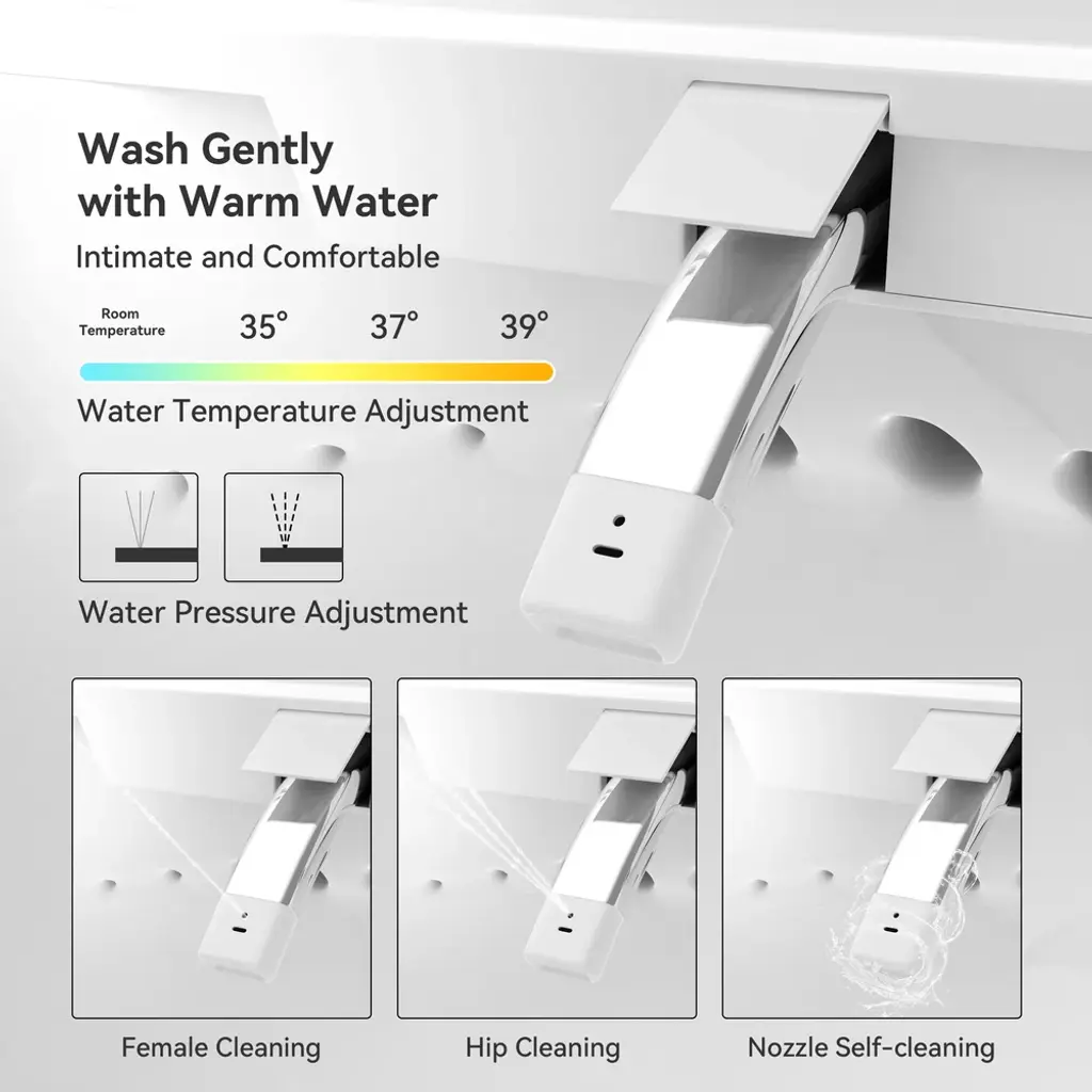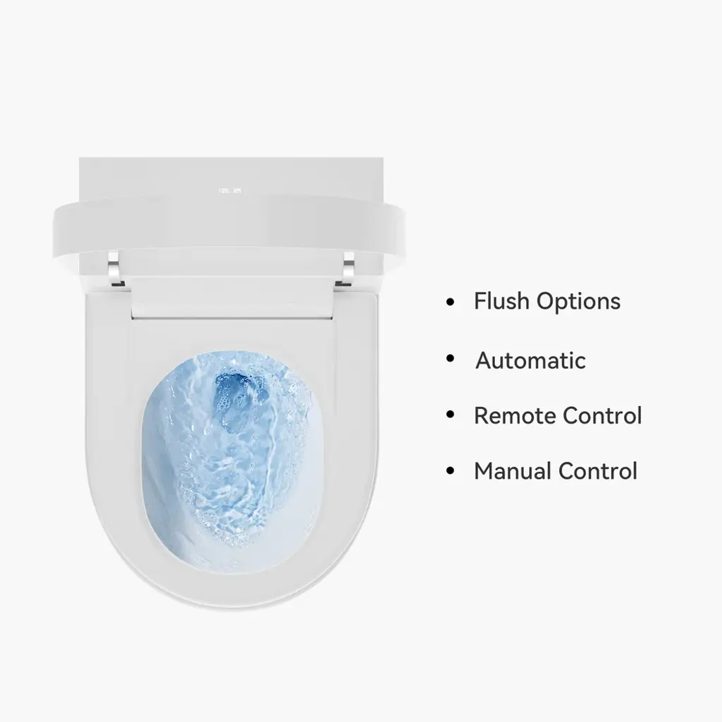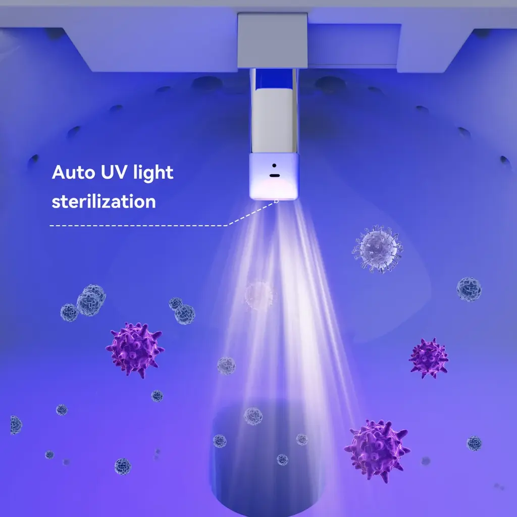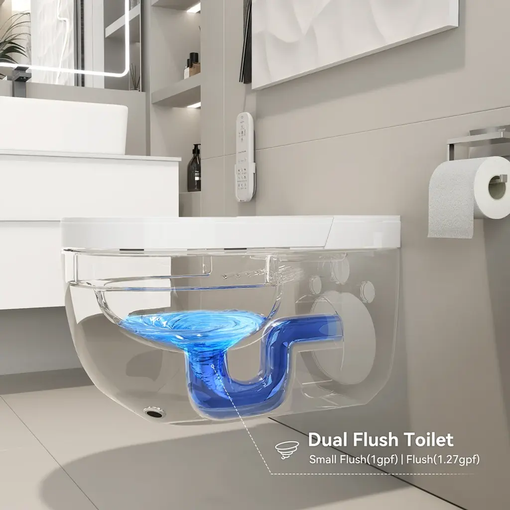 Upgrade your bathroom experience with this Elongated wall-hung smart bidet toilet, constructed of high-quality ceramic. Enjoy UV sterilization, heated seat, warm air dryer, and soft-close lid. Features auto flush, self-cleaning nozzle, water pressure control, and hidden tank for a contemporary look. For comfort, hygiene, and convenience in any modern home.