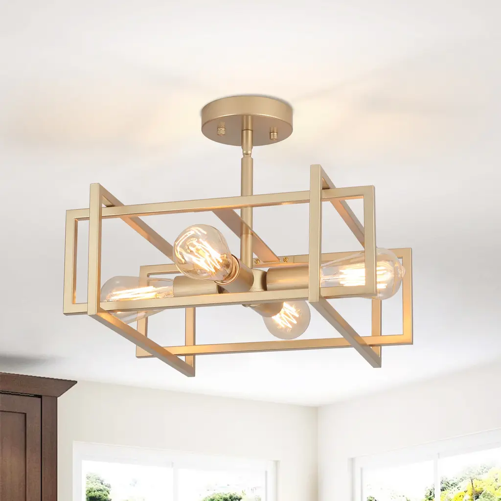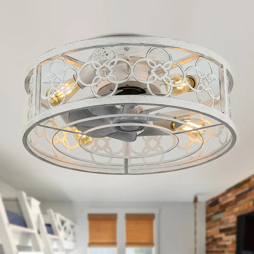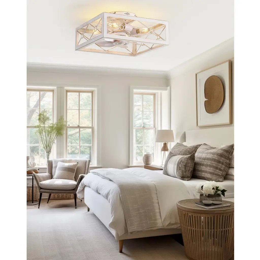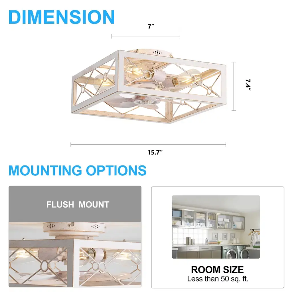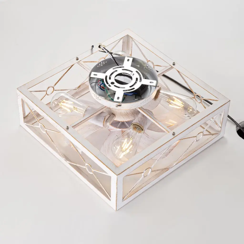 The Airsurfer ceiling fan boasts a unique square white/gold metal cage design, and the intersecting pattern on the cage adds an artistic touch to this rustic ceiling fan. With a size of 16 in.