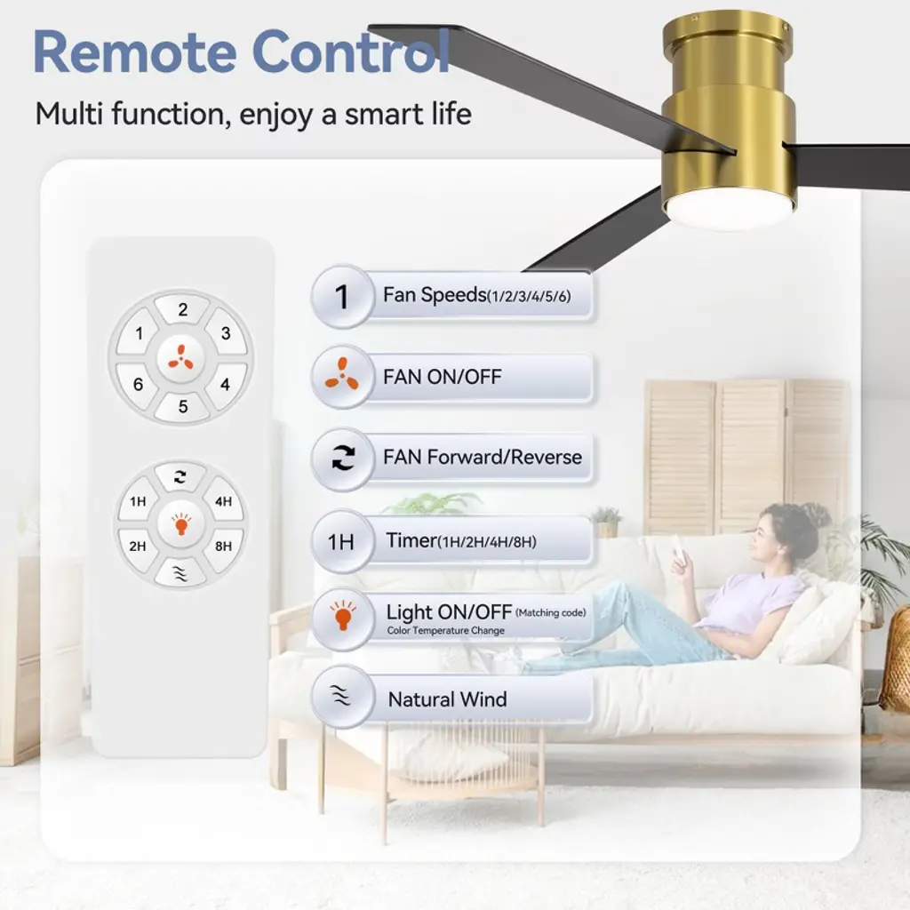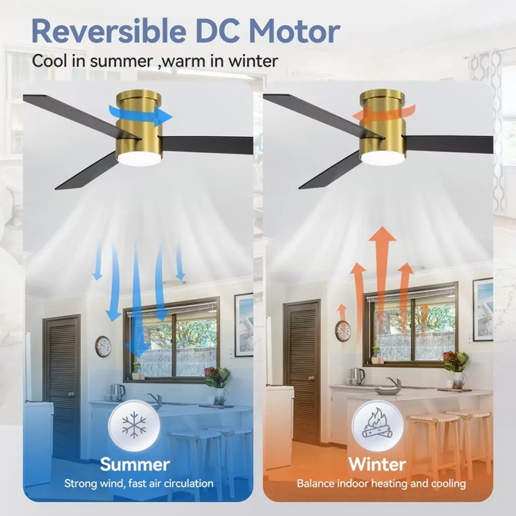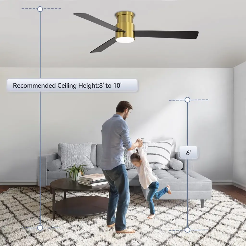 Airsurfer 52" Flush Mount Ceiling Fan With Dimmable Led Light, Reversible Quiet Motor, 3 Blades, Remote Control Included