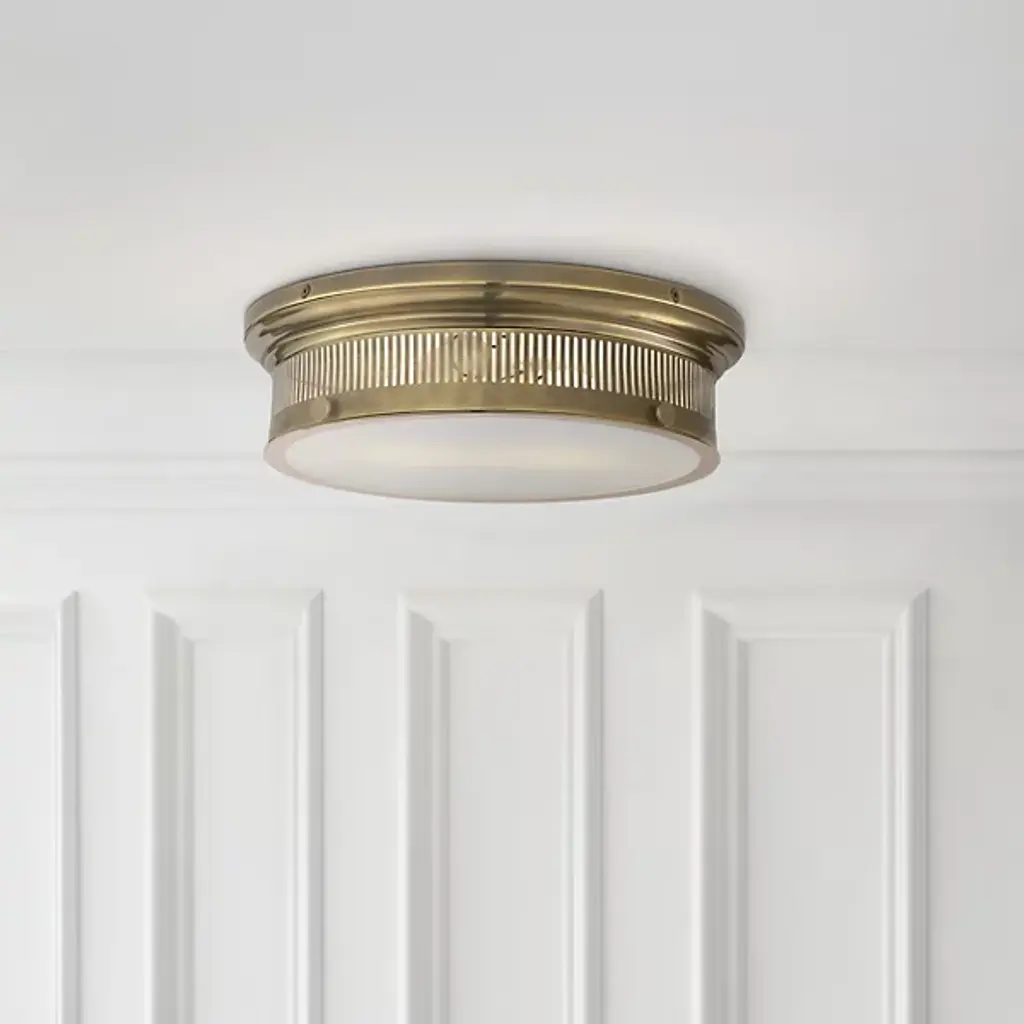 With its distinct industrial personality, the Alderly Flushmount by Visual Comfort Signature, formerly known as Visual Comfort, can liven both contemporary and traditional settings. Its vented framework (with knobbed accents) is both stylish and functional, housing a pair of internal lamps while simultaneously dissipating their heat. A flat White glass shade caps the base of the fixture, diffusing light evenly for a warm, pleasant ambiance.