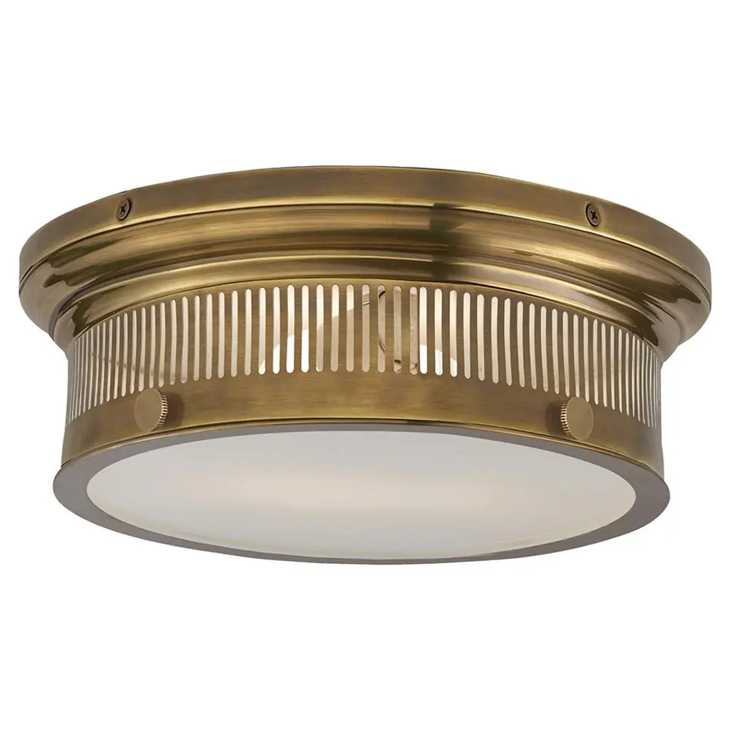 With its distinct industrial personality, the Alderly Flushmount by Visual Comfort Signature, formerly known as Visual Comfort, can liven both contemporary and traditional settings. Its vented framework (with knobbed accents) is both stylish and functional, housing a pair of internal lamps while simultaneously dissipating their heat. A flat White glass shade caps the base of the fixture, diffusing light evenly for a warm, pleasant ambiance.