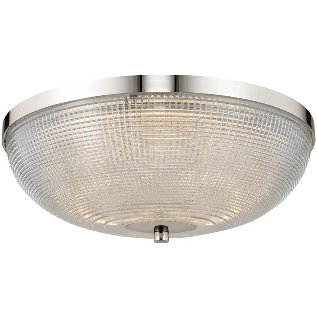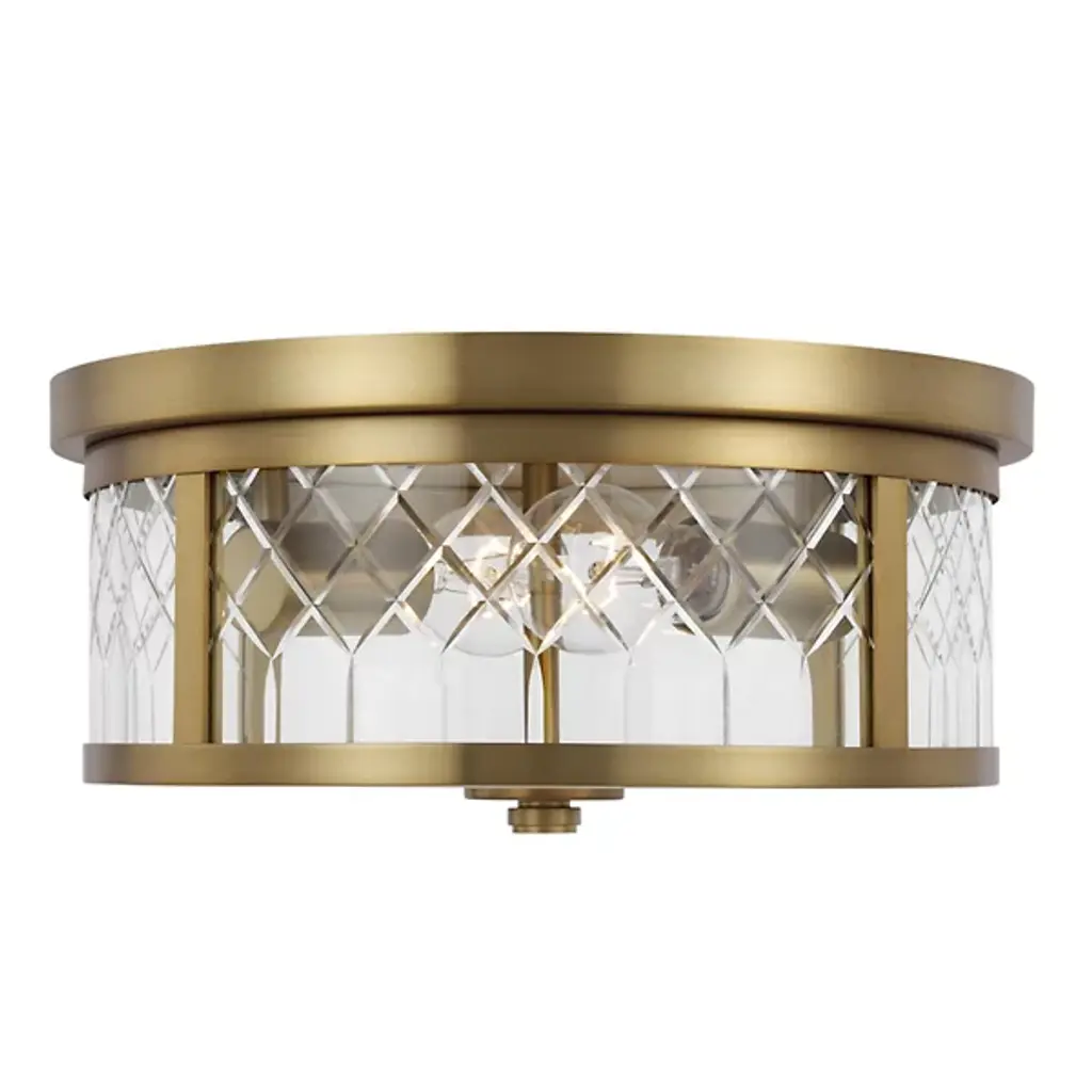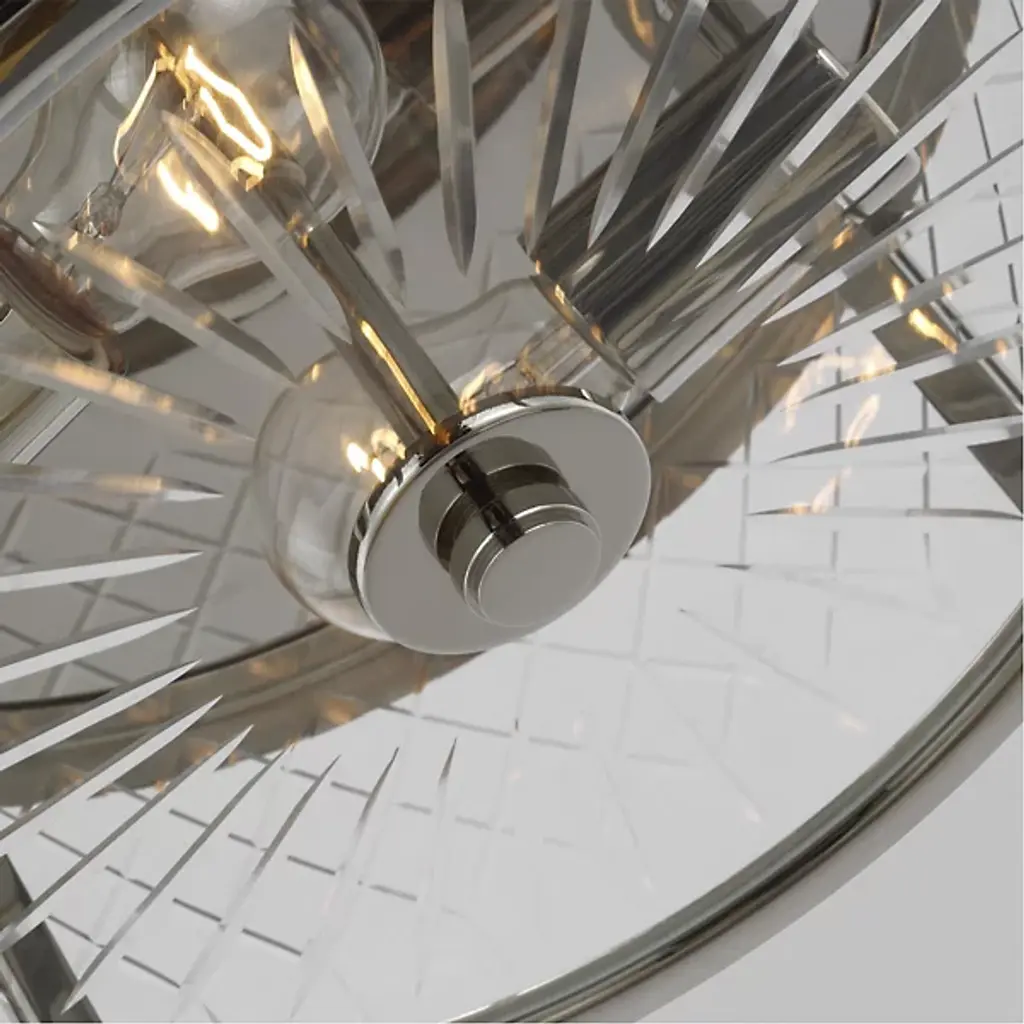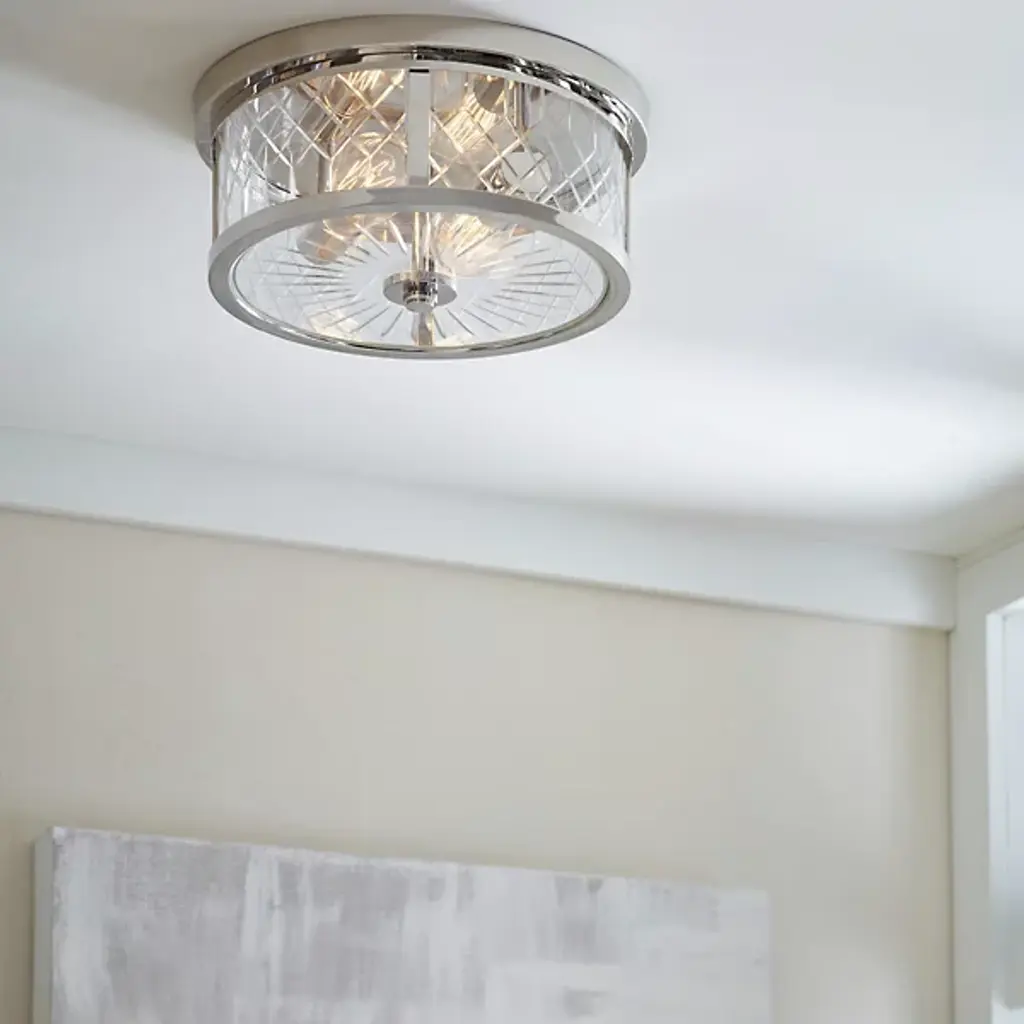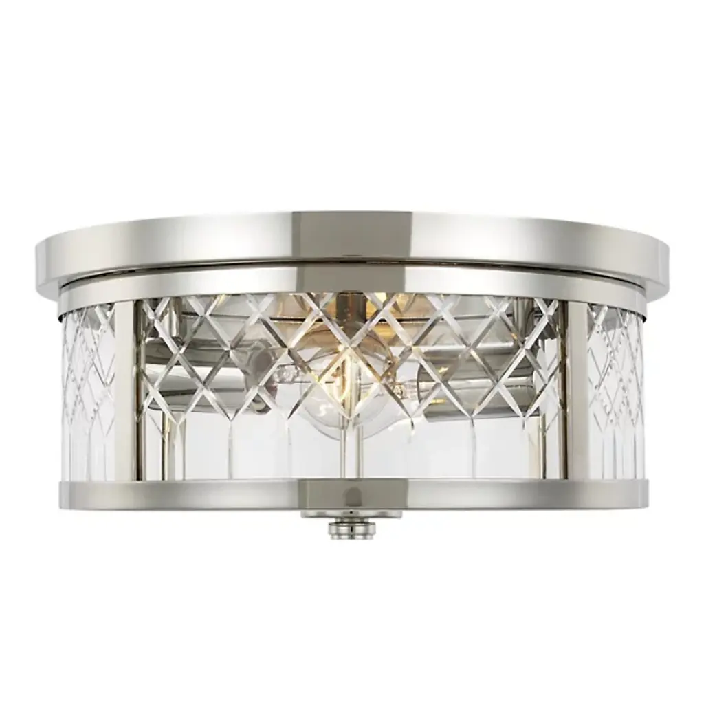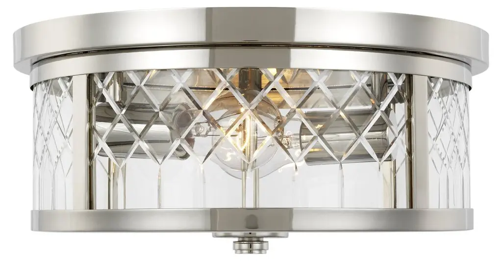 Bring a touch of glamour to your home with the Alec Flushmount from Visual Comfort Studio, formerly known as AH by Alexa Hampton, A rounded canopy and frame constructed from smooth steel supports a clear glass shade adorned with cut crystal detailing, alluding to Art Deco style. Two incandescent bulbs nestled behind the glass shade emit a warm and welcoming light, elegantly glistening across the textural glass and bathing a room with a delightful glow. Suitable for damp spaces, this flushmount brings life to any room in the house.