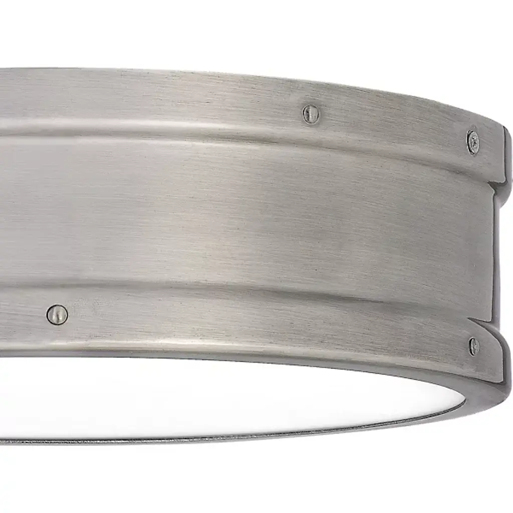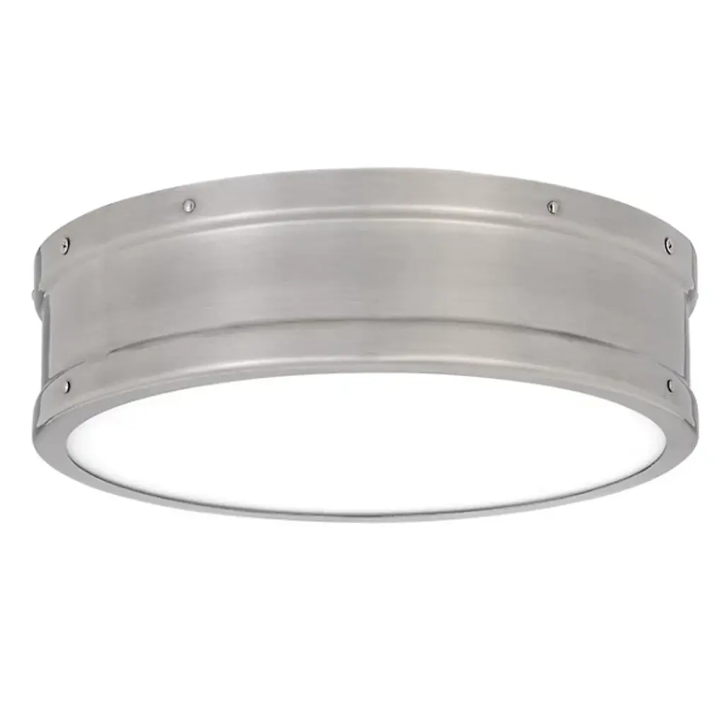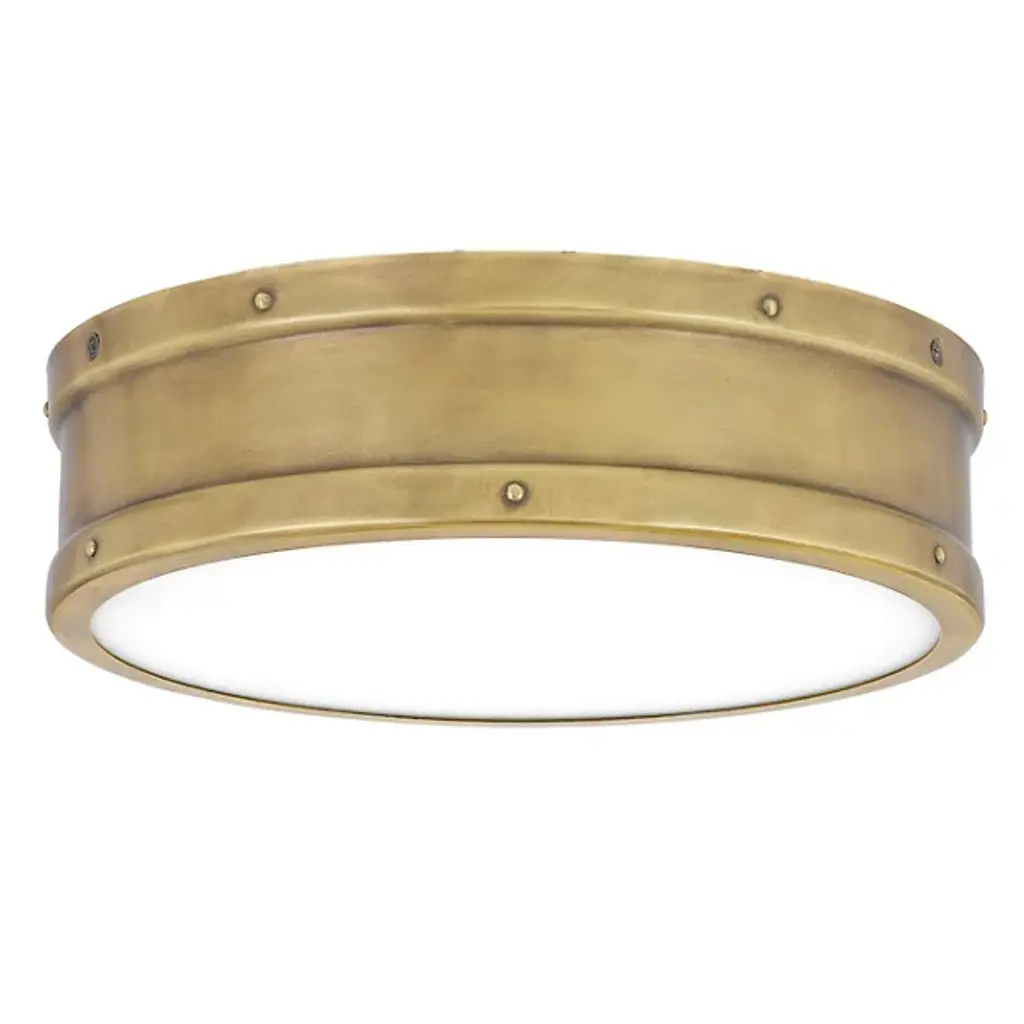 The Allegria LED Flush Mount Ceiling Light from Huxe adds a tasteful retro note to any indoor area. A circular canopy holds an integrated LED within a riveted metal shade, focusing the lamping down through an etched diffuser that gentles its direct glare into a pleasant, wide-reaching glow. The fixture is simple enough to work well with a variety of décor styles while still providing a practical pool of light.
