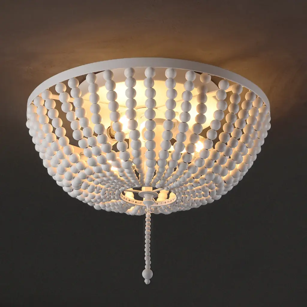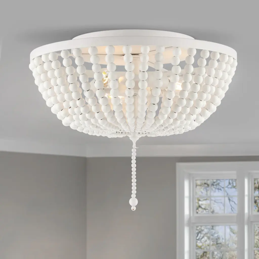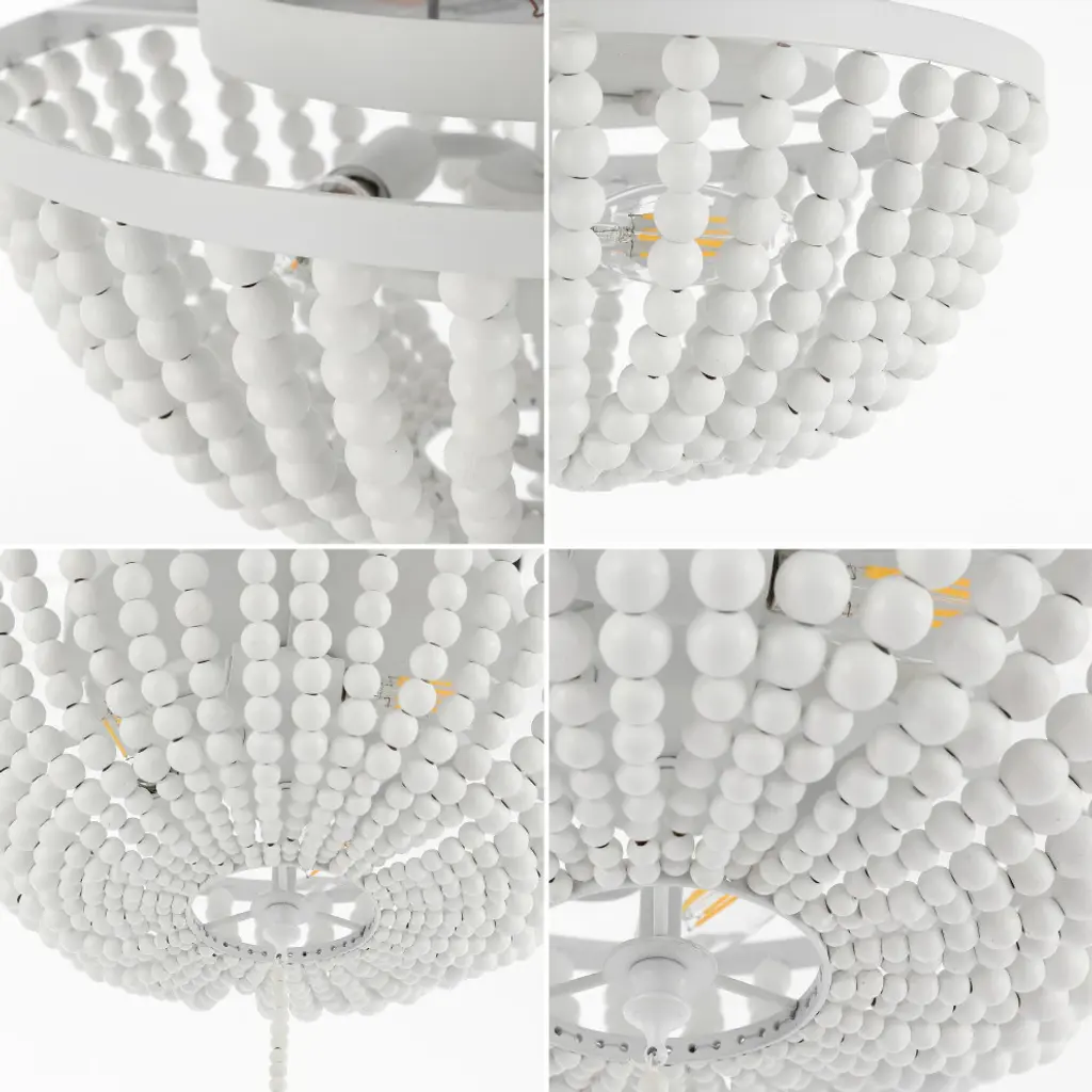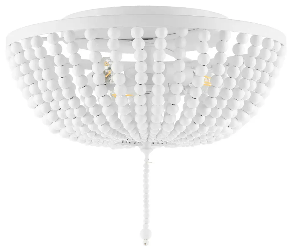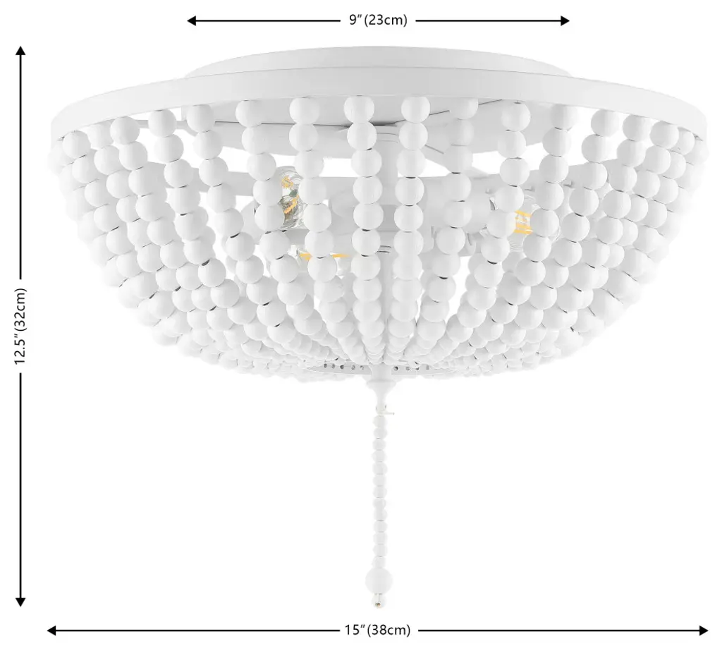 This light fixture has the appeal of a vintage found piece, with neutral-toned wood beads and a white finish on the metal accents. Designers often say lighting is "the jewelry of the home" and this piece is a statement necklace. We love finding flush mounts that make such a large style statement, with only 12.5" of drop -- perfect for any ceiling height!-A flush mount with serious style: neutral-toned wood beads and a glam white finish accentuate this beaded fixture-Takes three bulbs and compatible with any 9W LED or 40W Type "B" or 13W CFL-Eco-friendly 4W LED bulb included-As this fixture must be hardwired, we recommend a professional electrician manage installation-UL Listed-Color Temperature: 2700K-CRI: 80-Color: White-Body Material: Metal/Wood-Finial Material: No Finial-Finial Color: No Finial-Includes: One (1) lamp-Assembly Required-Lamp: 12.5 inches high x 15 inches wide x 15 inches deepYou see a lamp.We see a decorative work of art.A perfectly curved shade casts a dramatic shadow on a floor. Compatible with LED lightbulbs: as easy on the environment as they are on the eyes. The JONATHAN Y Lighting collection considers every detail from impeccably sourced materials to designer styling. And our prices are so attractive, we"™ve transformed a functional necessity into a fashion accessory.JONATHAN Y Lighting - a fashion revolution in home decor.