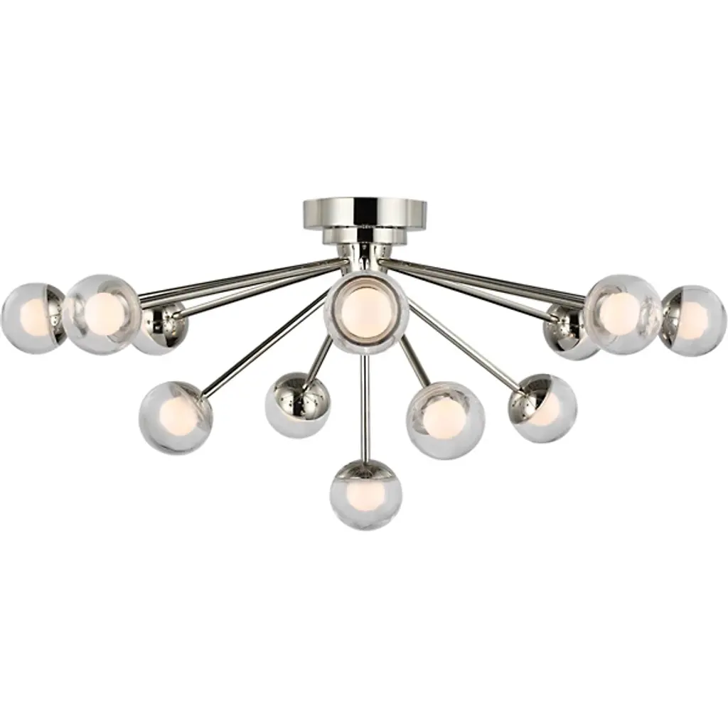 Add an appealing modern presence to inside ceiling spaces with the open, appealing character of the Alloway LED Flushmount from Visual Comfort Signature, formerly known as Visual Comfort, An elegant, appealing fixture that hearkens back to mid-century design, it uses a stepped, circular canopy and conical accent to extend a series of slender arms outward at a downward angle. Each arm ends in a dish-shaped wall plate that seats a clear-glass spherical shade around damp-listed lamping, creating a Sputnik-style silhouette that scatters a bright, even glow in all directions.