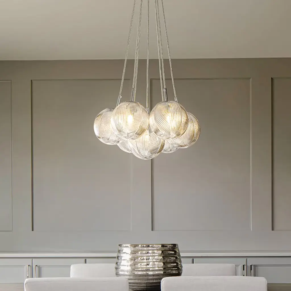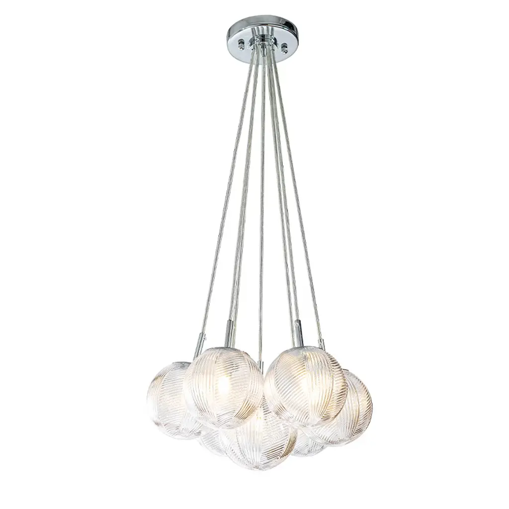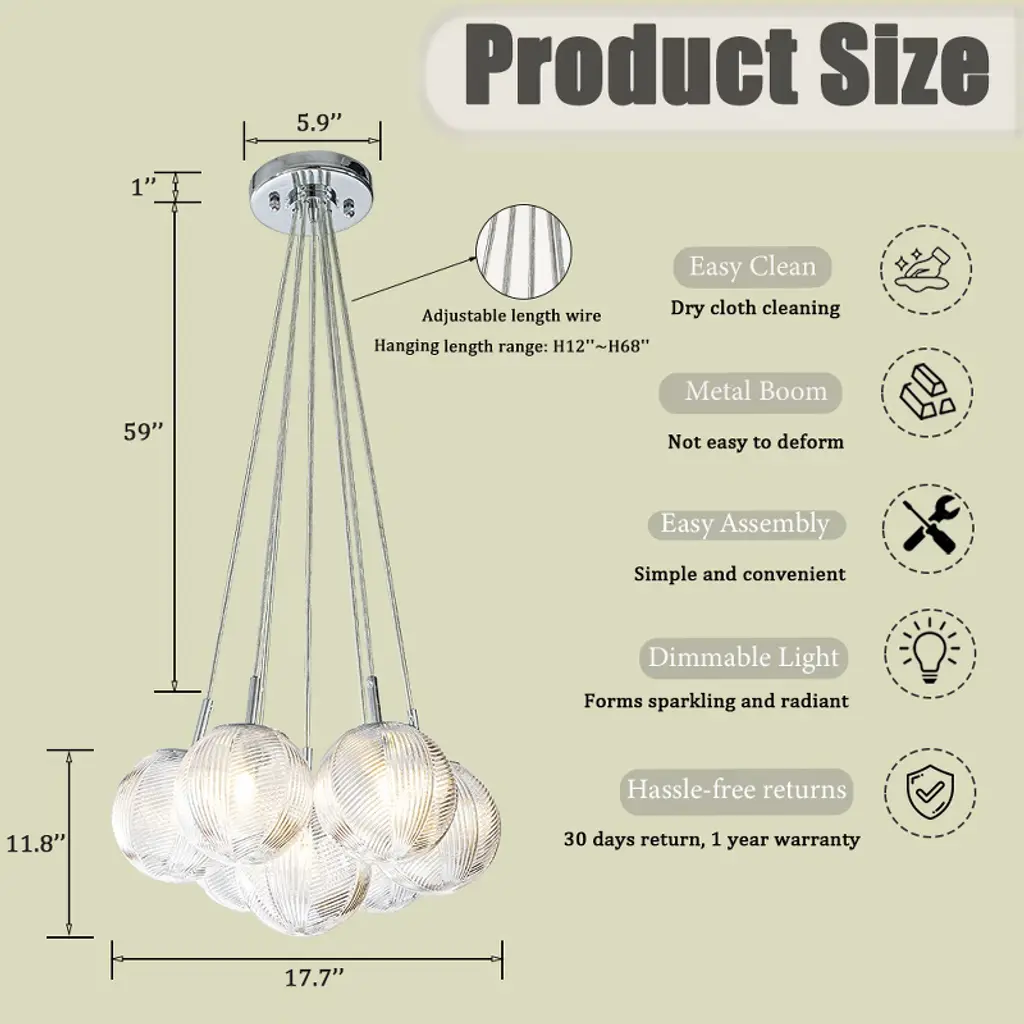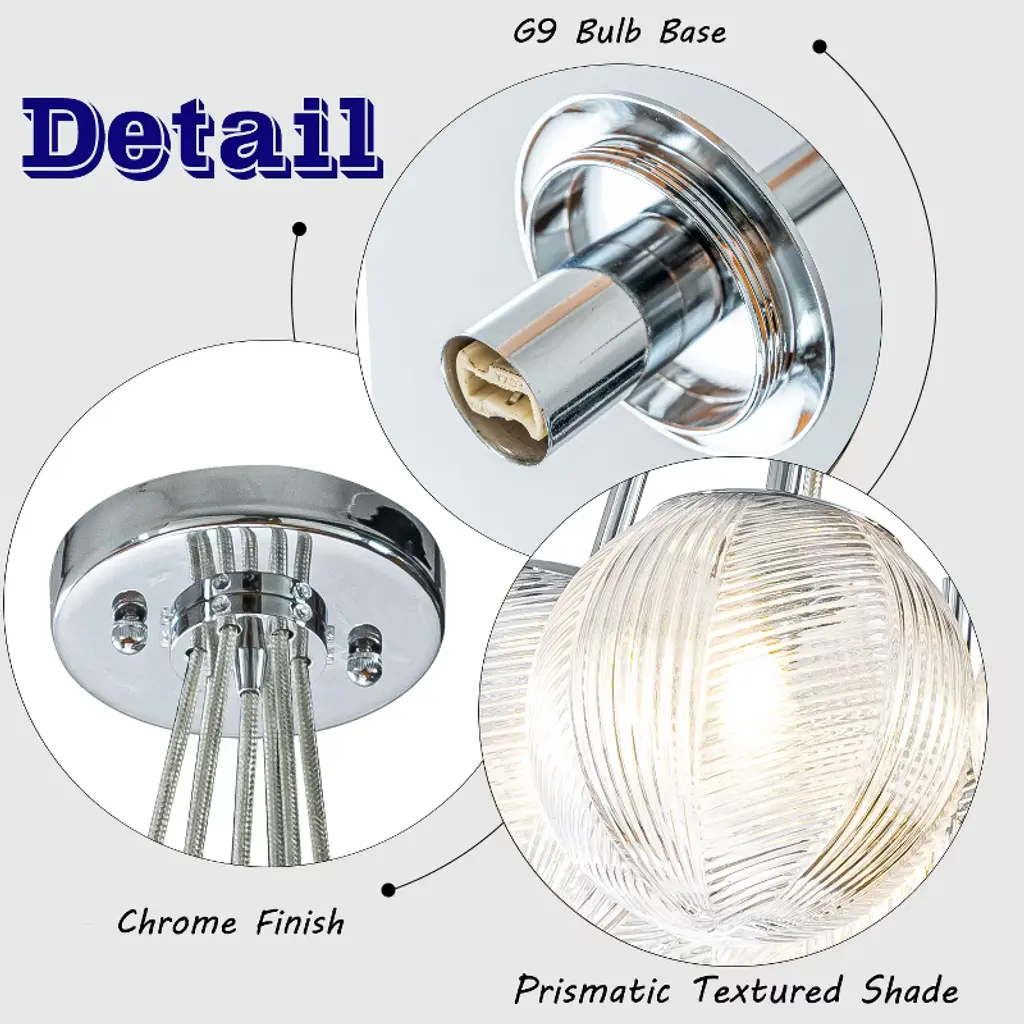 This captivating 7-light cluster chandelier adds a touch of modern elegance to any space. Designed with a polished chrome ceiling plate, adjustable cables, and beautifully ribbed glass globe shades, it delivers a stunning blend of style and sophistication, perfect for both contemporary and transitional interiors. Easily customizable to match your style, the pendant allows you to adjust the hanging height during installation. Create a dramatic cascading effect or keep the globes aligned for a sleek, uniform look. Its versatile design makes it ideal for dining rooms, kitchens, foyers, bathrooms, and stairwells, serving as a striking focal point wherever it's placed. Crafted with seven G9 bulb holders (bulbs not included), this chandelier is dimmable when paired with a compatible dimmer switch, allowing you to set the perfect ambiance for any occasion. Whether you're making a statement over a dining table, illuminating a kitchen island, or adding a warm glow to stairwells and entryways, this fixture brings both elegance and charm to your home decor.
