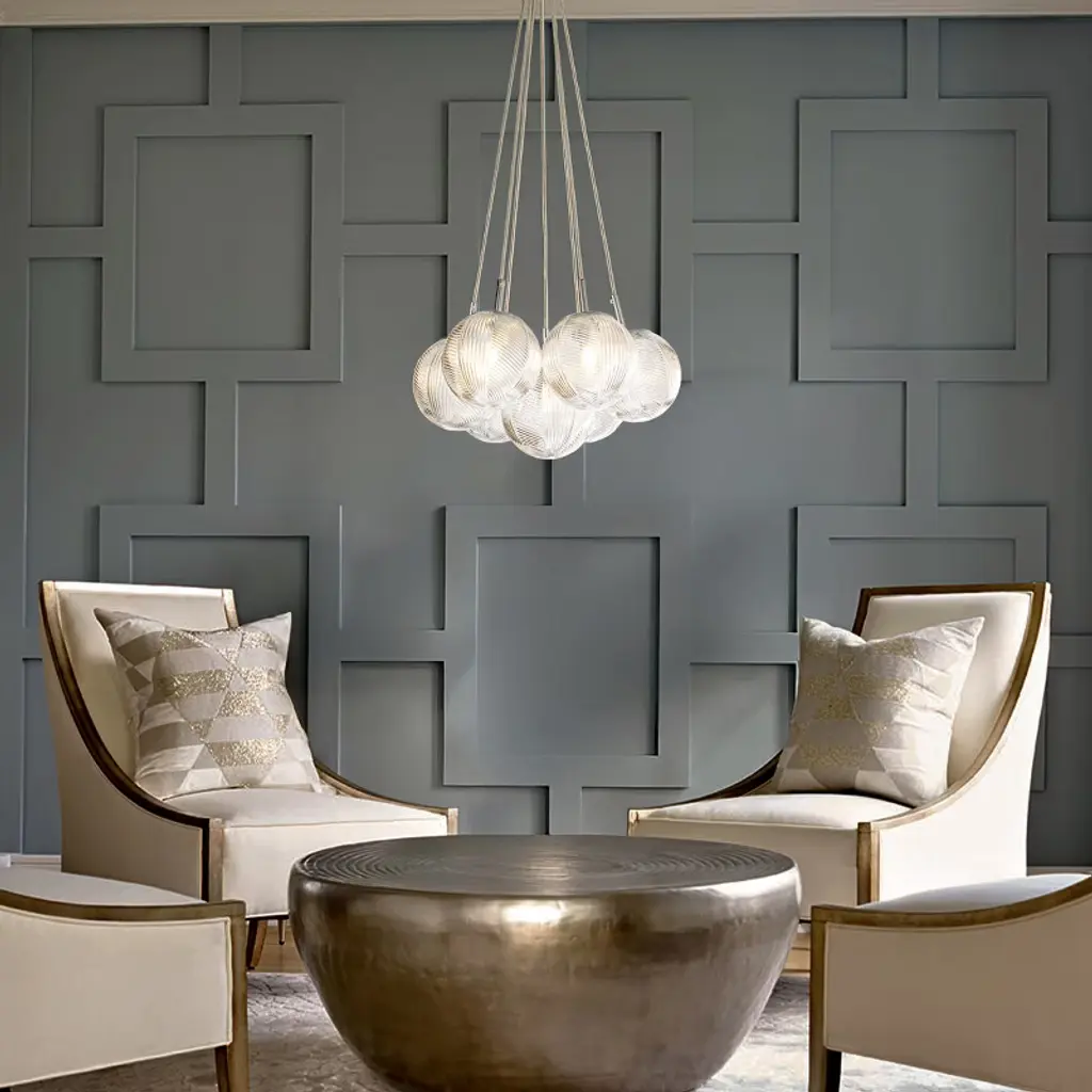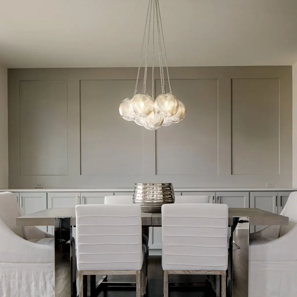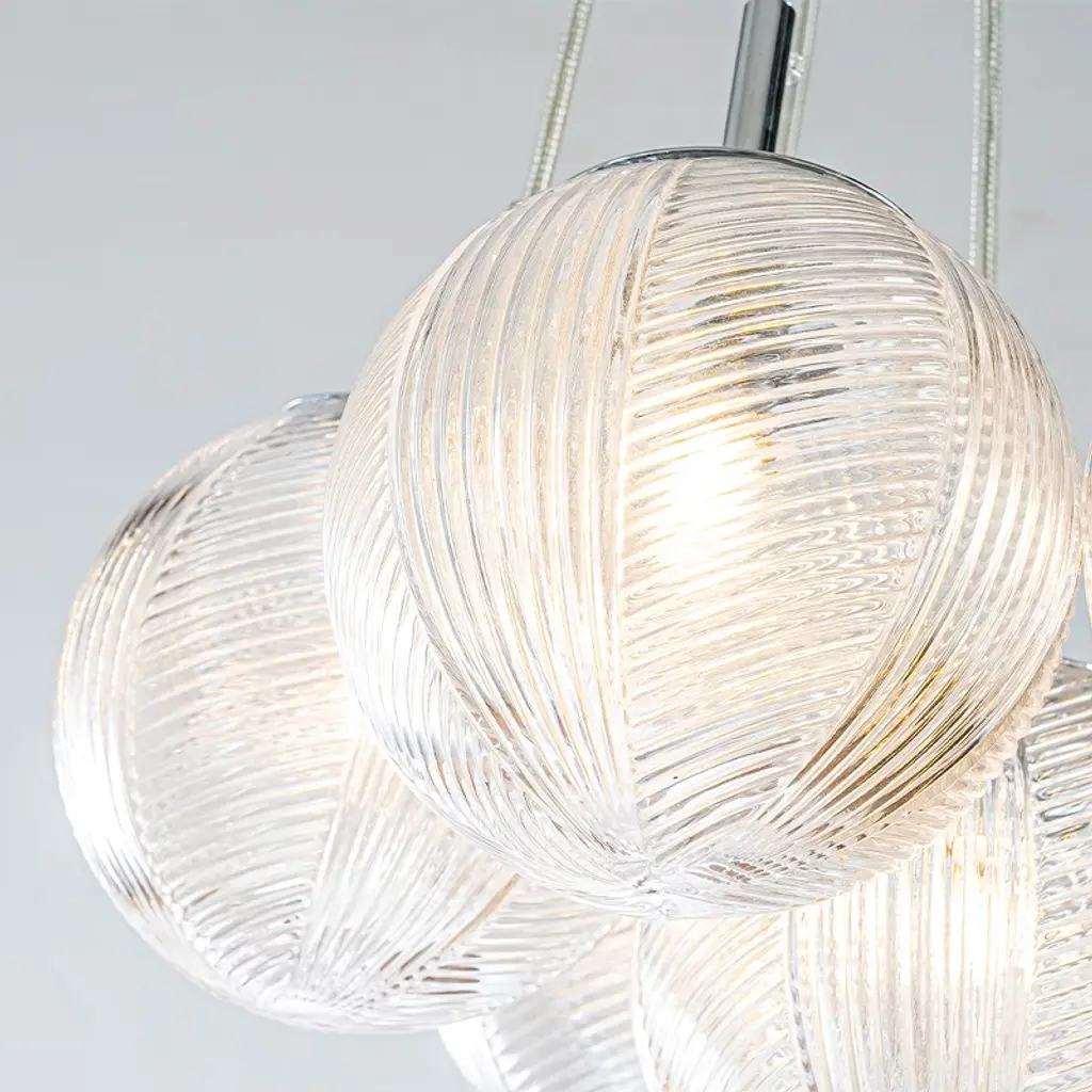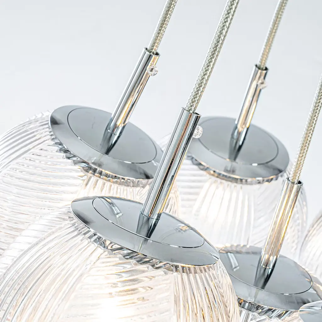 This captivating 7-light cluster chandelier adds a touch of modern elegance to any space. Designed with a polished chrome ceiling plate, adjustable cables, and beautifully ribbed glass globe shades, it delivers a stunning blend of style and sophistication, perfect for both contemporary and transitional interiors. Easily customizable to match your style, the pendant allows you to adjust the hanging height during installation. Create a dramatic cascading effect or keep the globes aligned for a sleek, uniform look. Its versatile design makes it ideal for dining rooms, kitchens, foyers, bathrooms, and stairwells, serving as a striking focal point wherever it's placed. Crafted with seven G9 bulb holders (bulbs not included), this chandelier is dimmable when paired with a compatible dimmer switch, allowing you to set the perfect ambiance for any occasion. Whether you're making a statement over a dining table, illuminating a kitchen island, or adding a warm glow to stairwells and entryways, this fixture brings both elegance and charm to your home decor.
