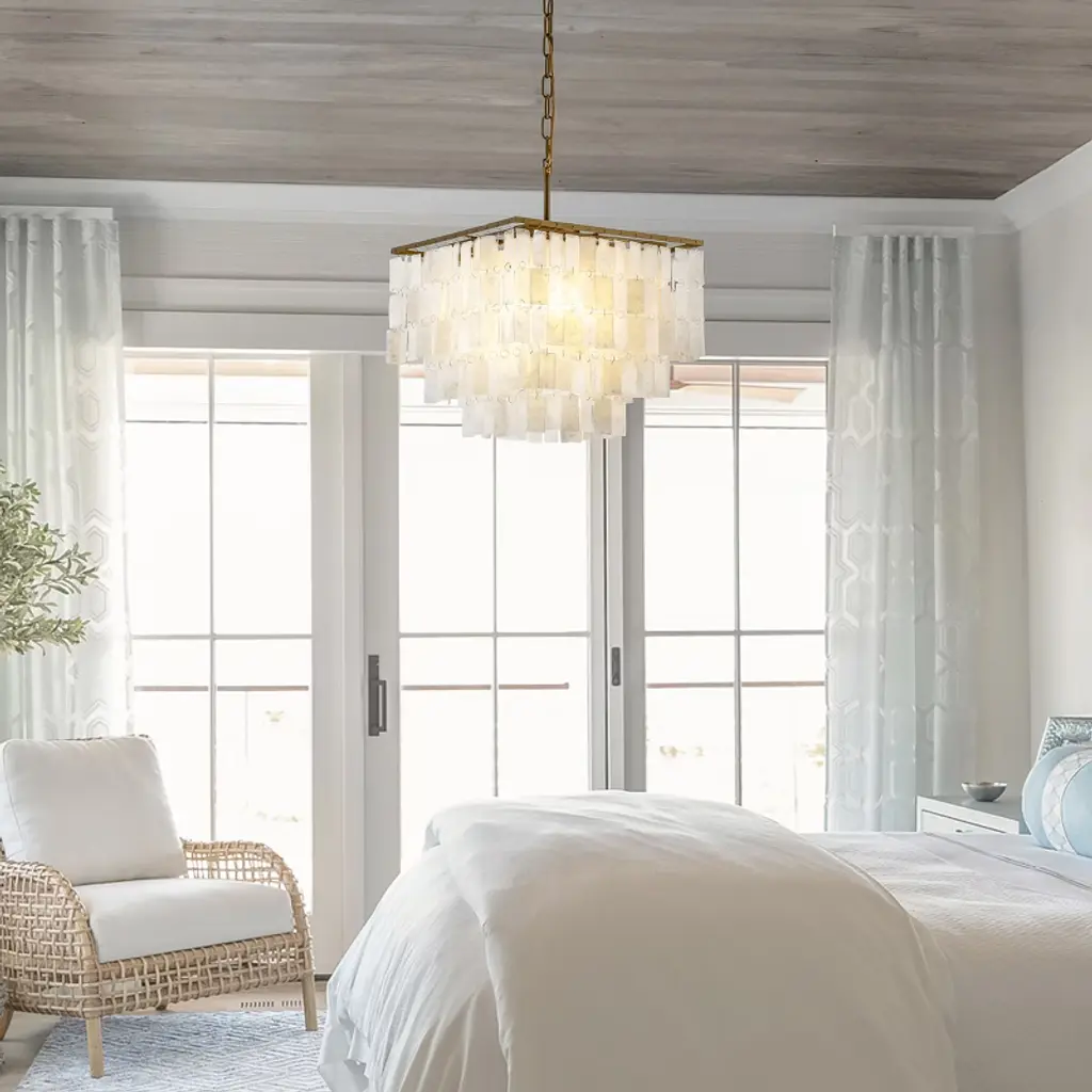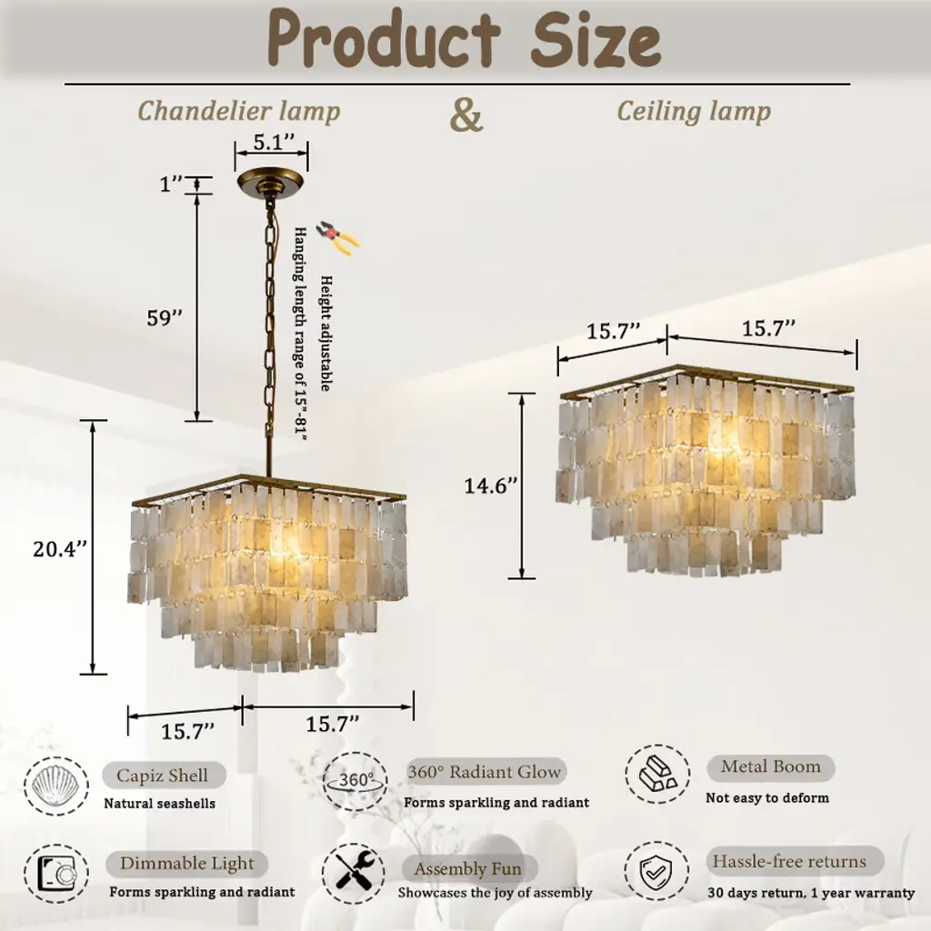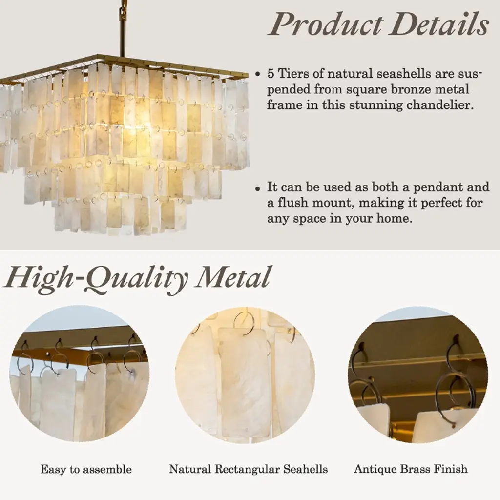 5 Tiers of natural seashells are suspended from square bronze metal frame in this stunning chandelier. The most notable feature is the shade, which consists of hundreds of natural rectangular seashell accents. Light up the room with this glam and traditional pendant light, emitting a soft, ambient glow, it will add a nice appearance and gorgeous illumination to your space. This timeless capiz shell tiered chandelier is also the perfect decoration for your bedroom or living room, it can be used as both a pendant and a flush mount, making it perfect for any space in your home.