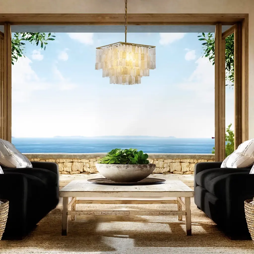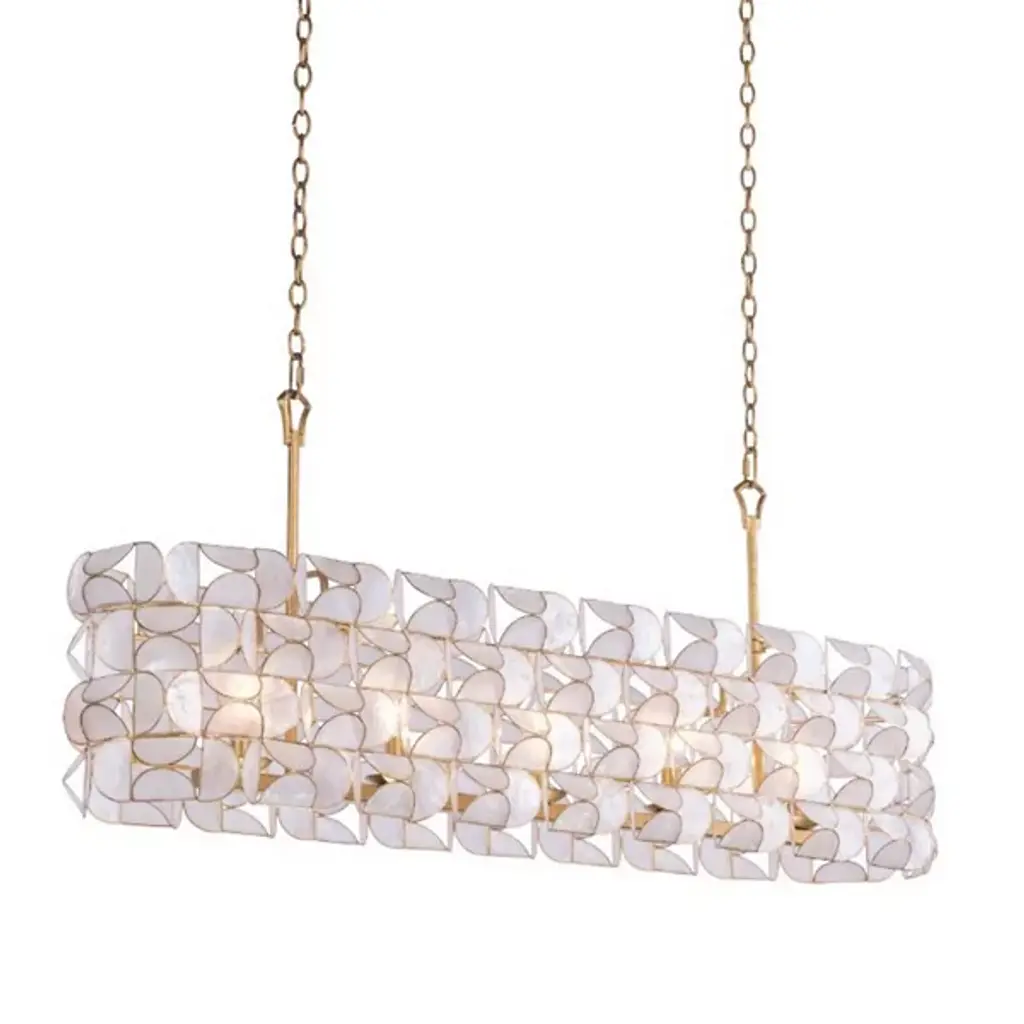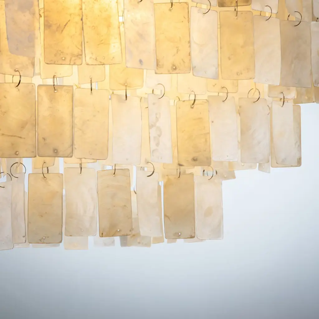 5 Tiers of natural seashells are suspended from square bronze metal frame in this stunning chandelier. The most notable feature is the shade, which consists of hundreds of natural rectangular seashell accents. Light up the room with this glam and traditional pendant light, emitting a soft, ambient glow, it will add a nice appearance and gorgeous illumination to your space. This timeless capiz shell tiered chandelier is also the perfect decoration for your bedroom or living room, it can be used as both a pendant and a flush mount, making it perfect for any space in your home.