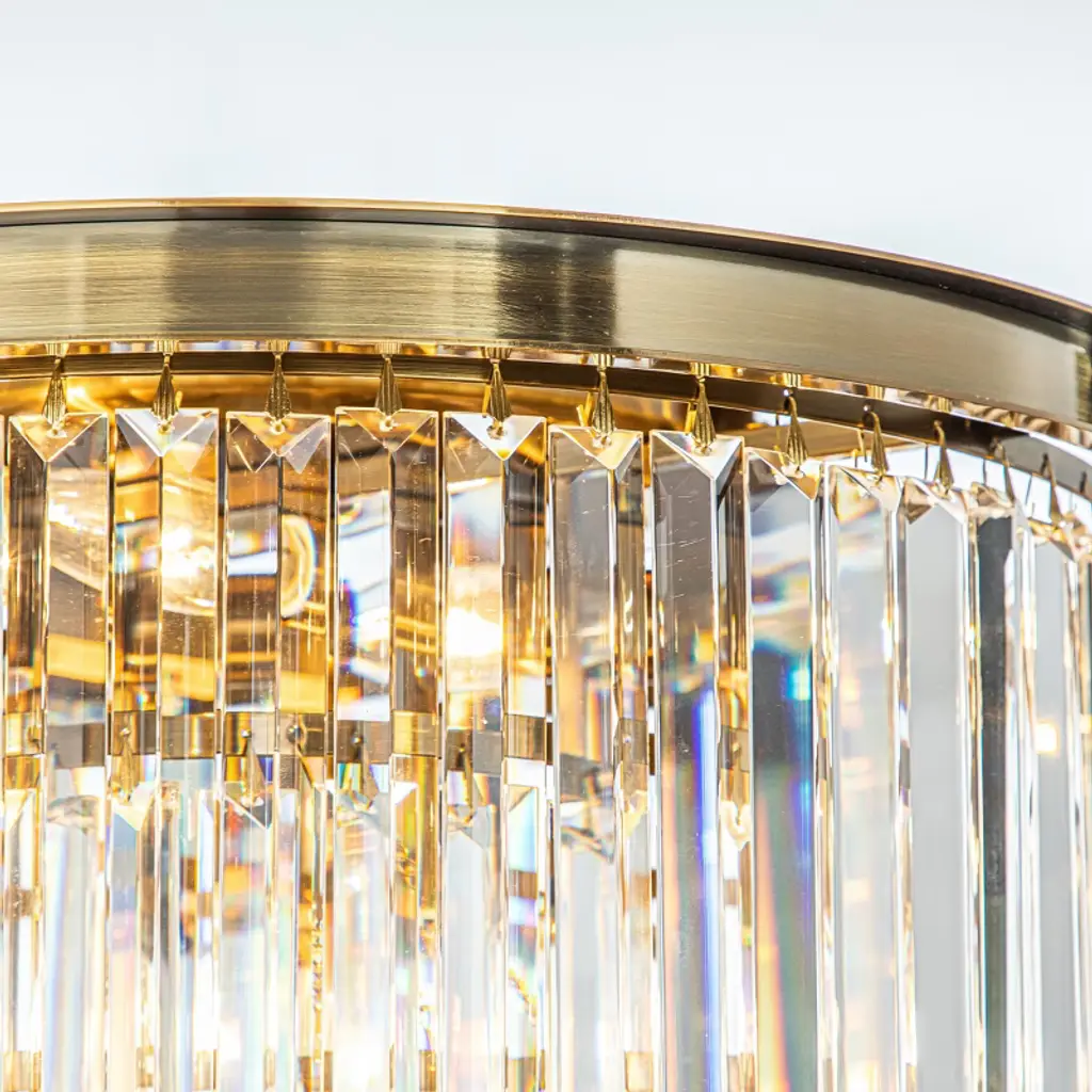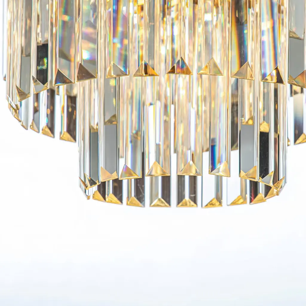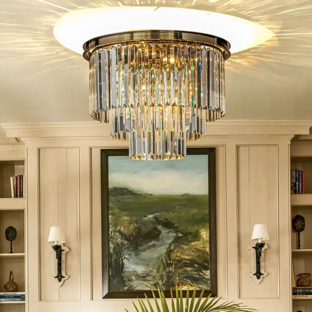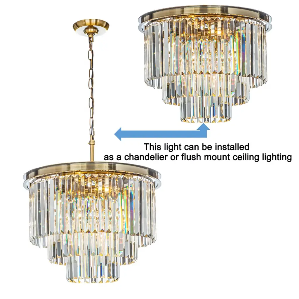 The tiered crystal flush mount is an elegant ceiling light with a contemporary look that will add mid-century modern decor style to your home. Its three tiers and six lights create plenty of warm, welcoming light. The sleek finish frame is strong and durable. The crystal hangs around the frame that forms a tapered shade, each crystal comes with a thick, triangular profile that delivers maximum refraction and reflection, enhancing its visual profoundness and artistry even further. And this light can be used as both a pendant and a flush mount, making it perfect for any room in your home. This chandelier is ideal for your foyer, living room, dining room, bedroom, hallway, or studio, both residential and commercial spaces.