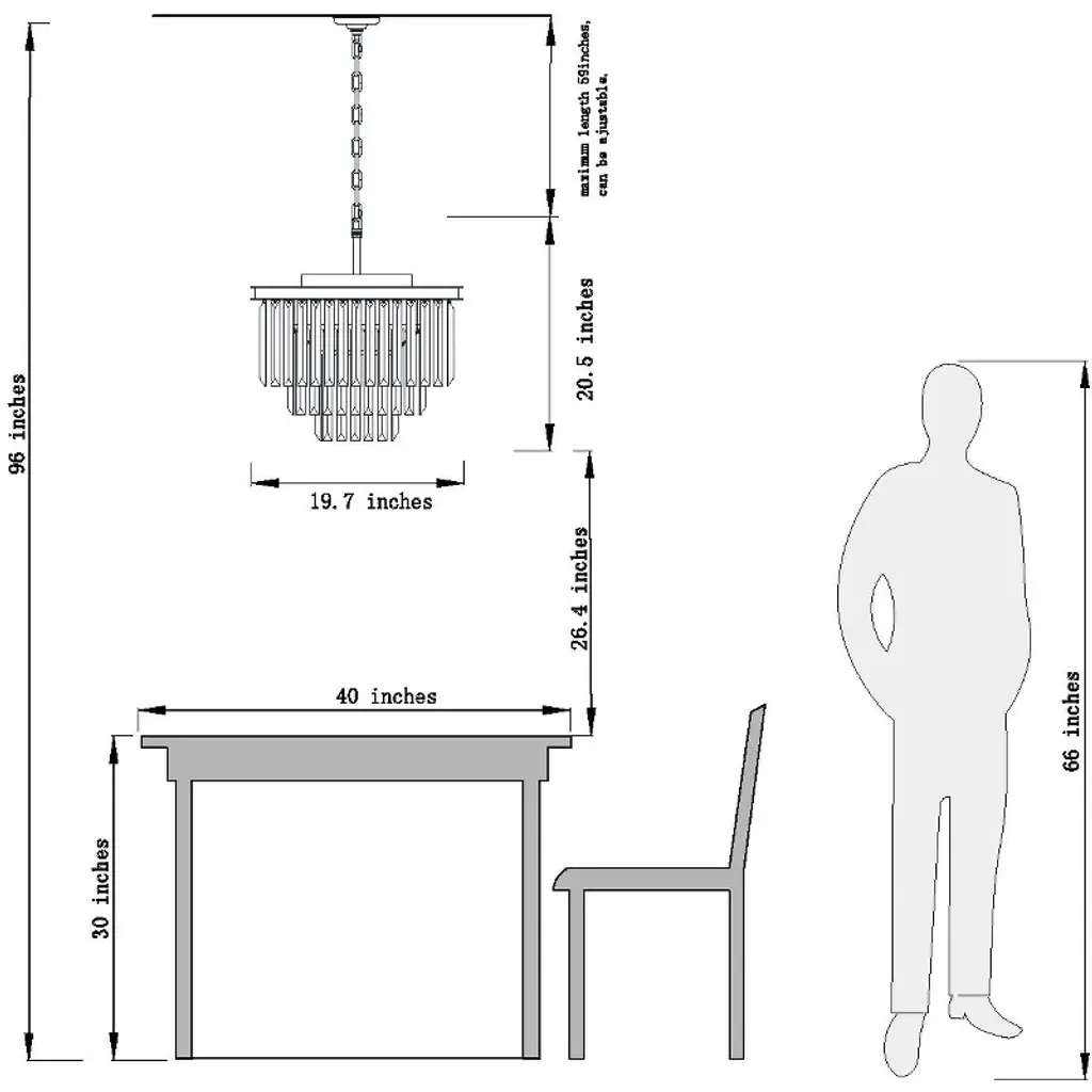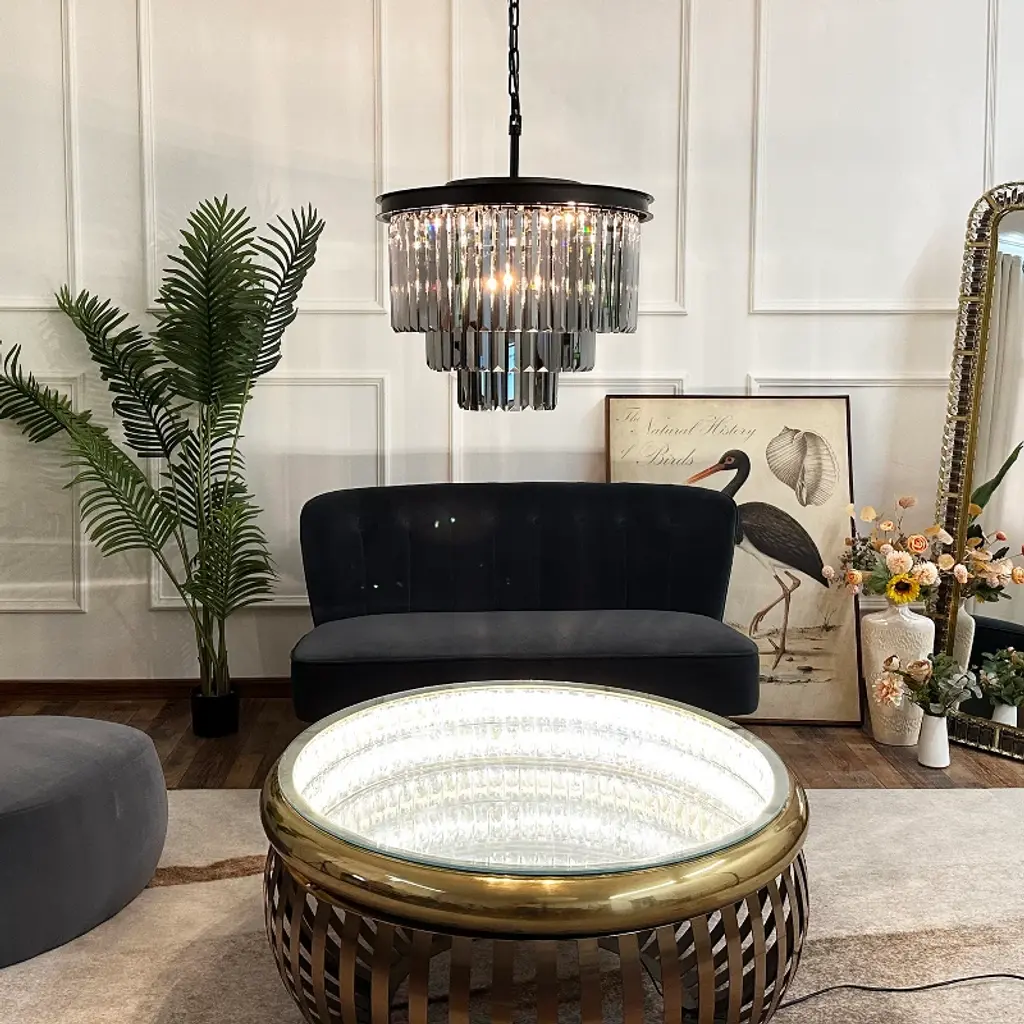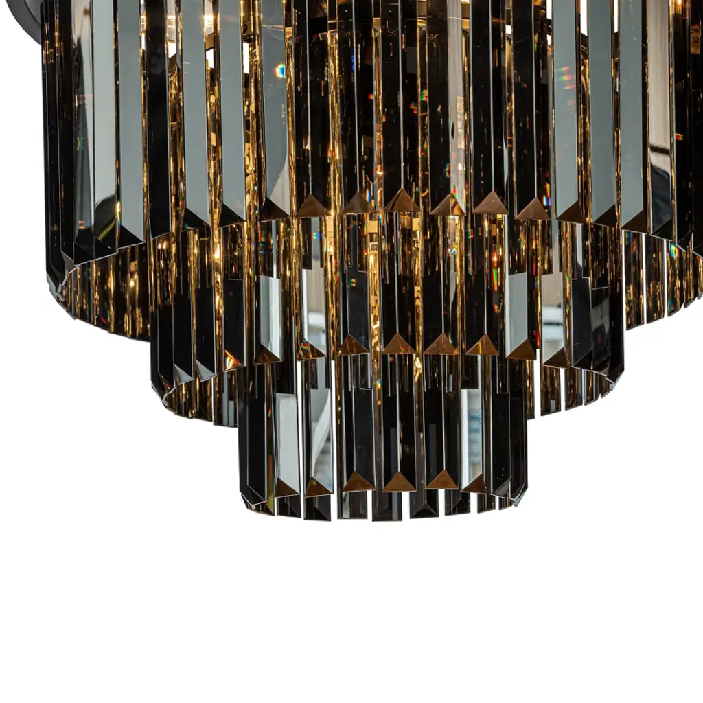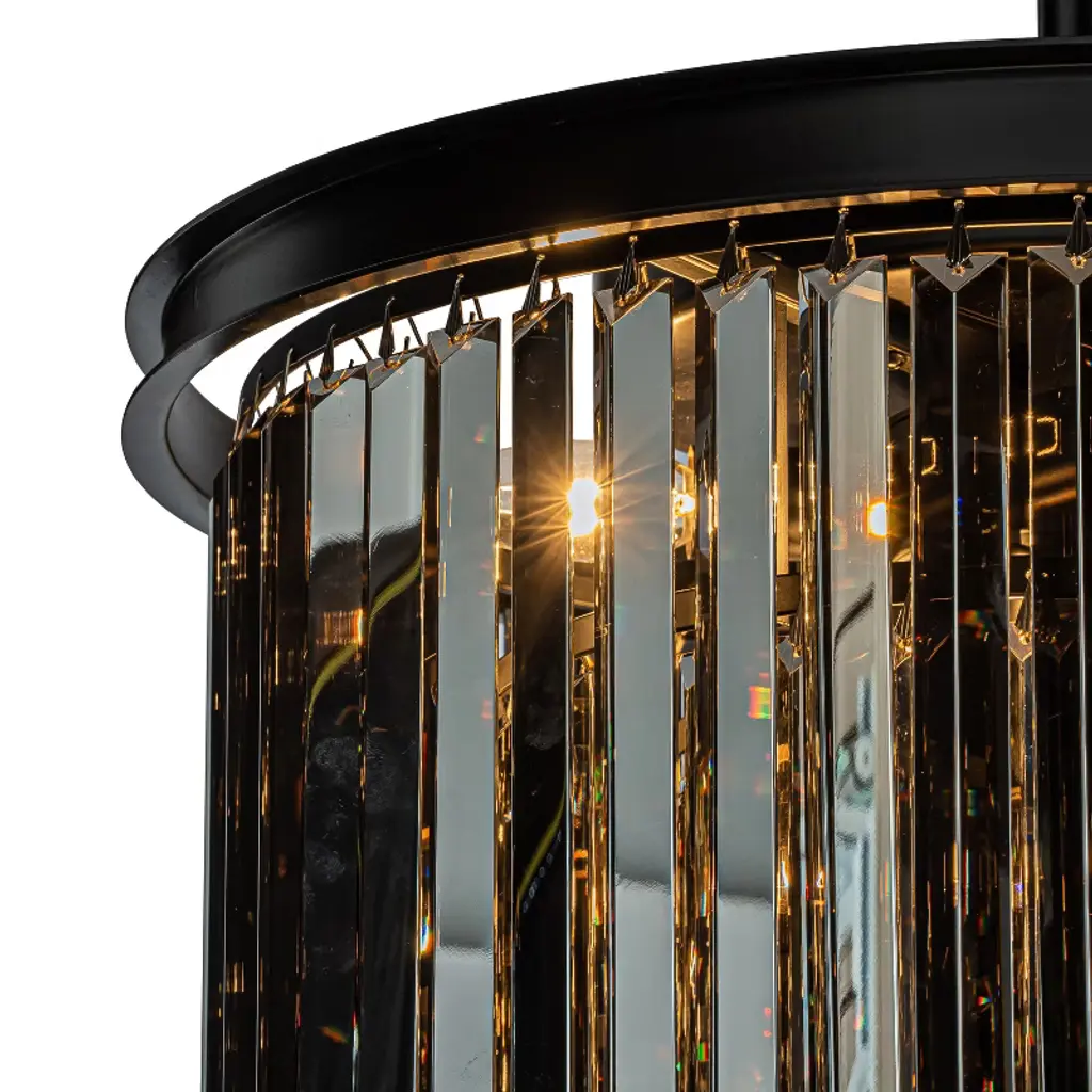 This odeon round crystal chandelier is an elegant pendant light with a contemporary look that will add mid-century modern decor style to your home. Its three tiers and six lights create plenty of warm, welcoming light. The matte black finish frame is strong and durable. The smoke crystal hangs around the frame that forms a tapered shade, each crystal comes with a thick, triangular profile that delivers maximum refraction and reflection, enhancing its visual profoundness and artistry even further. And this light can be used as both a pendant and a flush mount, making it perfect for any room in your home. This chandelier is ideal for your foyer, living room, dining room, bedroom, hallway, or studio, both residential and commercial spaces.