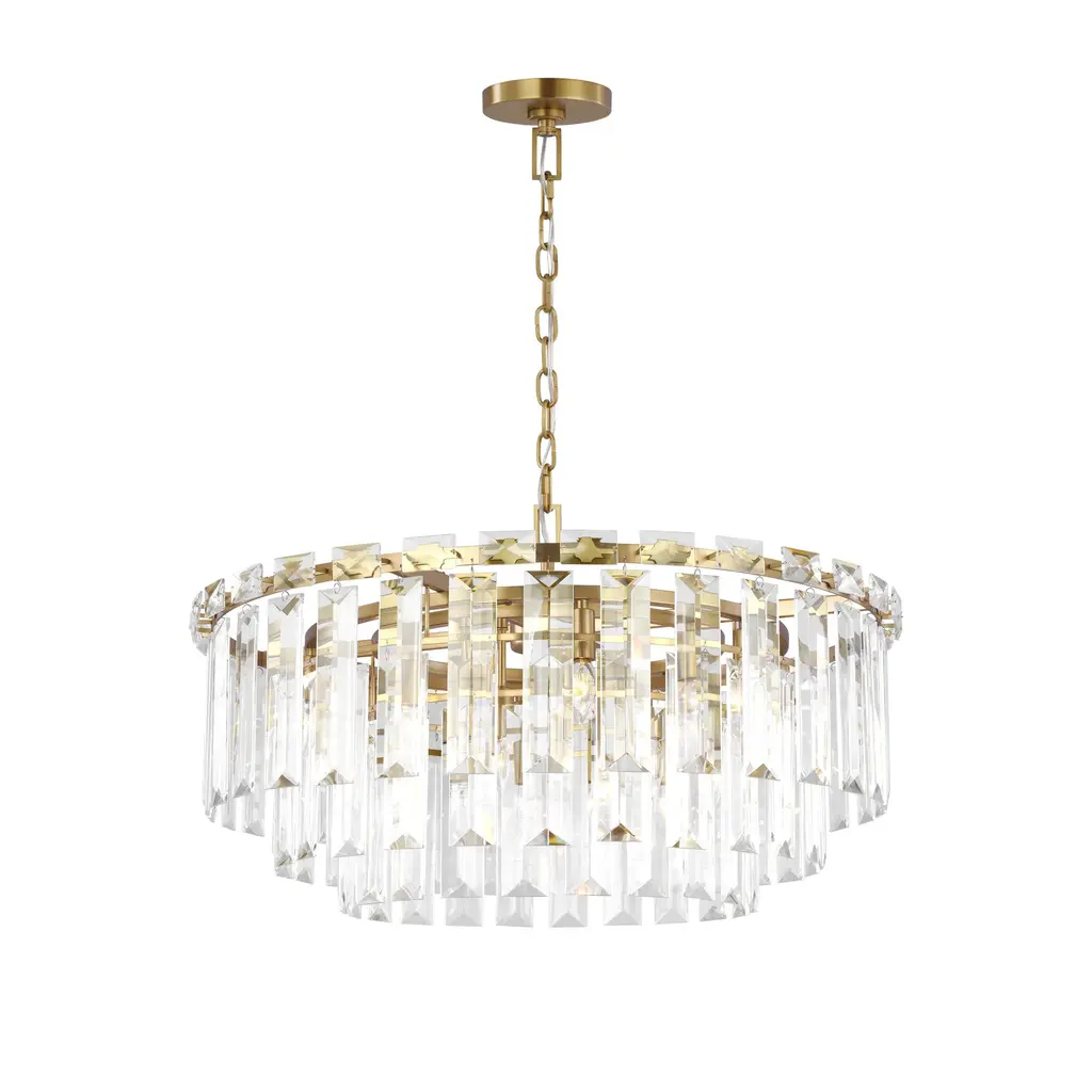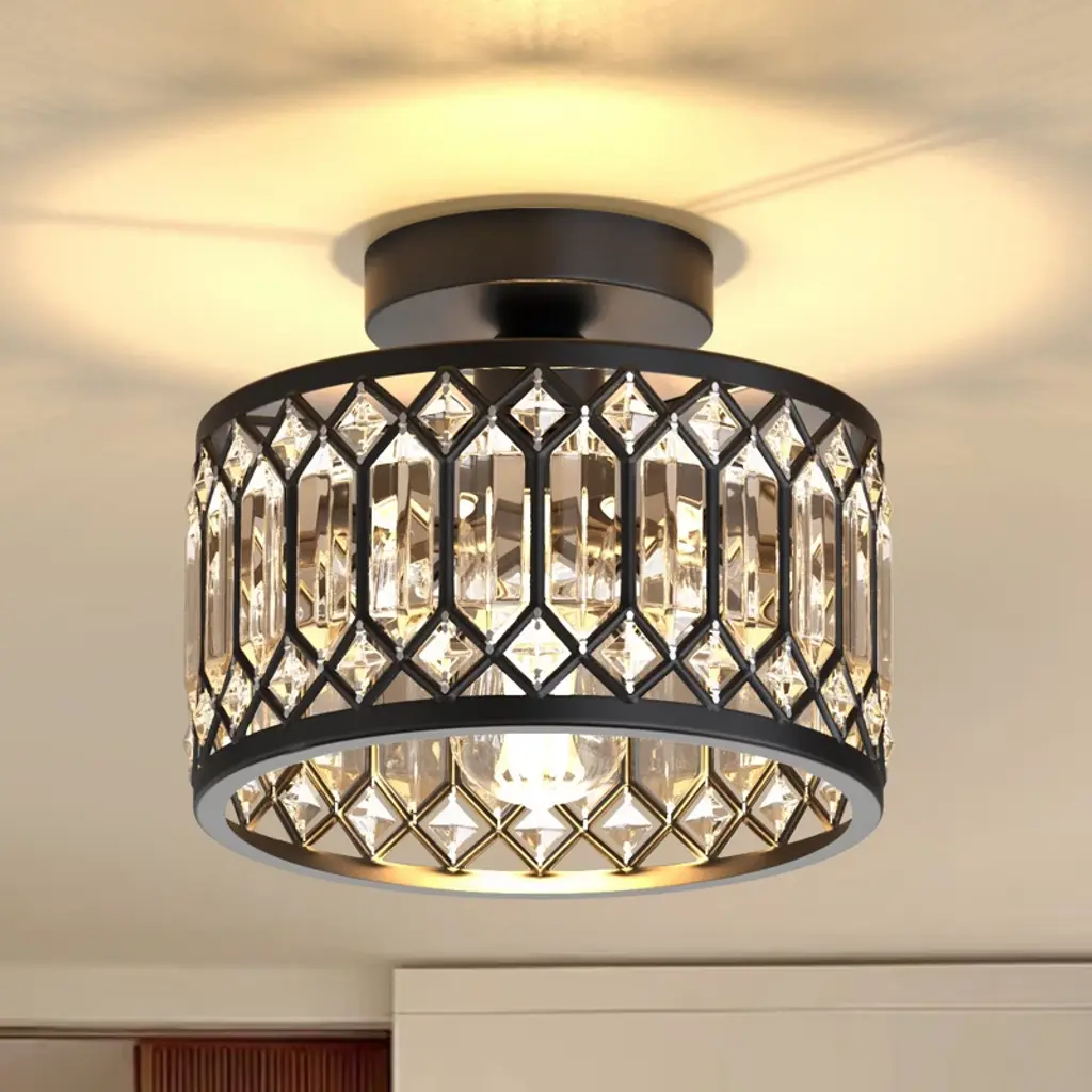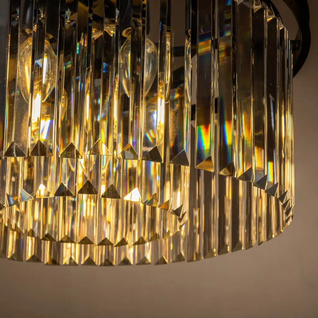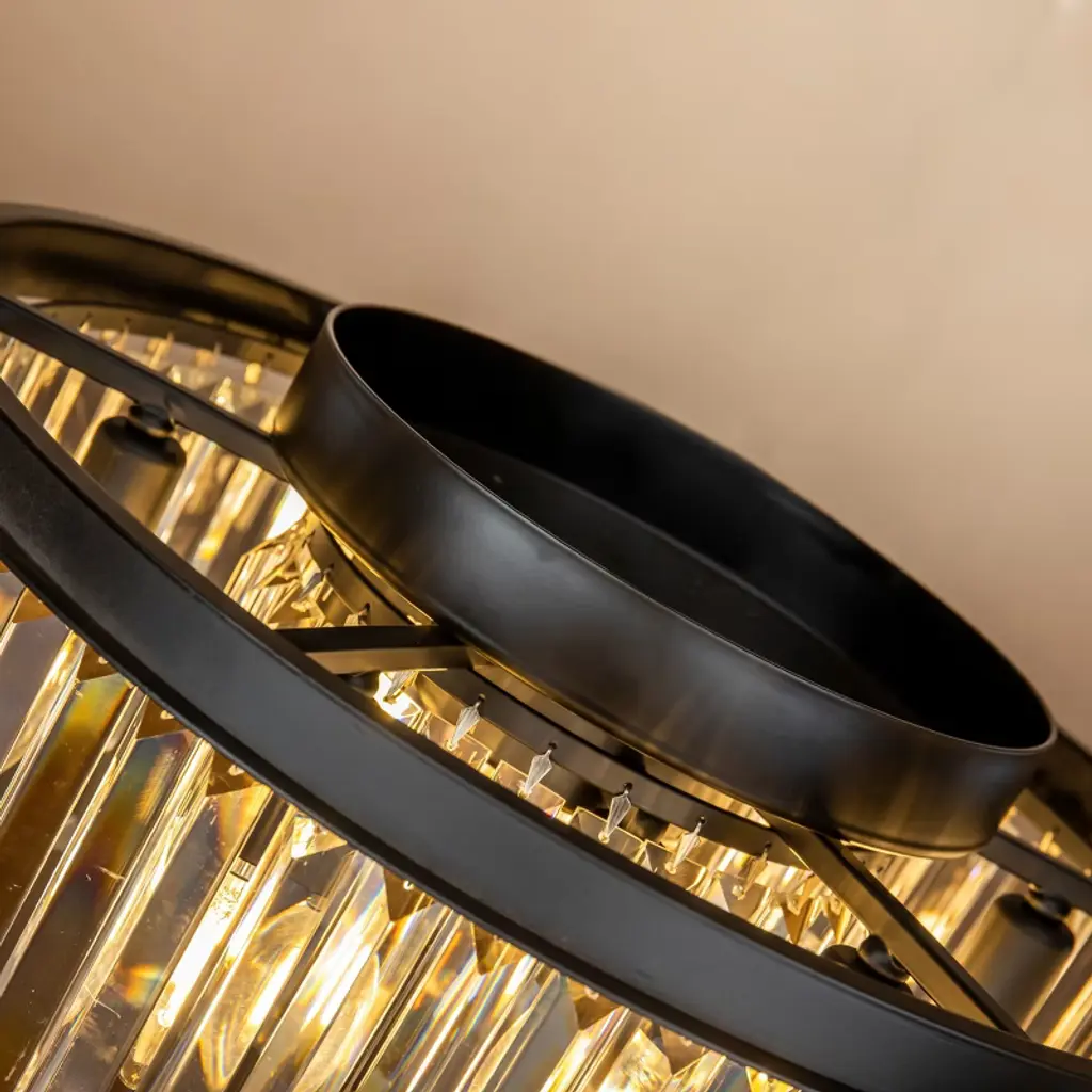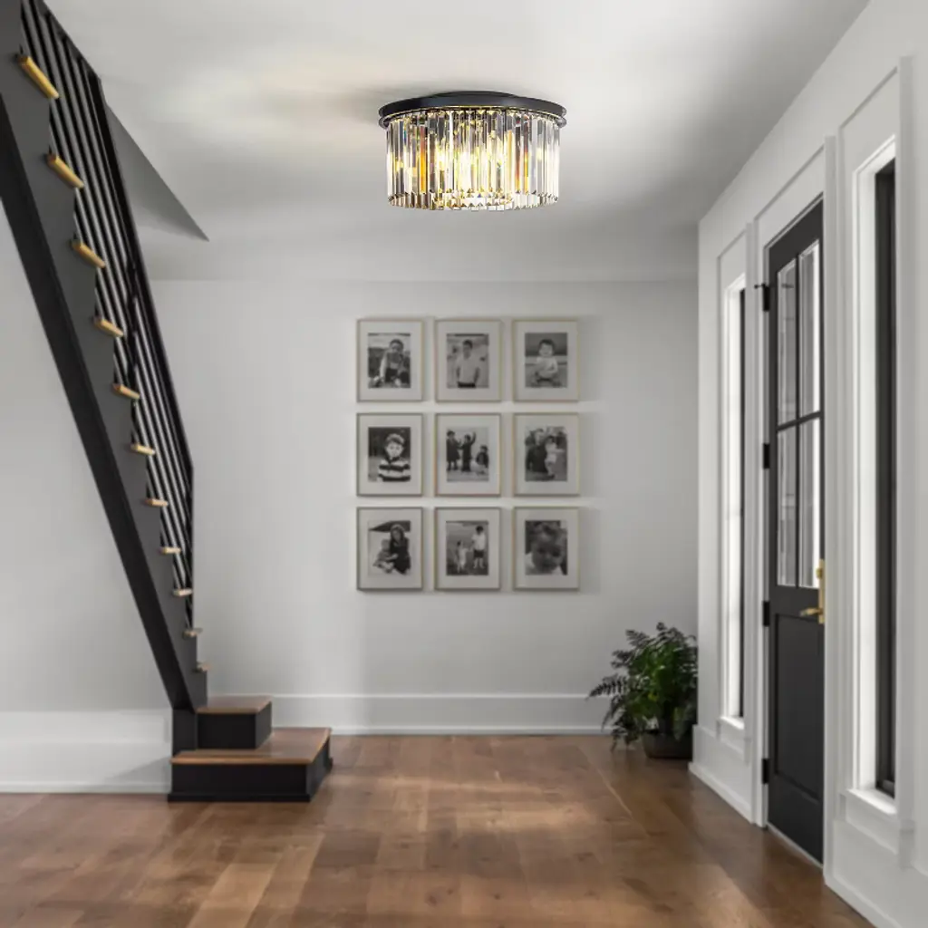 Enhance your home with the timeless elegance of this odeon round crystal flush mount. Designed with a contemporary flair, it effortlessly brings mid-century modern decor style to any space. Featuring two tiers and nine lights, it provides an abundance of warm and welcoming illumination. The sleek black finish frame not only adds strength but also exudes durability. Clear crystals gracefully hang around the frame, forming a round shade that captures attention. Each crystal showcases a thick, triangular profile, ensuring maximum refraction and reflection, further enhancing its visual impact and artistic appeal. This versatile light fixture can be used as both a pendant and a flush mount, making it suitable for any room in your home. Whether it's your foyer, living room, dining room, bedroom, hallway, or studio, this chandelier complements both residential and commercial spaces with its exquisite charm. Elevate your interior with this stunning odeon round crystal flush mount and revel in its timeless beauty and radiant illumination.