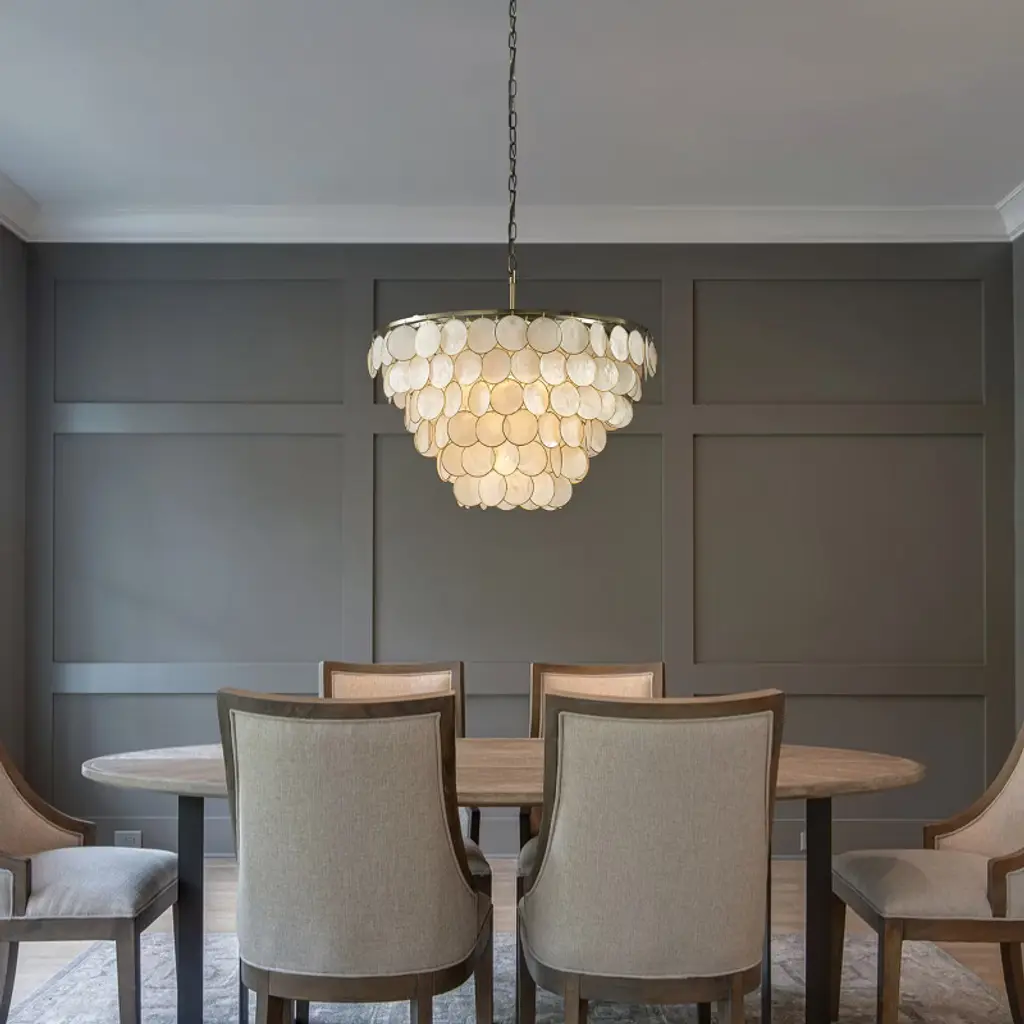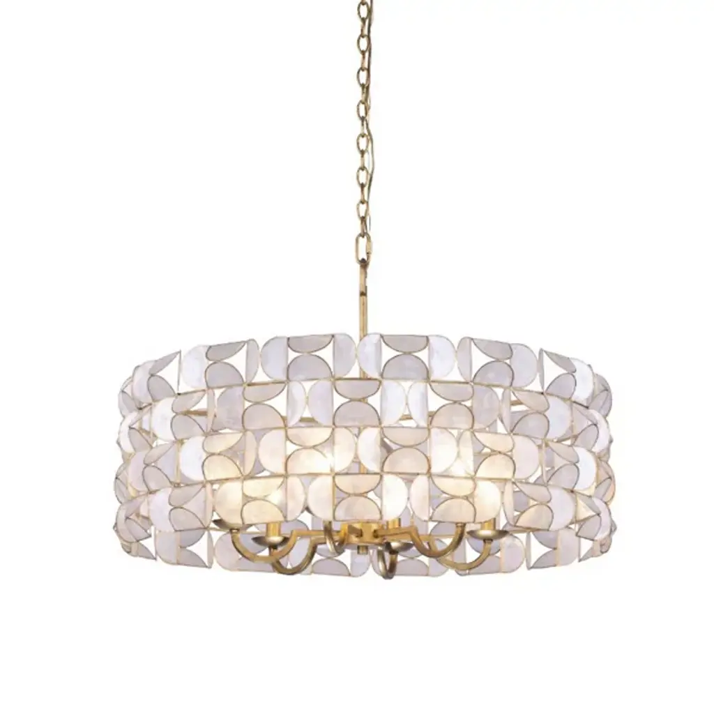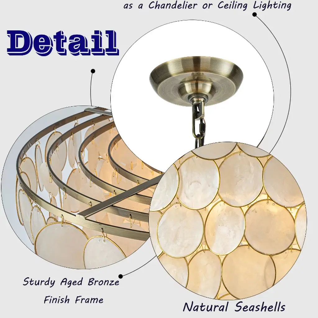 Elevate your space with the timeless elegance of this 5-light Capiz seashell chandelier, featuring a shade crafted from hundreds of natural Capiz seashells. Each seashell is hand-wrapped with brass edges, creating a stunning design that casts a dramatic play of light and a softly diffused glow. The aged bronze finish complements the natural texture of the Capiz seashells, making this chandelier a show-stopping centerpiece. The chandelier!-s versatile design makes it a perfect addition to a wide variety of spaces, including foyers, entryways, living rooms, dining areas, kitchens, and bathrooms. Its adjustable chain (ranging from 24" to 81") and dual-use functionality!awhether used as a chandelier or a flush mount ceiling light!aallow it to fit seamlessly into small, medium, or large spaces with both high and low ceilings. This versatile lighting solution is perfect for both residential and commercial spaces, including living rooms, dining rooms, bedrooms, kitchens, or protected outdoor areas. Its coastal-inspired design blends seamlessly with modern farmhouse, vintage, and contemporary glam styles, offering a functional yet decorative lighting option.