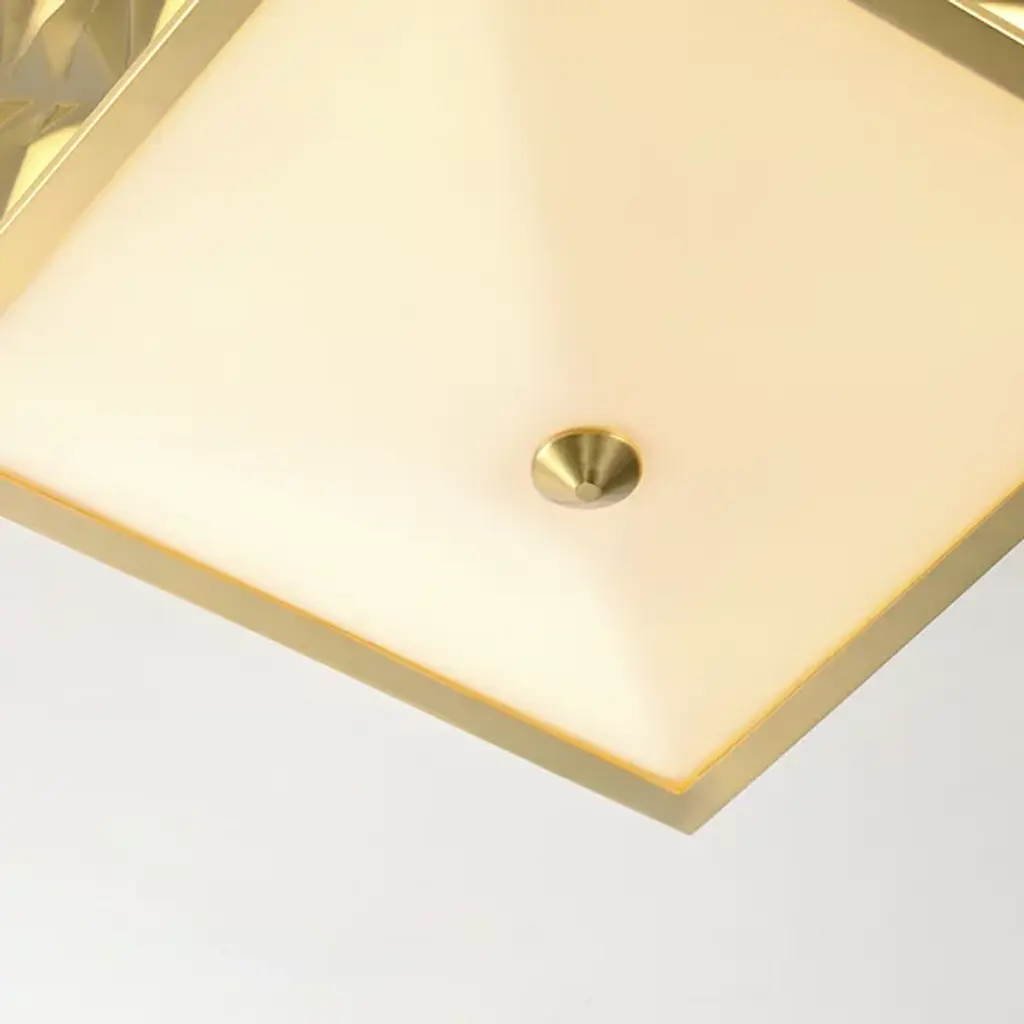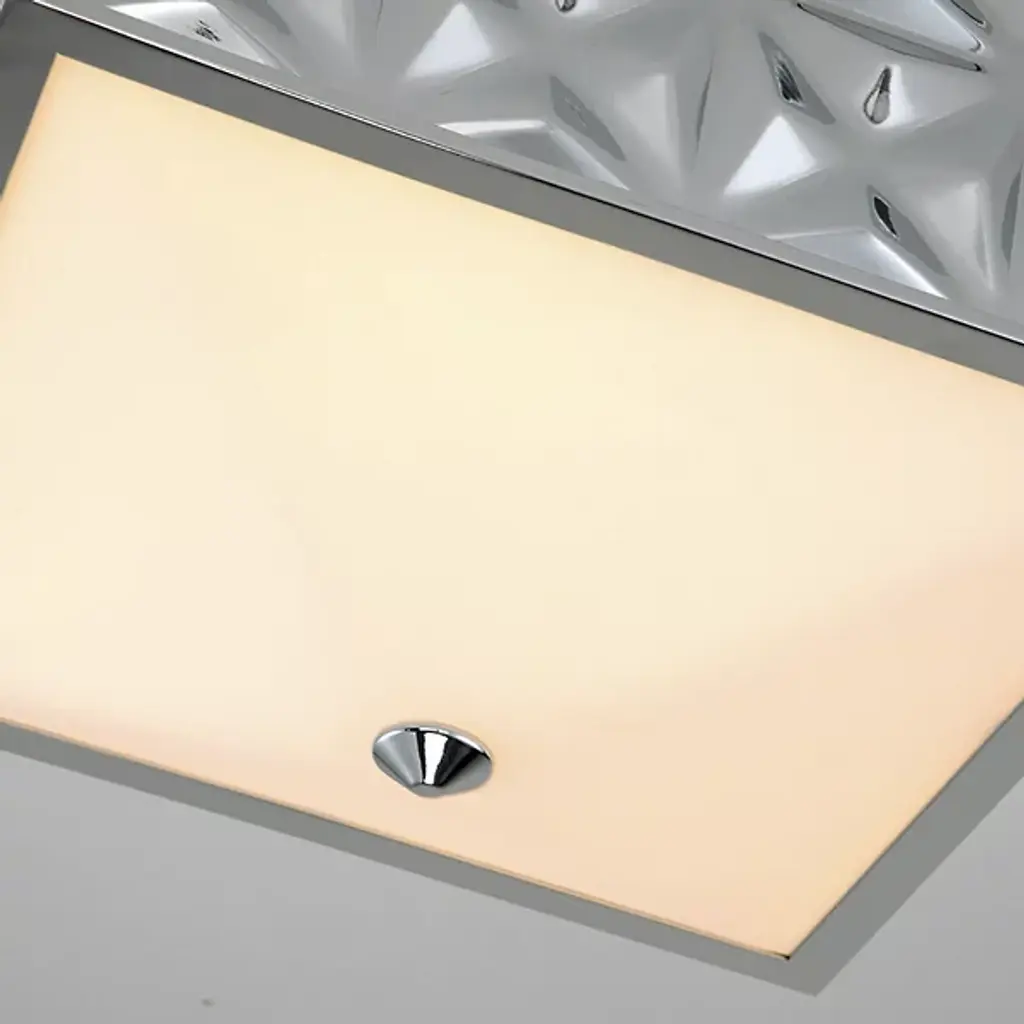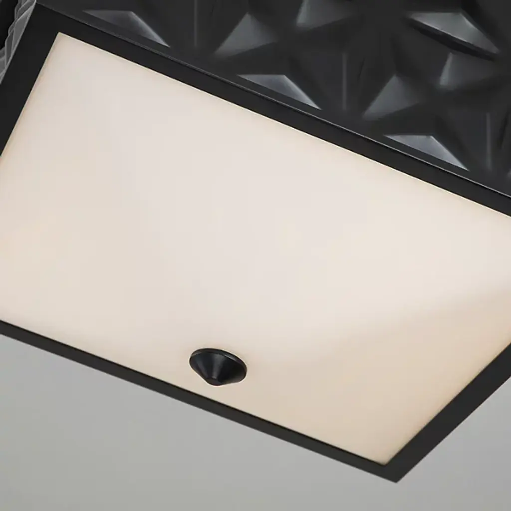 The Alpha Flushmount from Lucas McKearn bursts onto the scene with cozy warmth and bold, chiseled lines. It's a piece designed with masculine luxury, edgy glamour, and subtle richness in mind. It visually jumps off the ceiling with a metal housing covered in an angular, highlight-catching pattern. The pointy diffuser below softens the overall image by filtering a warm, filling glow as a sanded glass shape.