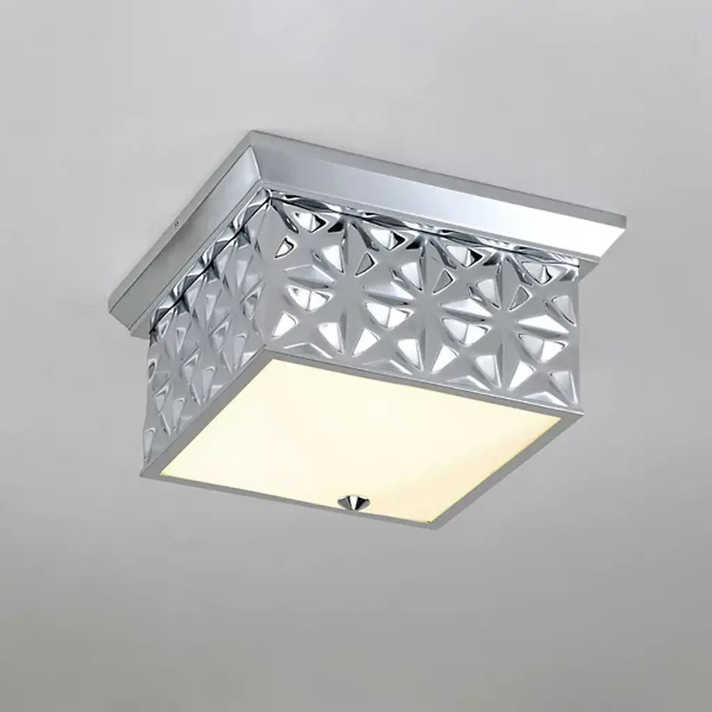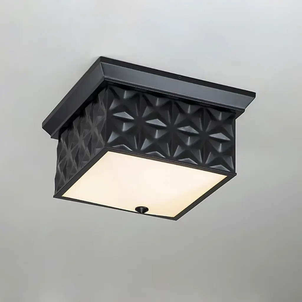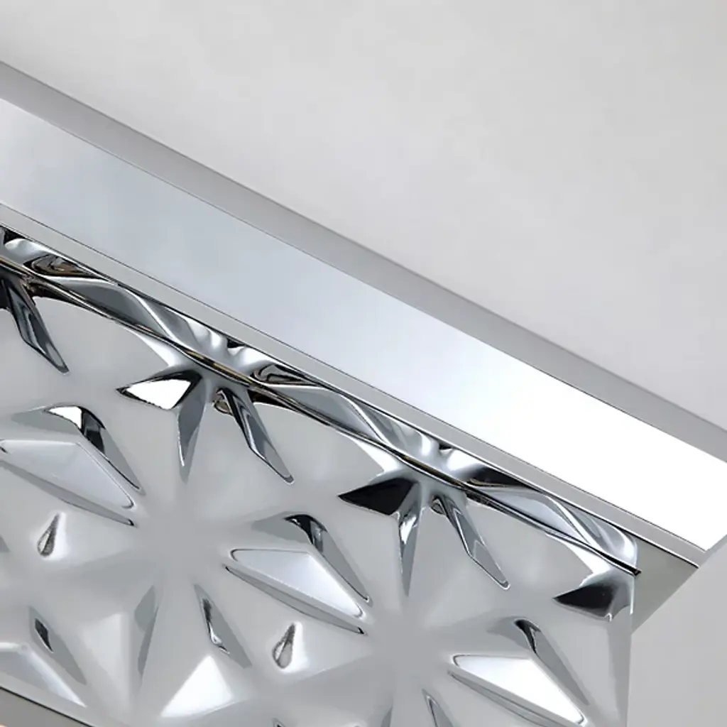 The Alpha Flushmount from Lucas McKearn bursts onto the scene with cozy warmth and bold, chiseled lines. It's a piece designed with masculine luxury, edgy glamour, and subtle richness in mind. It visually jumps off the ceiling with a metal housing covered in an angular, highlight-catching pattern. The pointy diffuser below softens the overall image by filtering a warm, filling glow as a sanded glass shape.