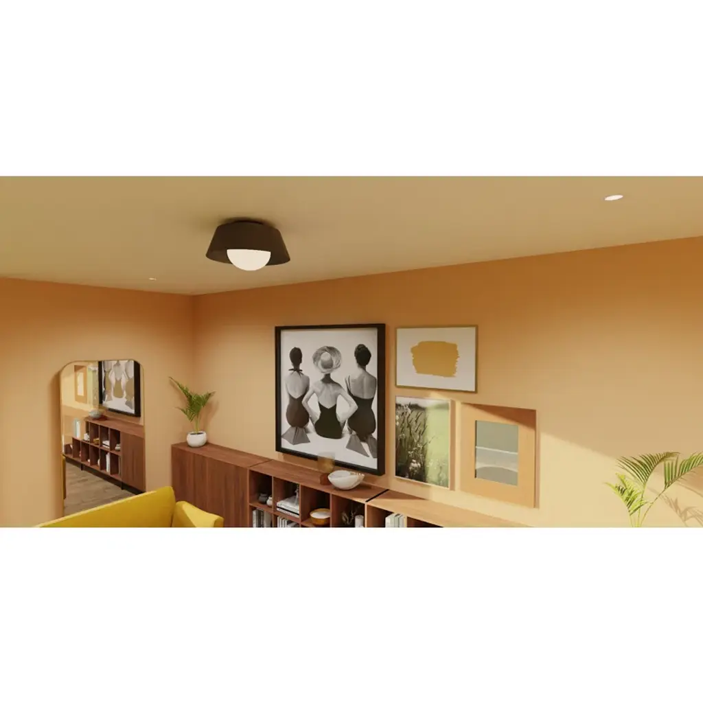 The transitional style of the Amarone flush mount is both sleek and modern. A simple drum silhouette is finished in matte black on the outside, painted with a warm brass interior for optimal illumination. An opal glass globe completes the overall look, making Amarone a perfect choice in any space.