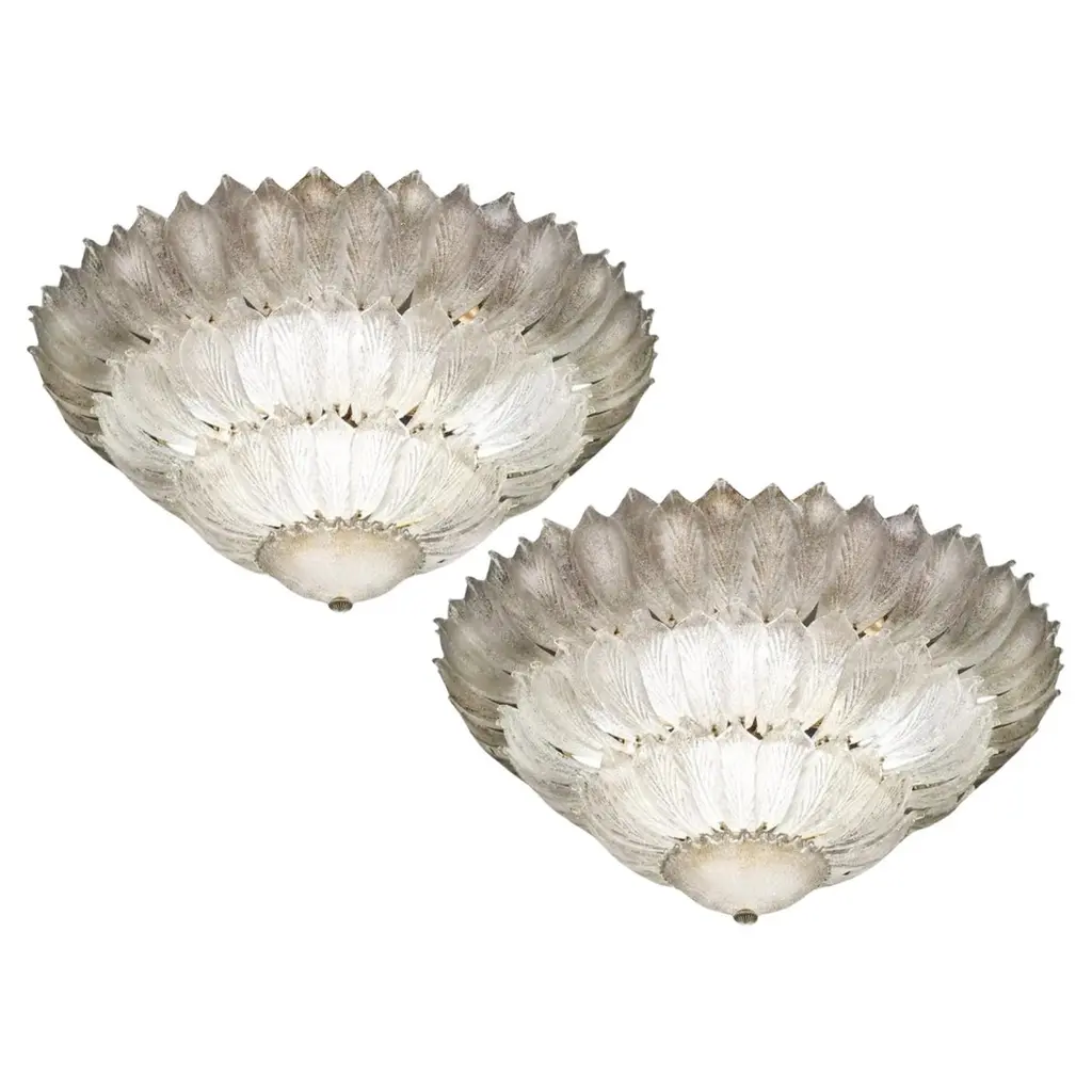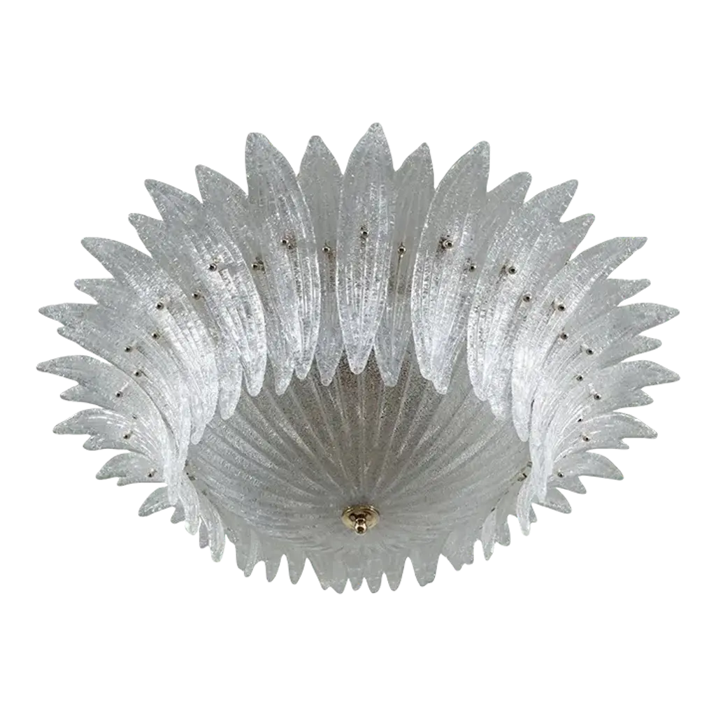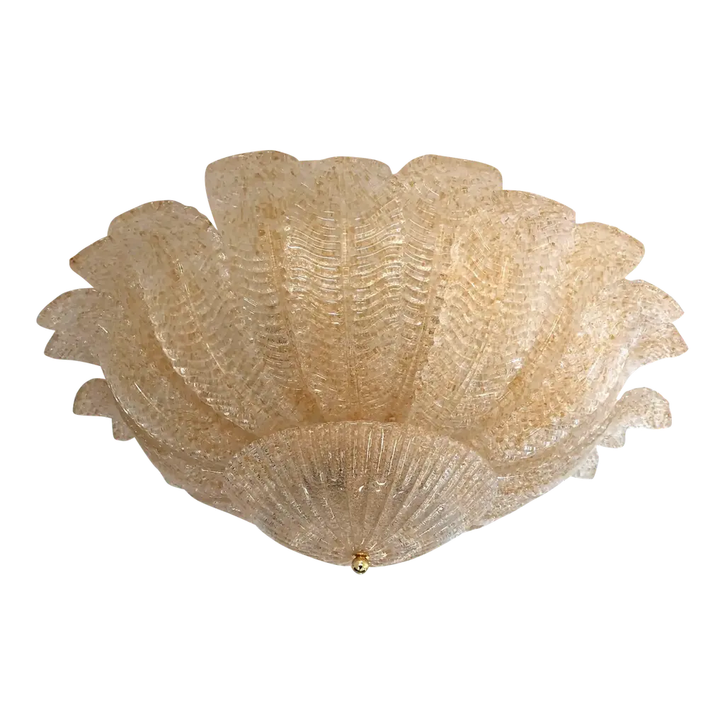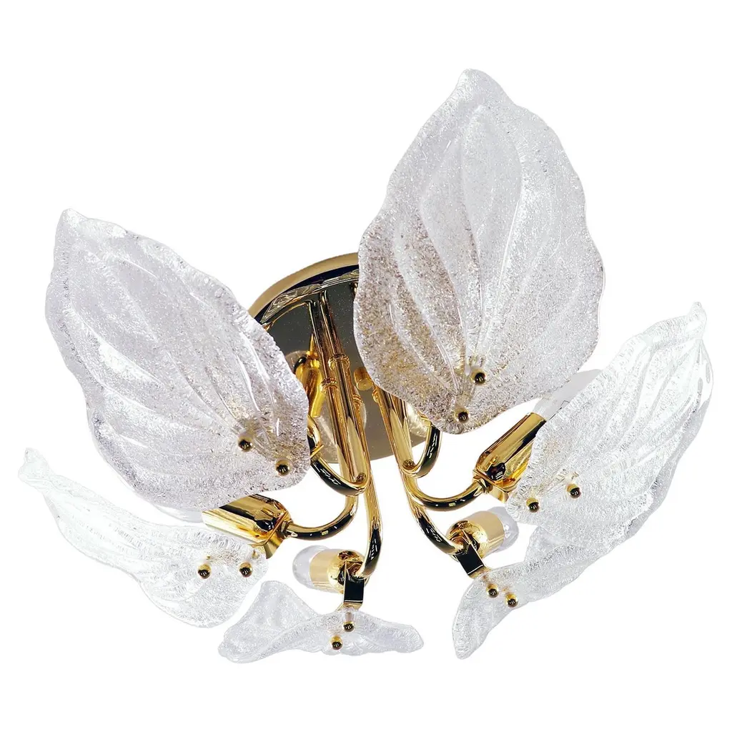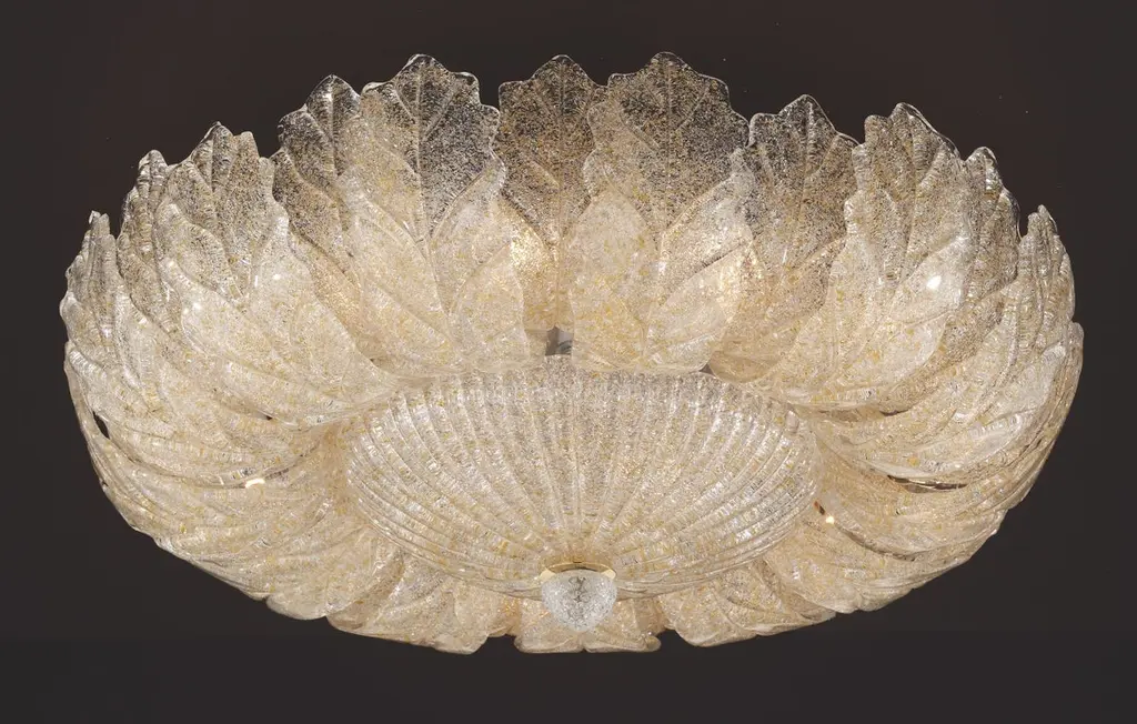 Italian flush mount with clear Murano glass leaves hand blown in amber Graniglia to produce a granular textured effect, mounted on 24-karat gold plated metal finish frame by Fabio Ltd / Made in Italy15 lights / E26 or E27 type / max 60W eachMeasures: Diameter 29.5 inches, height 14 inchesOrder only / this item ships from ItalyOrder reference #: FABIOLTD C907