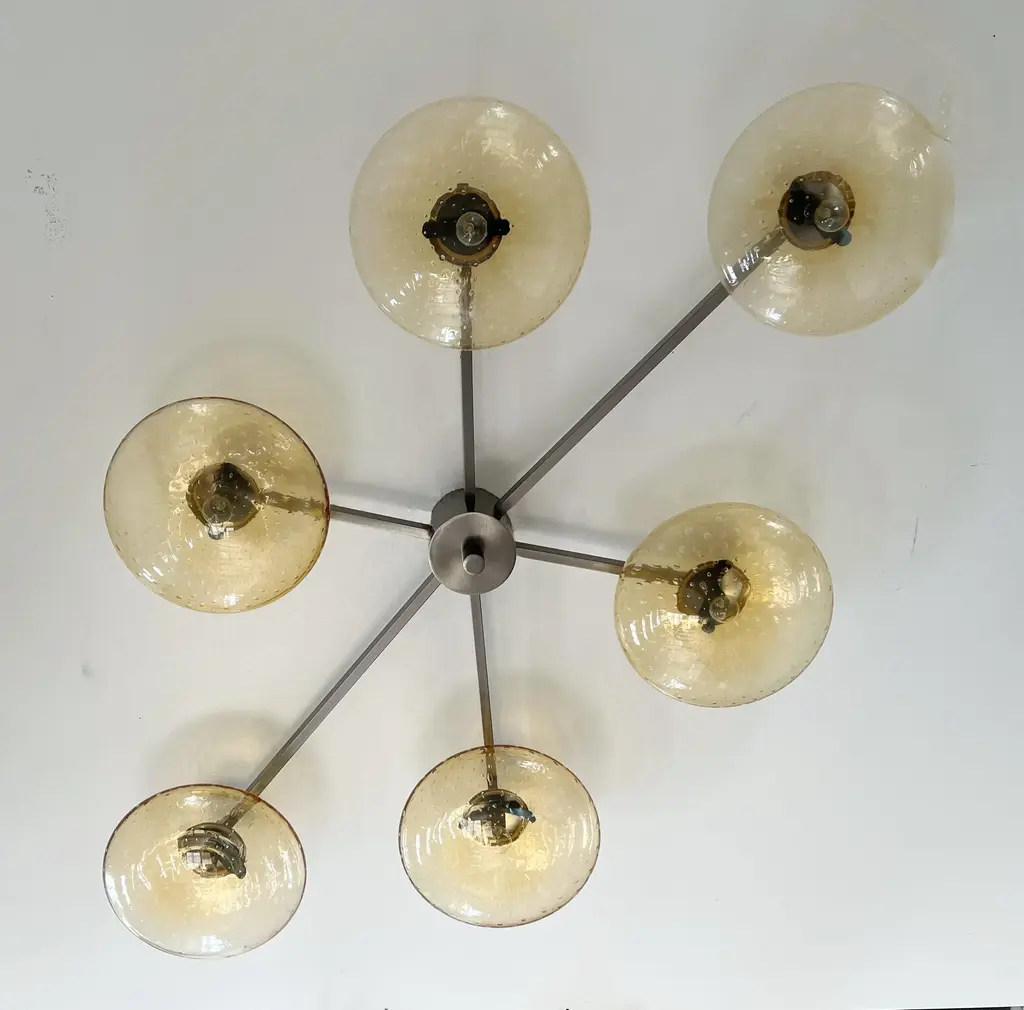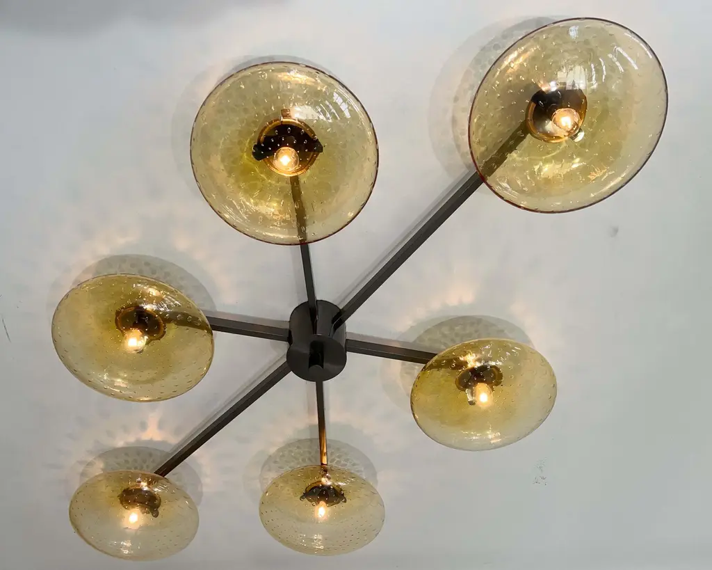 Italian asymmetrical flush mount with six amber Murano glass shades carefully hand blown with bubbles inside the glass using Bollicine technique, mounted on solid brass frame in satin black nickel finish / Made in Italy Designed by Fabio Ltd, inspired by Angelo Lelli and Arredoluce styles 6 lights / E12 or E14 type / max 40W each Length 60 inches / Width 35.5 inches / Height 8 inches Order only. This item ships from Italy