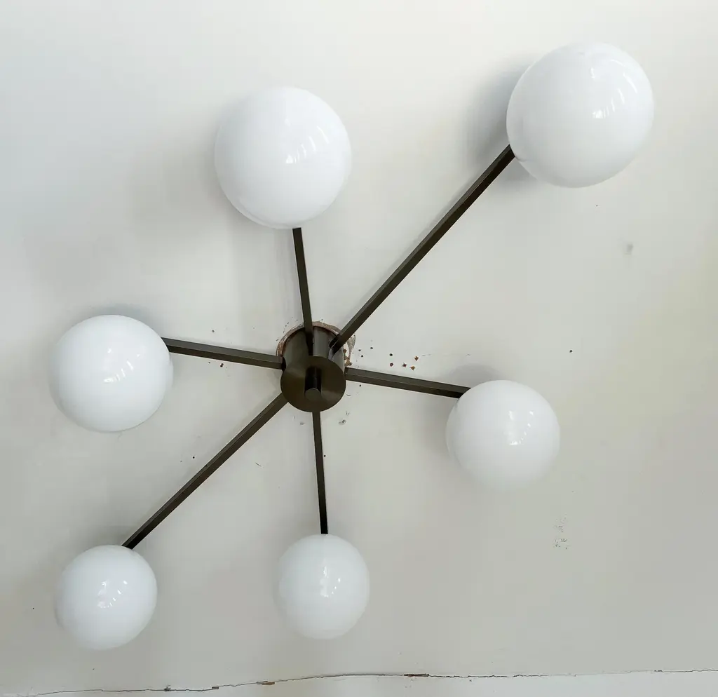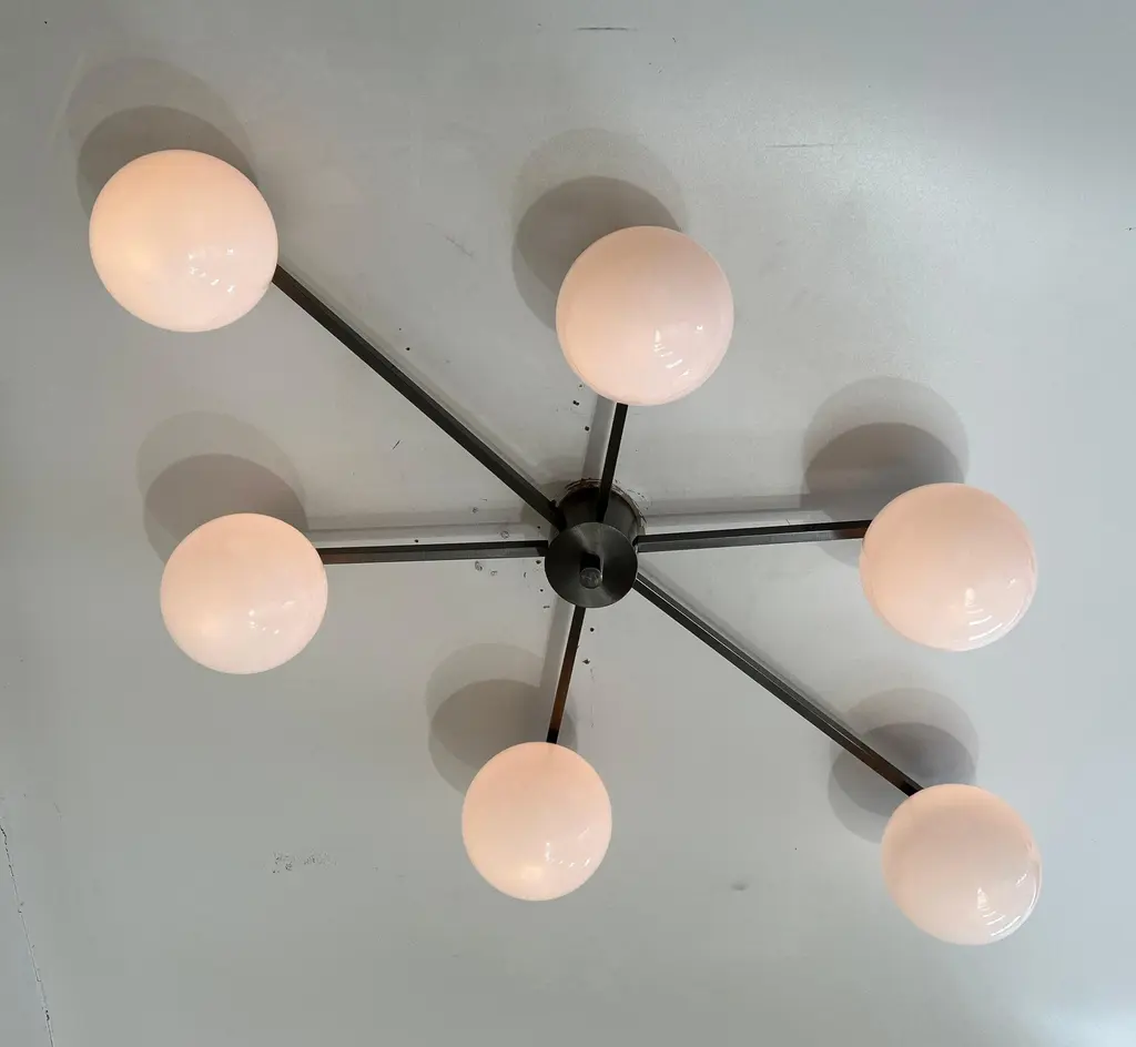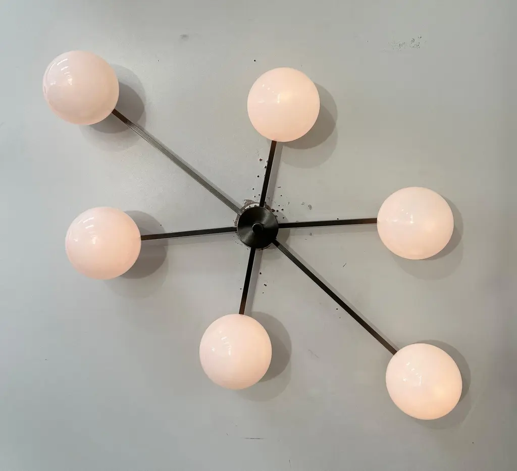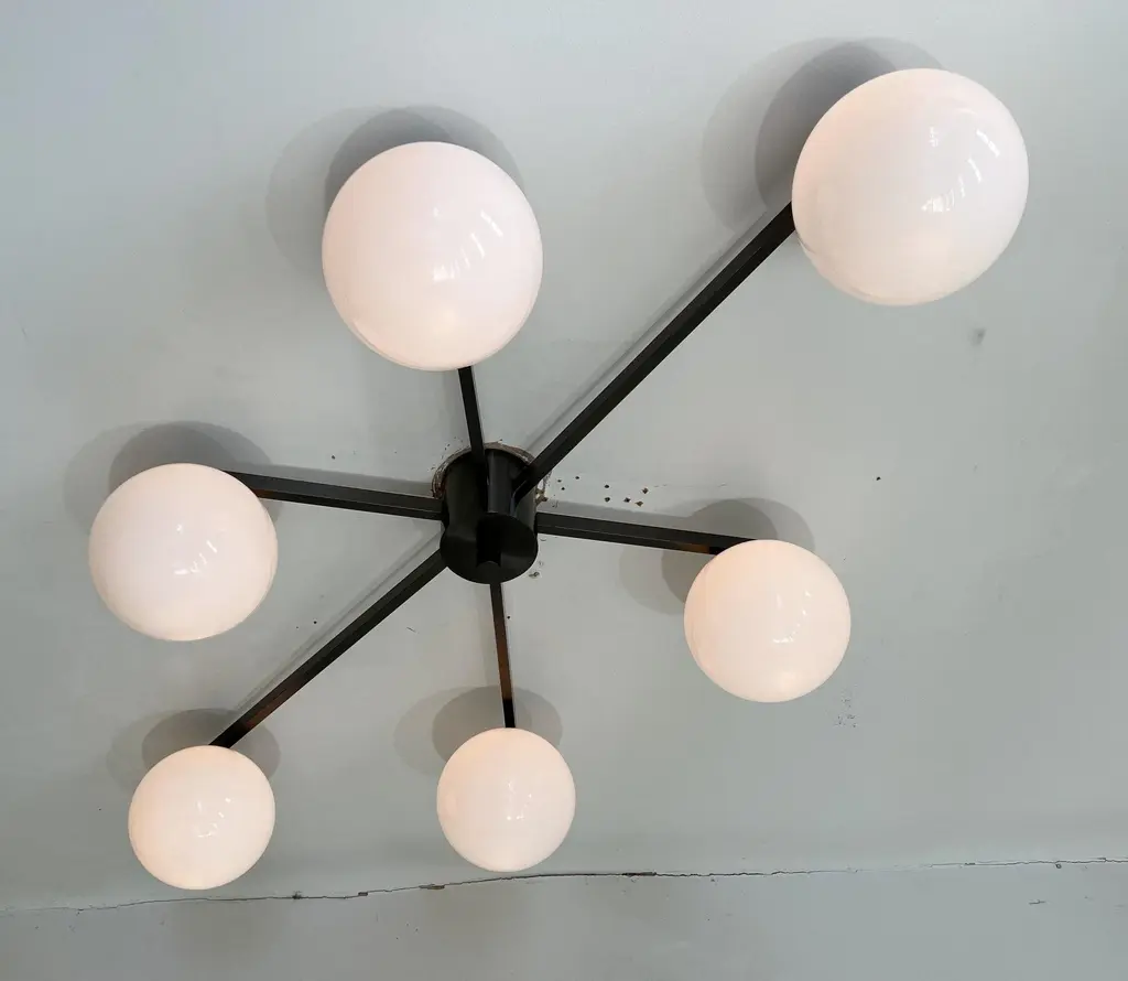 Italian asymmetrical flush mount with six glossy white Murano glass globes mounted on solid brass frame in satin black nickel finish / Made in Italy Designed by Fabio Ltd, inspired by Angelo Lelli and Arredoluce styles 6 lights / E12 or E14 type / max 40W each