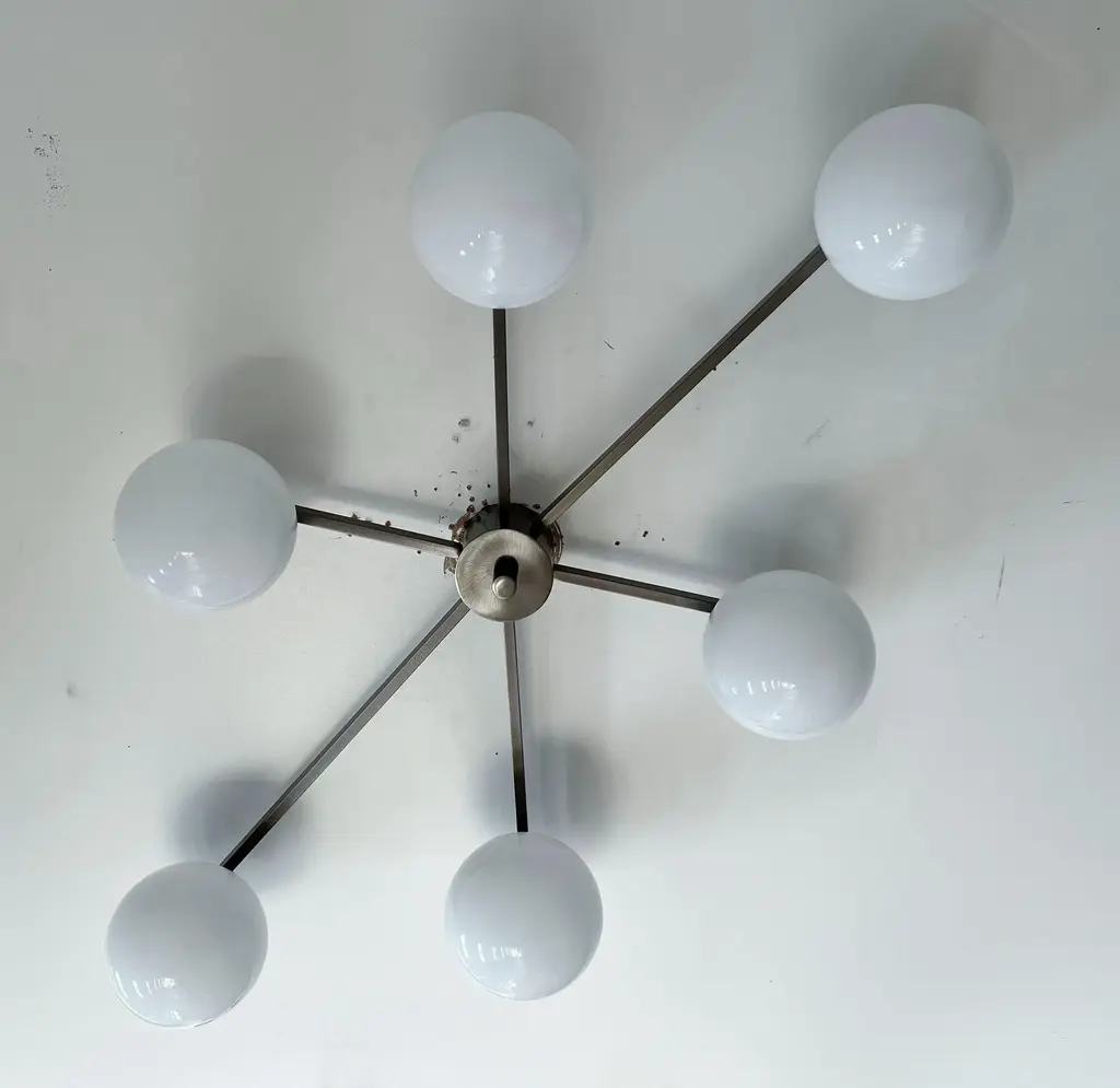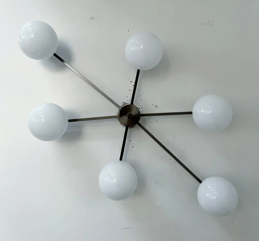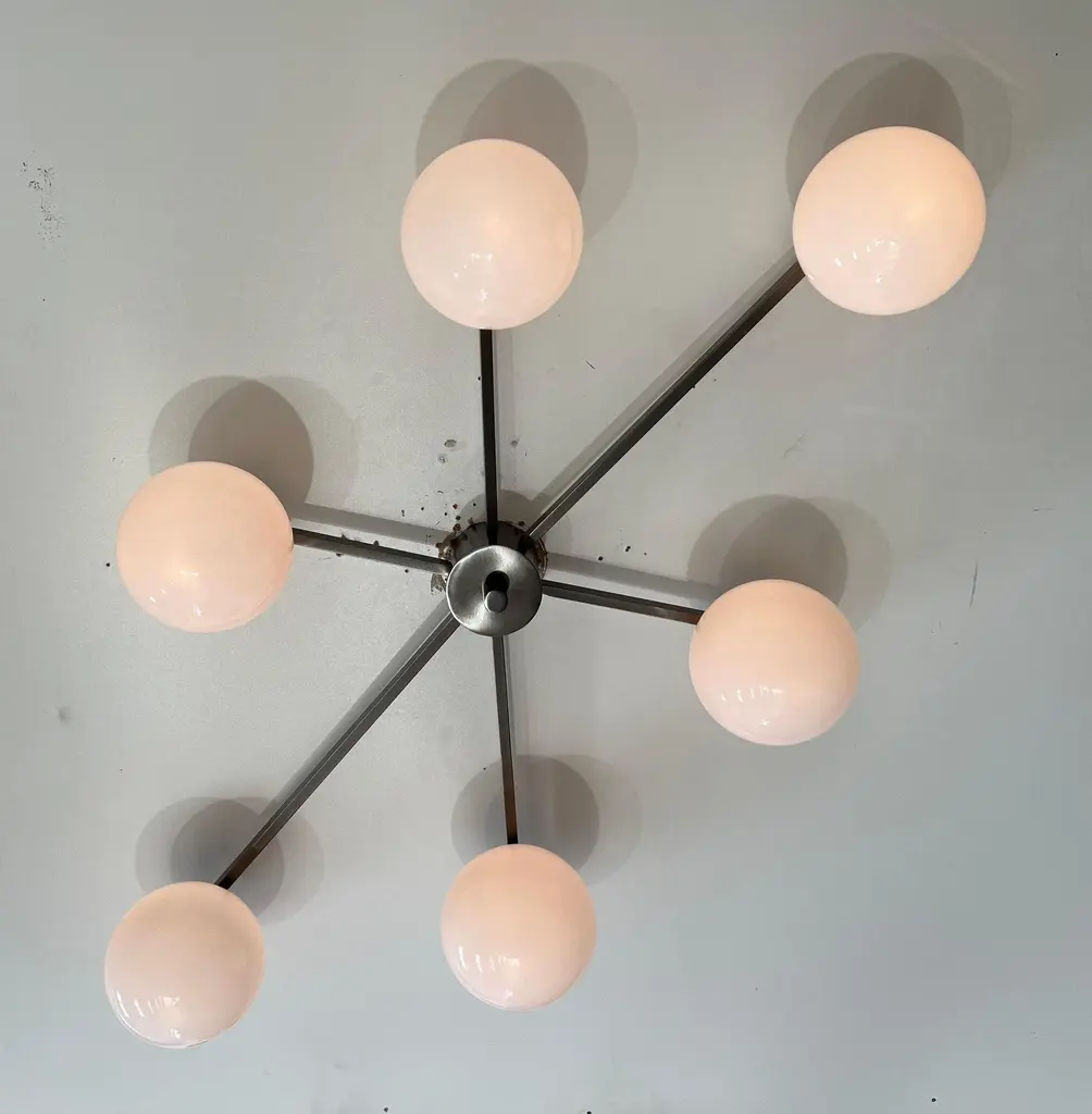 Italian asymmetrical flush mount with six glossy white Murano glass globes mounted on solid brass frame in satin black nickel finish / Made in Italy Designed by Fabio Ltd, inspired by Angelo Lelli and Arredoluce styles 6 lights / E12 or E14 type / max 40W each