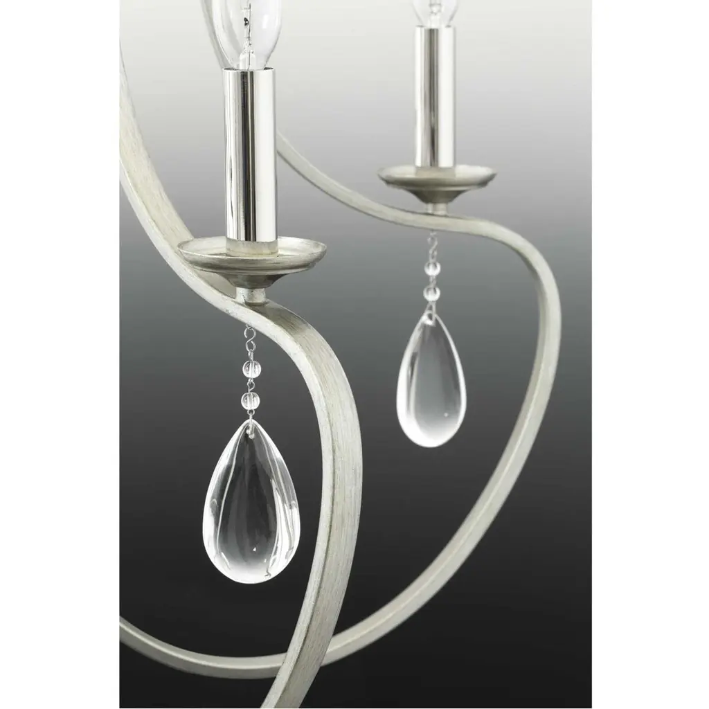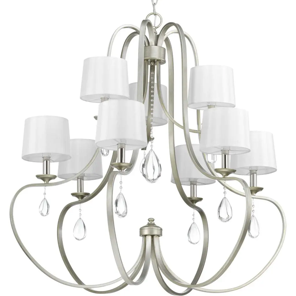 A distinctive collection with casual crystal details. Each fixture in the Anjoux family features variations of complementary designs. Sconces are highlighted by clear water glass shades, while chandeliers are adorned by elegant crystal finials. A flush mount version emulates cascading embers with teardrop crystal accents. Anjoux is a truly versatile lighting collection that can complement a wide range of design spaces. Nine-Light Chandelier Silver Ridge finish.