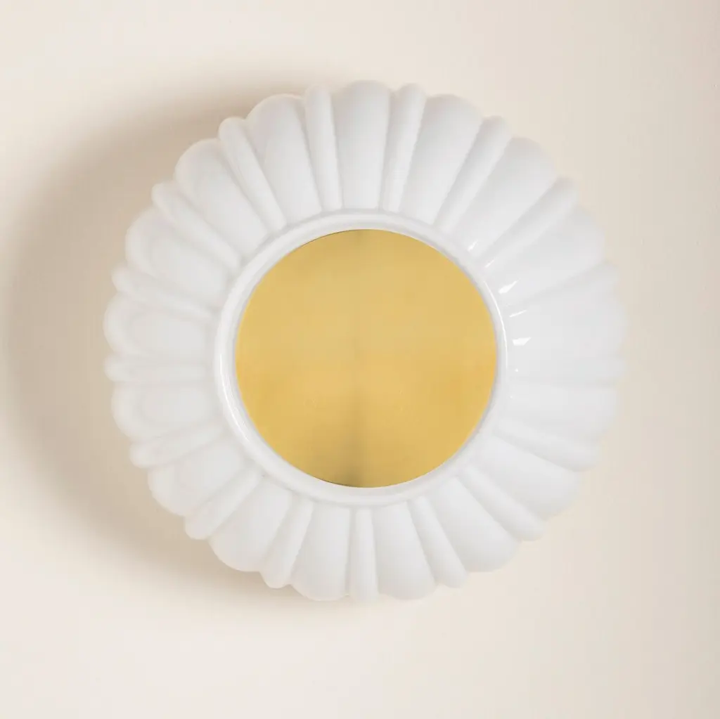 Recalling Art Deco designs, this decorative flush mount features a large Opal Shiny Glass shade with fluted edges. The metalwork is finished in timeless Aged Brass, adding a luxurious note. Anne provides warm illumination to a living room, bedroom, or office space. Part of our Zoe Feldman collection.