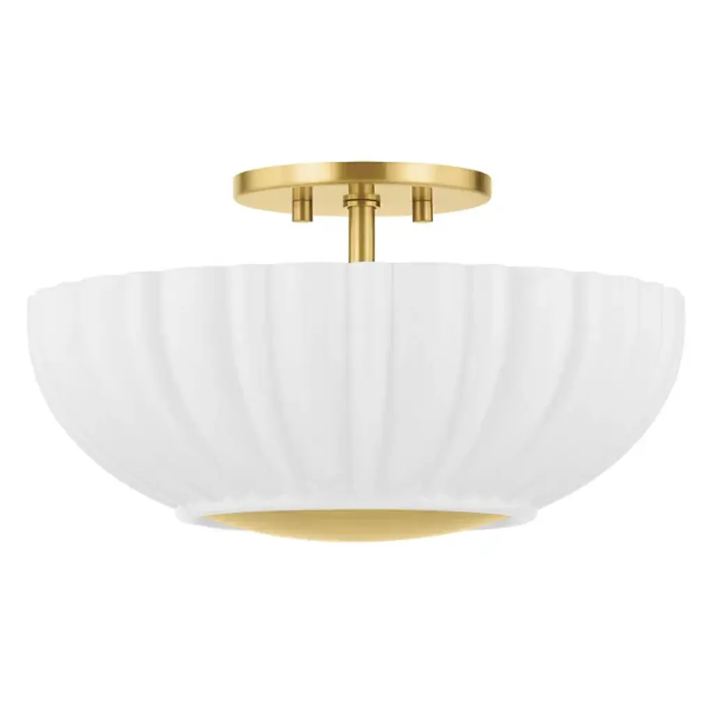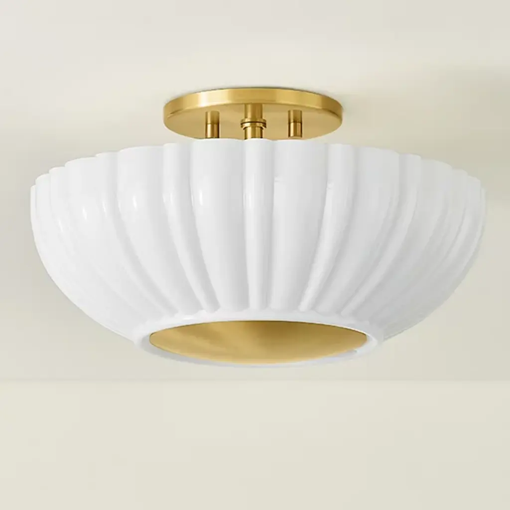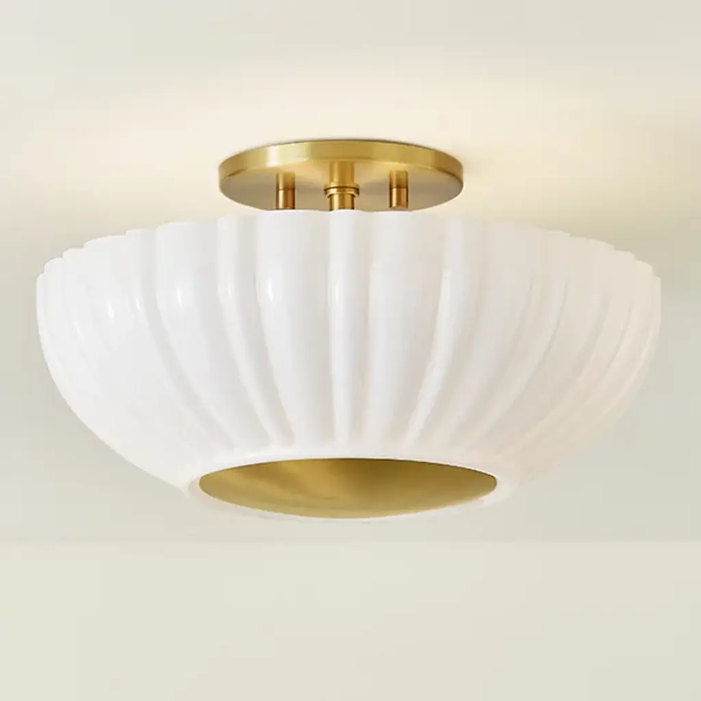 Drawing inspiration from Art Deco aesthetics, the Anne Flushmount by Mitzi exudes decorative charm. Crafted by designer Zoe Feldman, this fixture encapsulates the essence of Art Deco style, its large Opal Shiny Glass dome shade adorned with fluted edges taking center stage, surrounding damp-listed lamping suspended by a simple metal upper structure finished in the enduring Aged Brass. The metalwork adds a touch of luxury to its design. At the same time, the translucent shade provides a warm and inviting illumination, becoming the perfect addition to living rooms, bedrooms, or office spaces, seamlessly blending functionality with style.