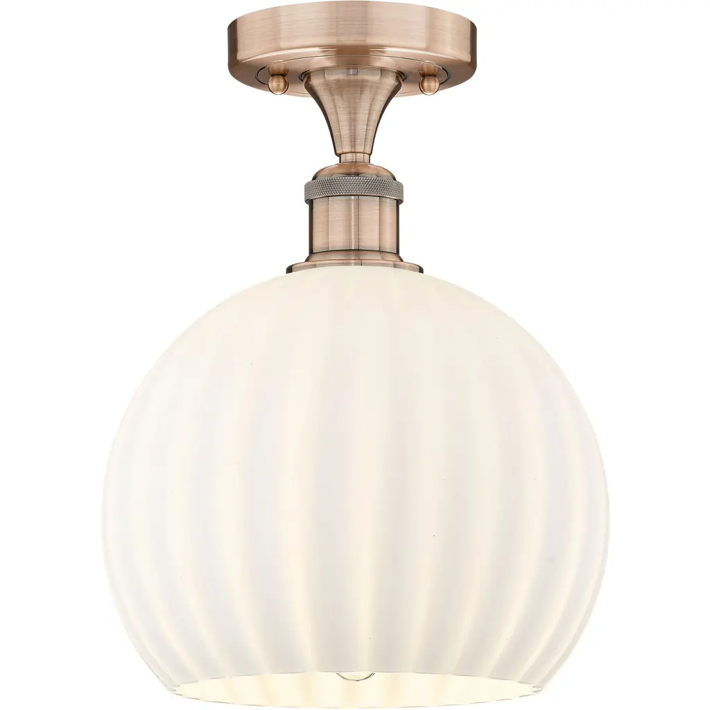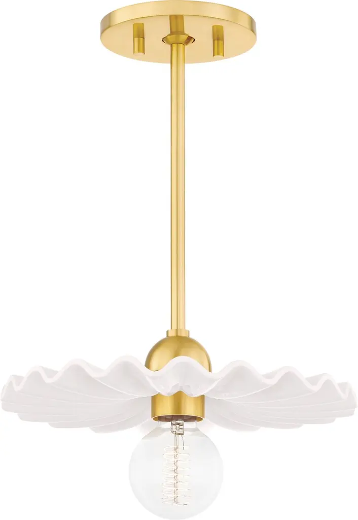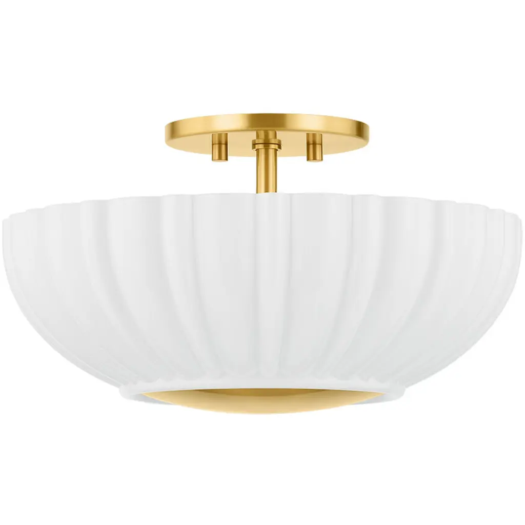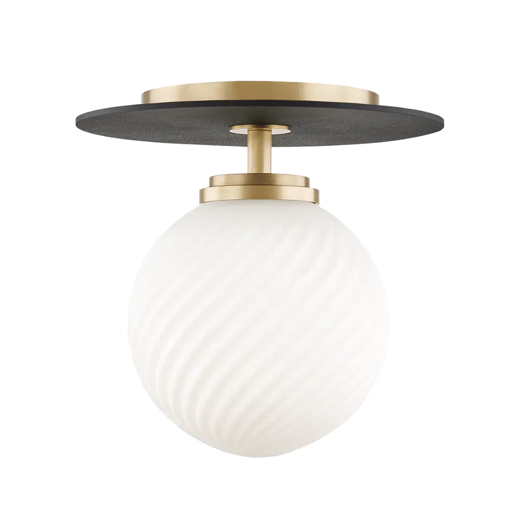 Drawing inspiration from Art Deco aesthetics, the Anne Flushmount by Mitzi exudes decorative charm. Crafted by designer Zoe Feldman, this fixture encapsulates the essence of Art Deco style, its large Opal Shiny Glass dome shade adorned with fluted edges taking center stage, surrounding damp-listed lamping suspended by a simple metal upper structure finished in the enduring Aged Brass. The metalwork adds a touch of luxury to its design. At the same time, the translucent shade provides a warm and inviting illumination, becoming the perfect addition to living rooms, bedrooms, or office spaces, seamlessly blending functionality with style.