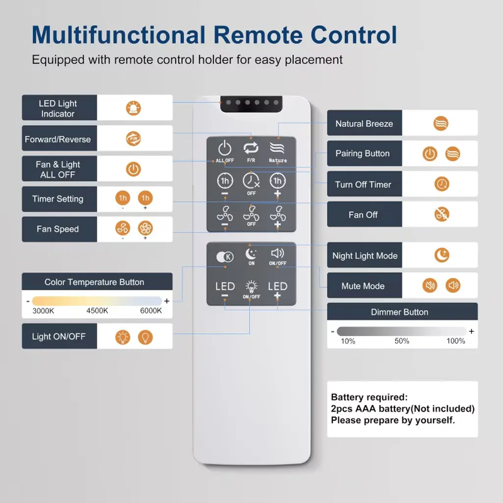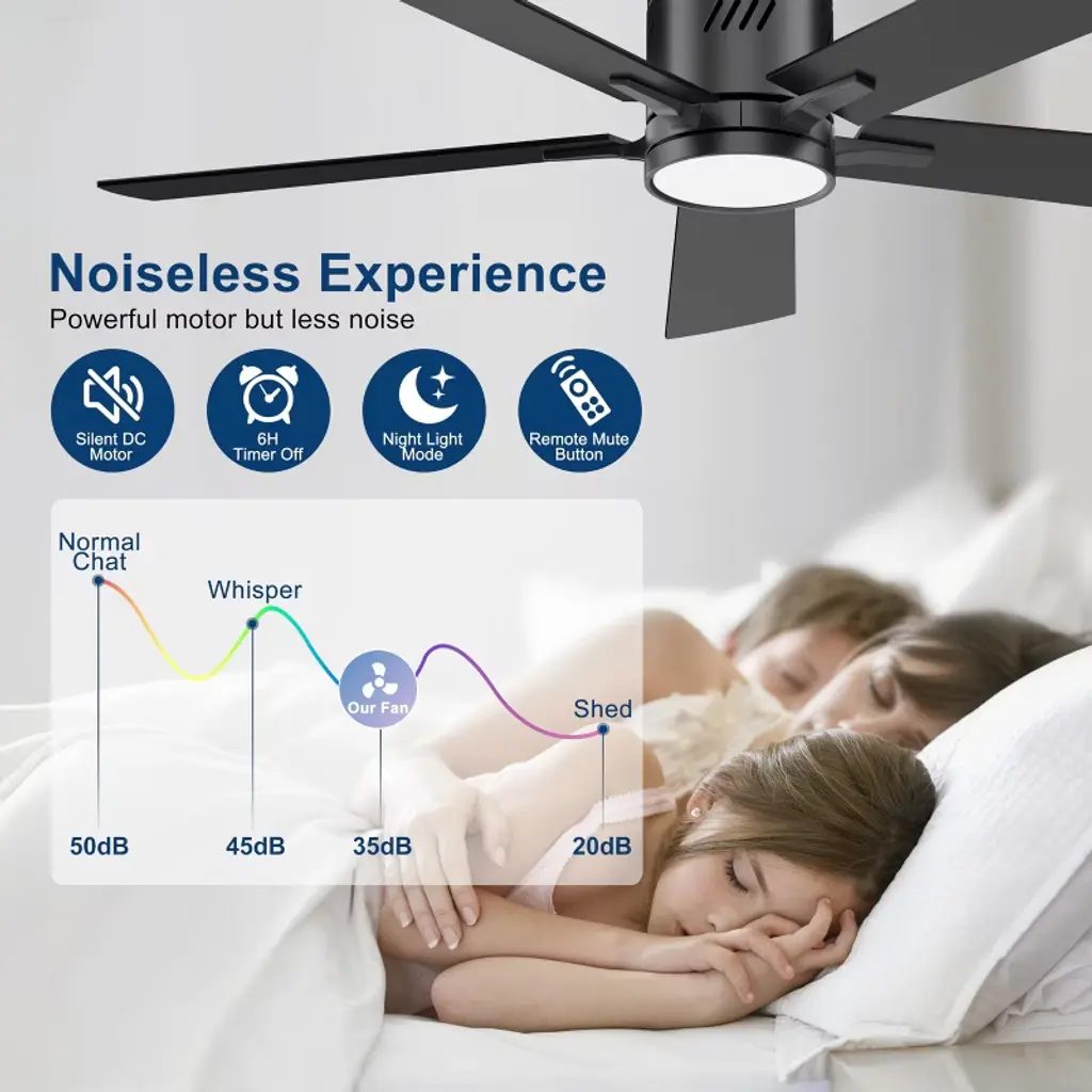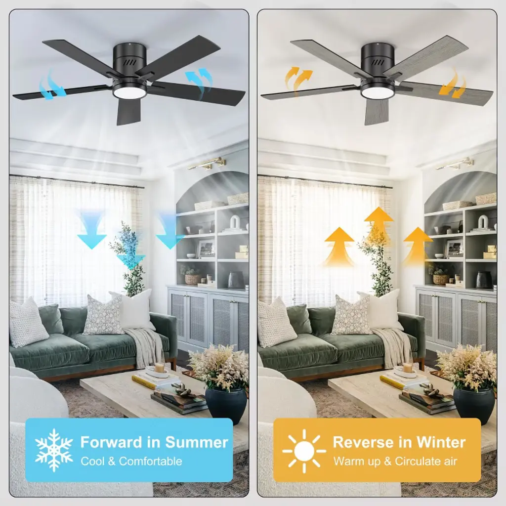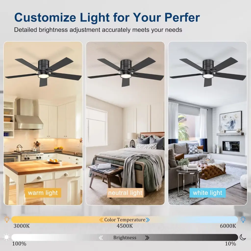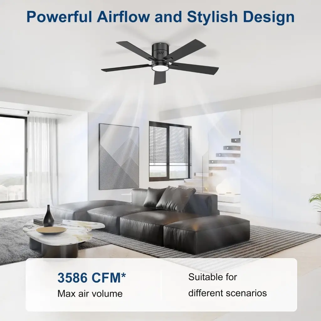 Upgrade your indoor space with this 48 - inch low - profile ceiling fan with lights. Its DC motor ensures an ultra - quiet operation, with noise as low as 35dB, and the remote control has a silent mode. The lighting is fully customizable, dimmable from 100% to 10% and offering 3 color temperatures (3000K, 4500K, 6000K) for various activities. With 6 adjustable wind speeds, it can deliver up to 3586 CFM of air volume. The reversible motor improves air circulation, making it useful in both summer and winter. The low - profile flush - mount design is easy to install with the help of detailed instructions and videos, and it's suitable for multiple indoor spaces like farmhouses, living rooms, and bedrooms. The double - sided fan blades, one black and the other wood grey, not only provide optimal airflow but also match different room styles, enhancing your living comfort.