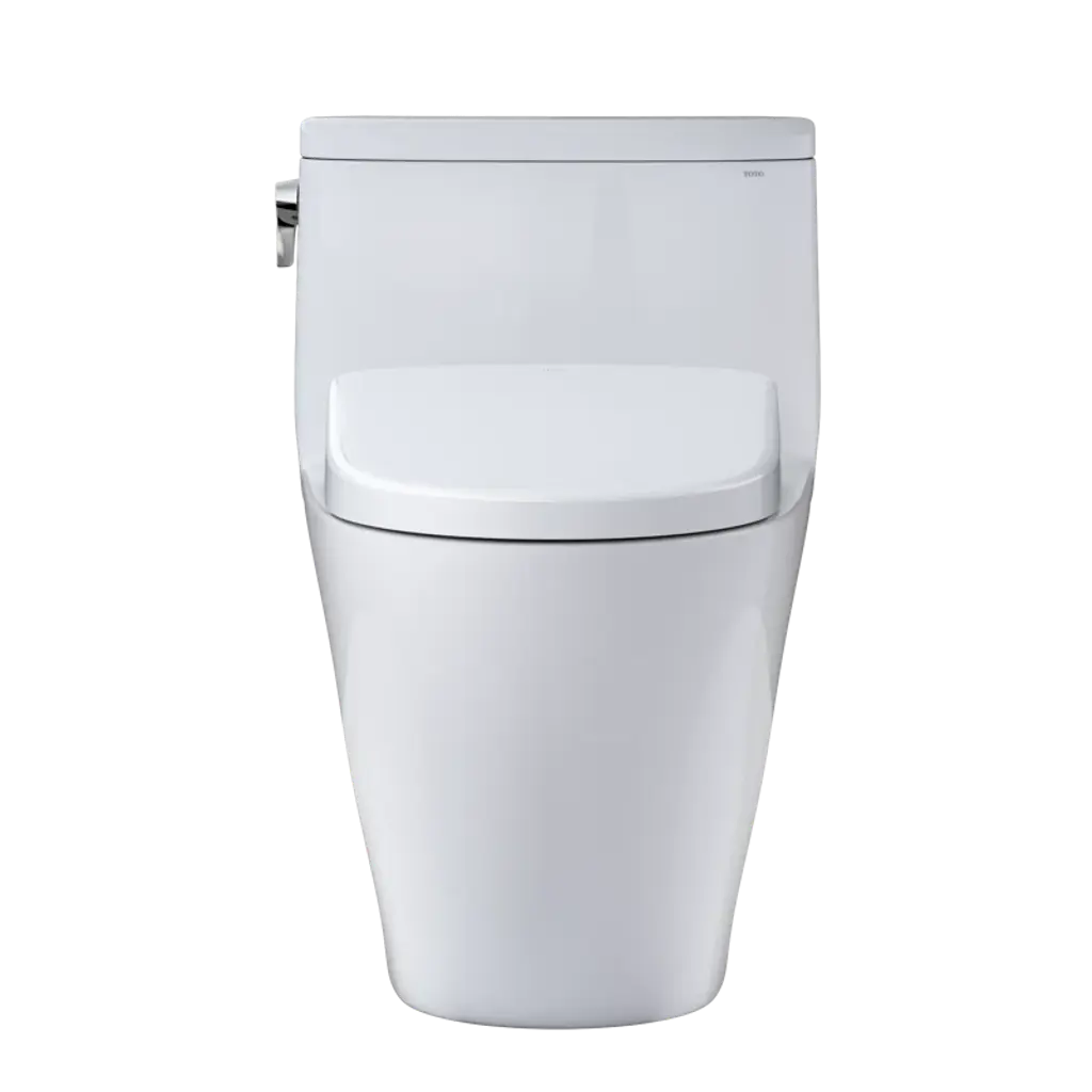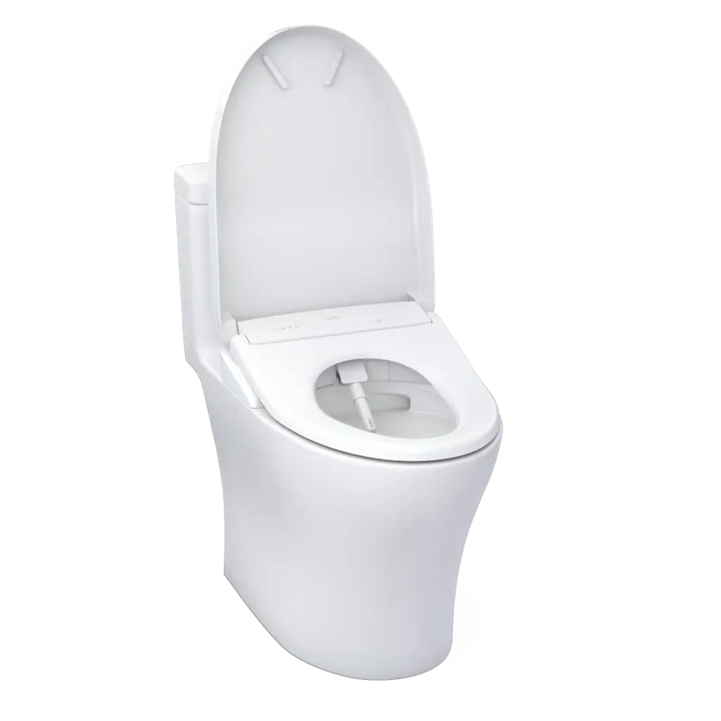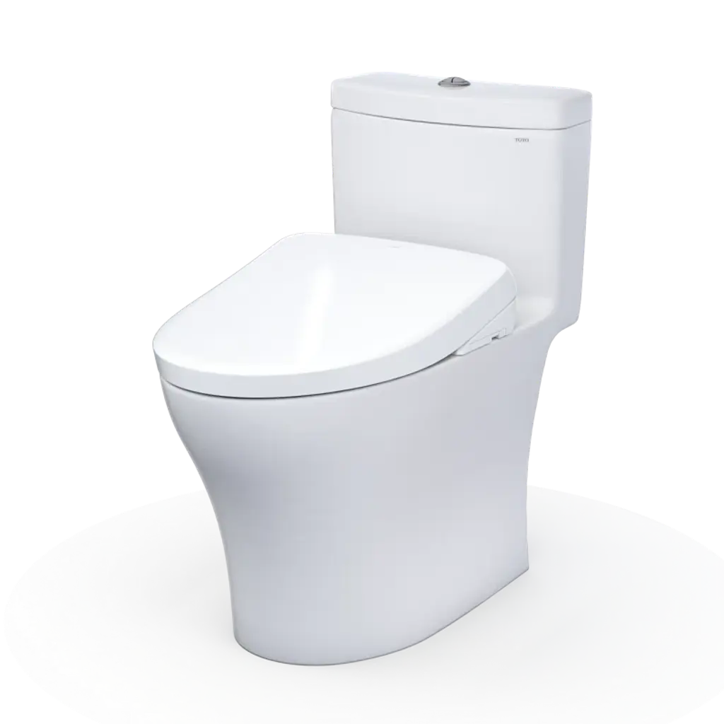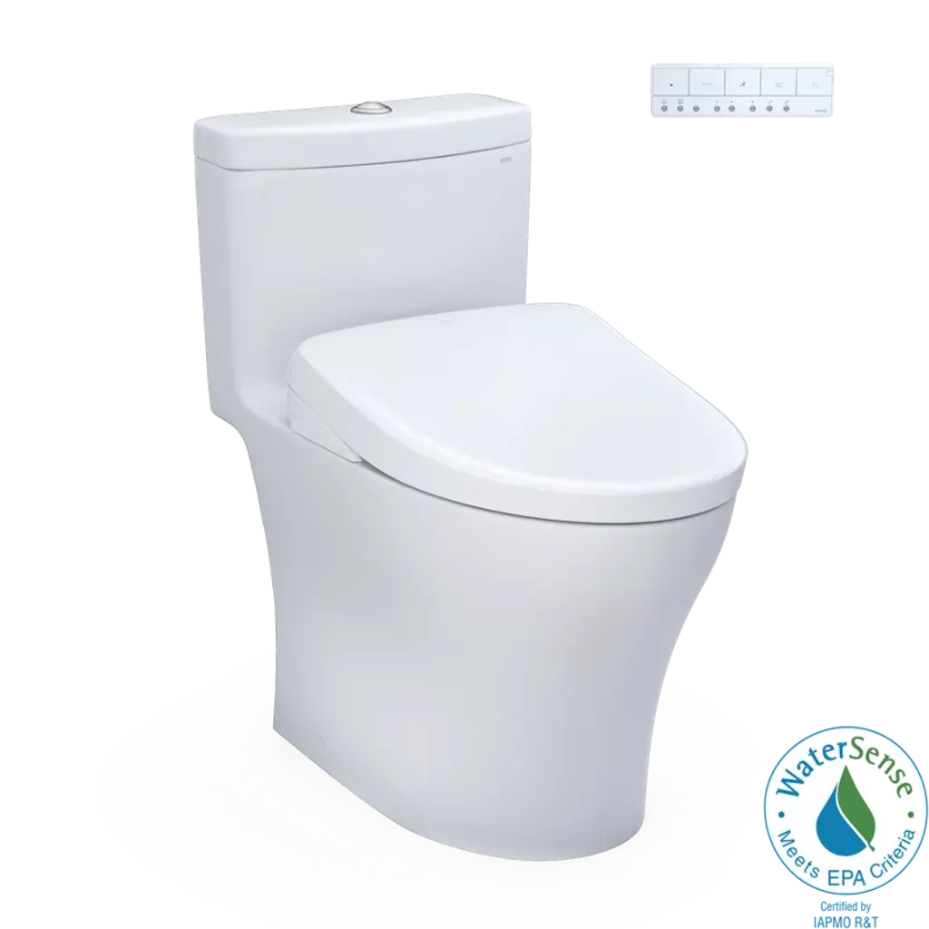 The TOTO WASHLET+ Aquia IV One-Piece Elongated Dual Flush 1.28 and 0.9 GPF Toilet and Contemporary WASHLET S7 Bidet Seat is designed to conceal the WASHLET power cord and water supply hose for a seamless installation. The WASHLET S7 features TOTO's technologically advanced EWATER+ system that mists the wand and toilet bowl, reducing the need for harsh cleaning chemicals. PREMIST wets the surface of the toilet bowl, aiding in the removal of waste and resulting in a better clean. The TOTO WASHLET S7 is operated by a luxury style illuminated touch button remote with 4-user memory storage to save preferred settings. The WASHLET features 5 spray settings, heated seat, and instantaneous water heating. The redesigned WASHLET lid style resides flush with the toilet bowl, providing a streamline look and giving the impression of an integrated system. This minimalistic display provides a more subdued appearance to your WASHLET and skirted design conceals the trapway, which enhances the elegance and style the toilet. The one-piece design is not only aesthetically pleasing, but by removing the gap between the tank and bowl, we eliminate the hiding place for dirt and debris and minimize the frequency of cleanings. The Universal Height design allows for a more comfortable seat position across a wide range of users. The Aquia IV features TOTO’s DYNAMAX TORNADO FLUSH, utilizing a 360 degree cleaning power to reach every part of the bowl. This version of the Aquia IV includes CEFIONTECT, a layer of ceramic glaze that minimizes waste from sticking to ceramic surfaces. CEFIONTECT, EWATER+, and DYNAMAX TORNADO FLUSH create a synergy that optimizes flush performance to reduce the frequency of toilet cleanings, minimizing the usage of water, harsh chemicals, and time required for cleaning. The enhanced design of the Aquia IV inner bowl reduces water flow resistance and turbulence, resulting in a quieter flush. The chrome center-mounted push button that sits atop the tank allows you to proactively conserve water by choosing between a 0.9 GPF rinse or 1.28 GPF for tougher jobs. The Aquia IV comes ready for install into a 12" rough-in, but may be adapted for a 10" or 14" rough-in with the purchase of a separately sold adapter. Additional items needed for installation must be purchased separately: wax ring, toilet mounting bolts, and toilet water supply lines.