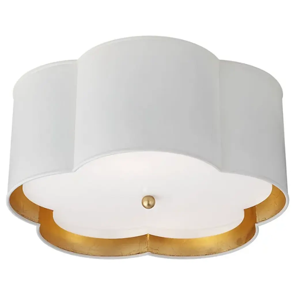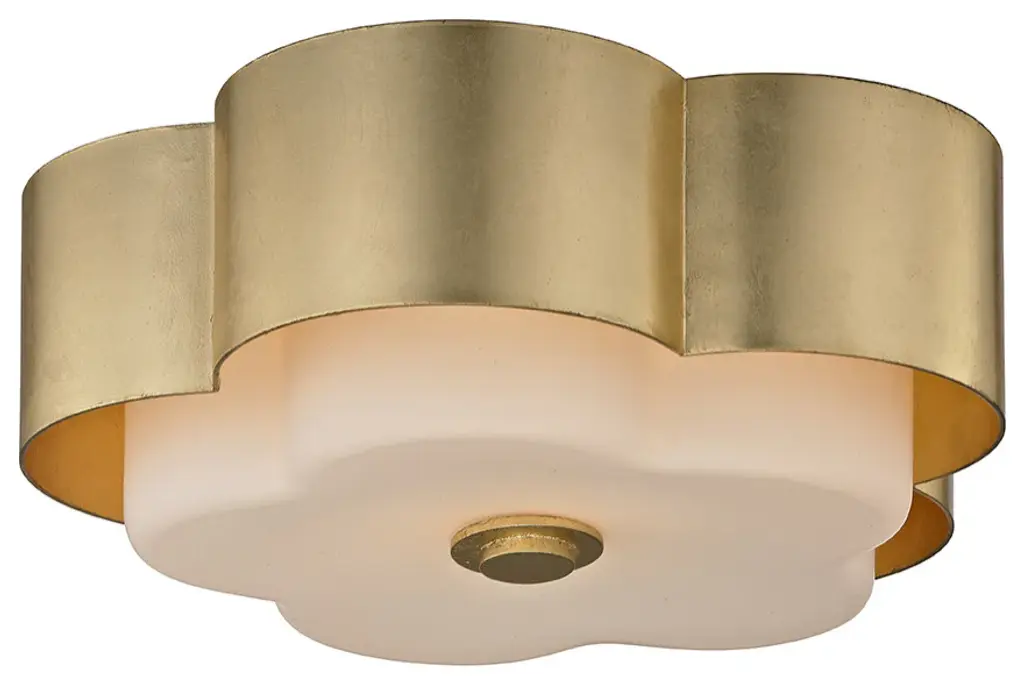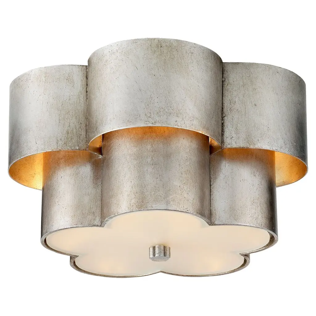 Rugged metalwork meets decorative floral design in the Arabelle Flushmount by Visual Comfort Signature, formerly known as Visual Comfort. This uniquely stylized piece features a multi-tiered metal body which bends and curves around a Frosted Acrylic shade in the shape of a flower. The lighting produced is both useful and visually complex, permeating through the shade for a nice even ambiance while simultaneously seeping through the body for a dynamic backlight.
