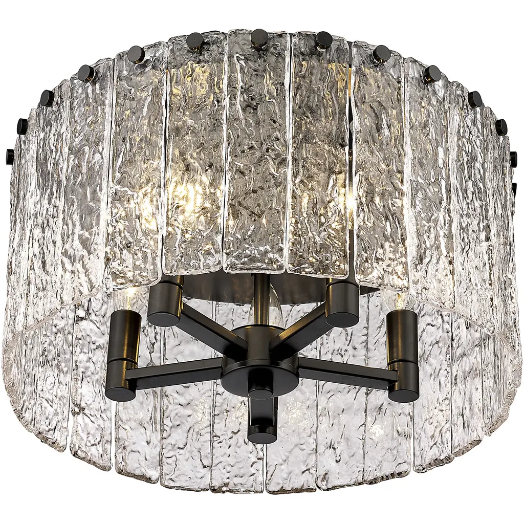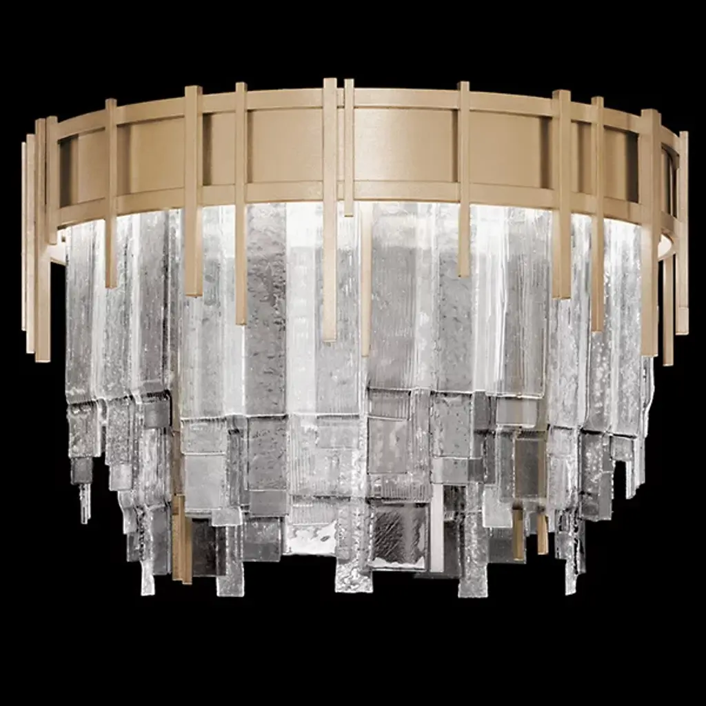 The Arpeggio LED Flushmount from Fine Art brings music-inspired energy to overhead lighting. Anchored by a wide metal collar, panels of textured studio glass—fused with subtle blends of clear and colored tones—hang in a rhythmic pattern that suggests melodic movement. Each glass piece is staggered in different lengths, catching and diffusing light from the integrated LED source above. With its sculptural form and Art Deco influence, this flushmount fixture adds depth, warmth, and refined character to interior spaces.
