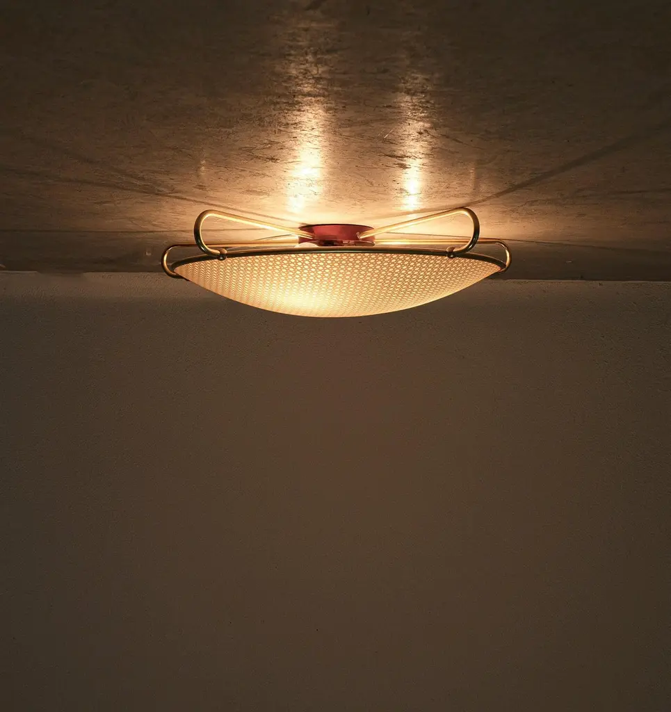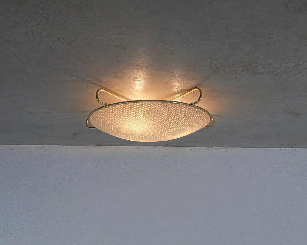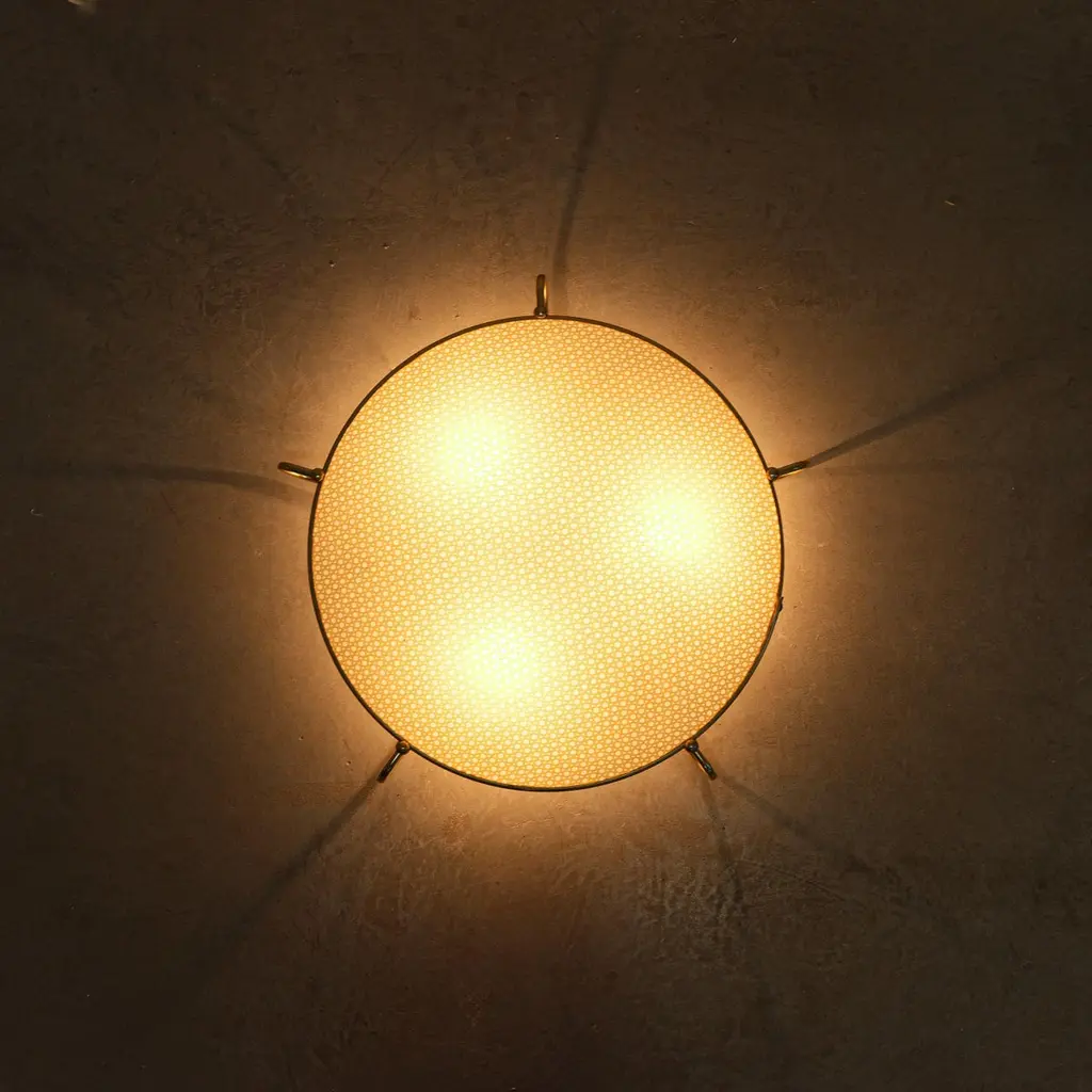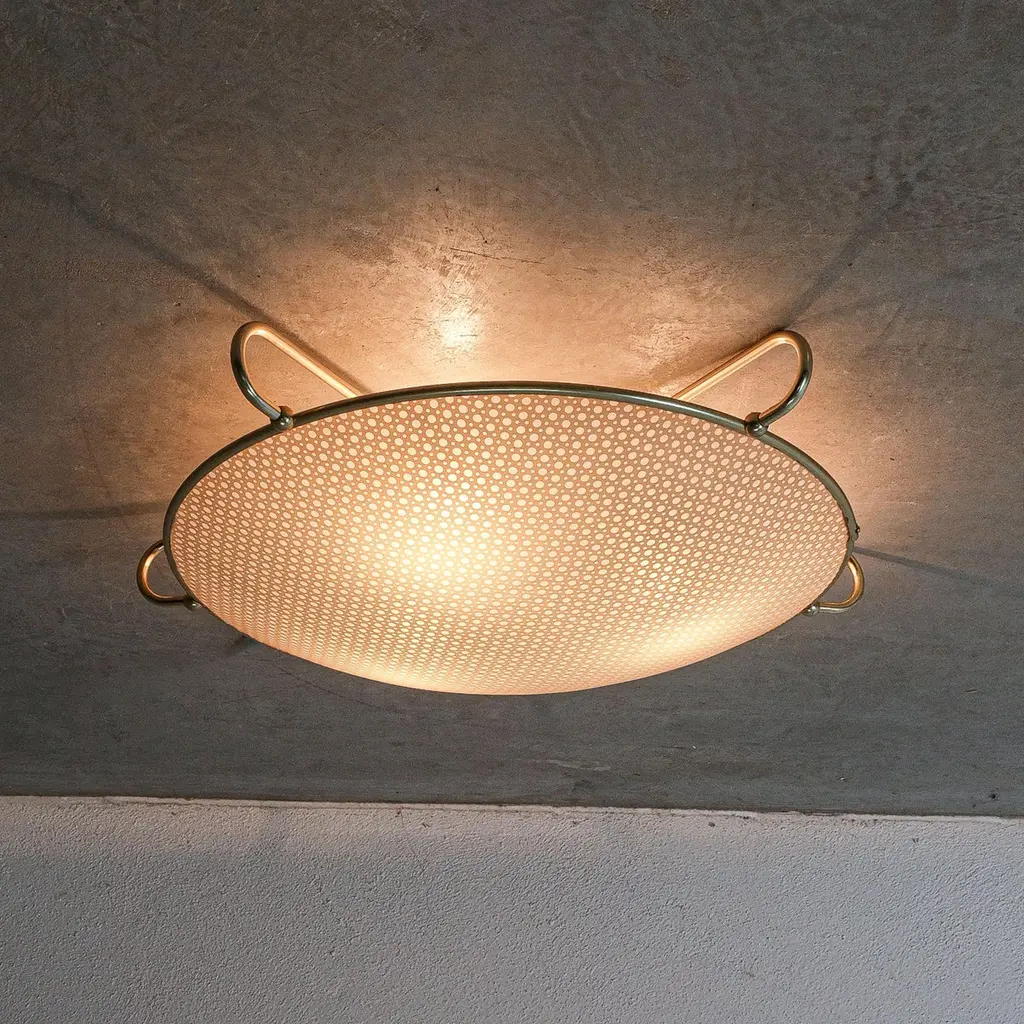 Large Mid-century Vinyl flush mount, Germany 1950- we have a pair available!Large 24" flush-mounts, circa 1955. This light features a stretched double layered shade with brass and aluminum hardware. It is in good vintage condition, working and rewired, no visible damages to the shade. Three bulbs with e27/26 each with 60W max. Led's are possible and recommended, dimmable (depending on the type of bulb) Rewired for the US.Dimensions 24.4" x 24.4" x 7.8"