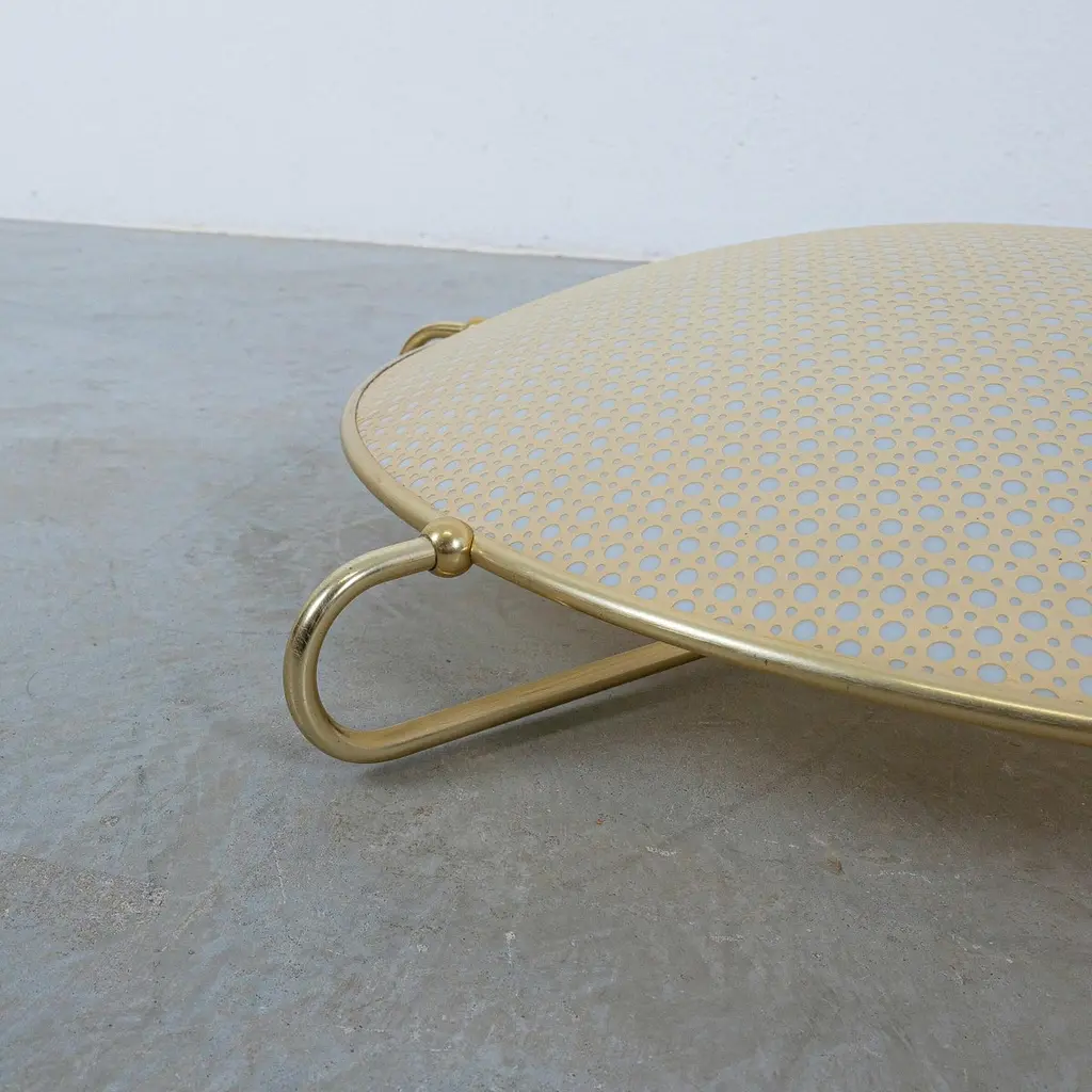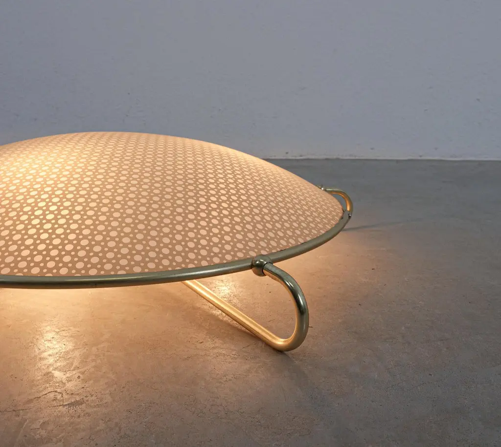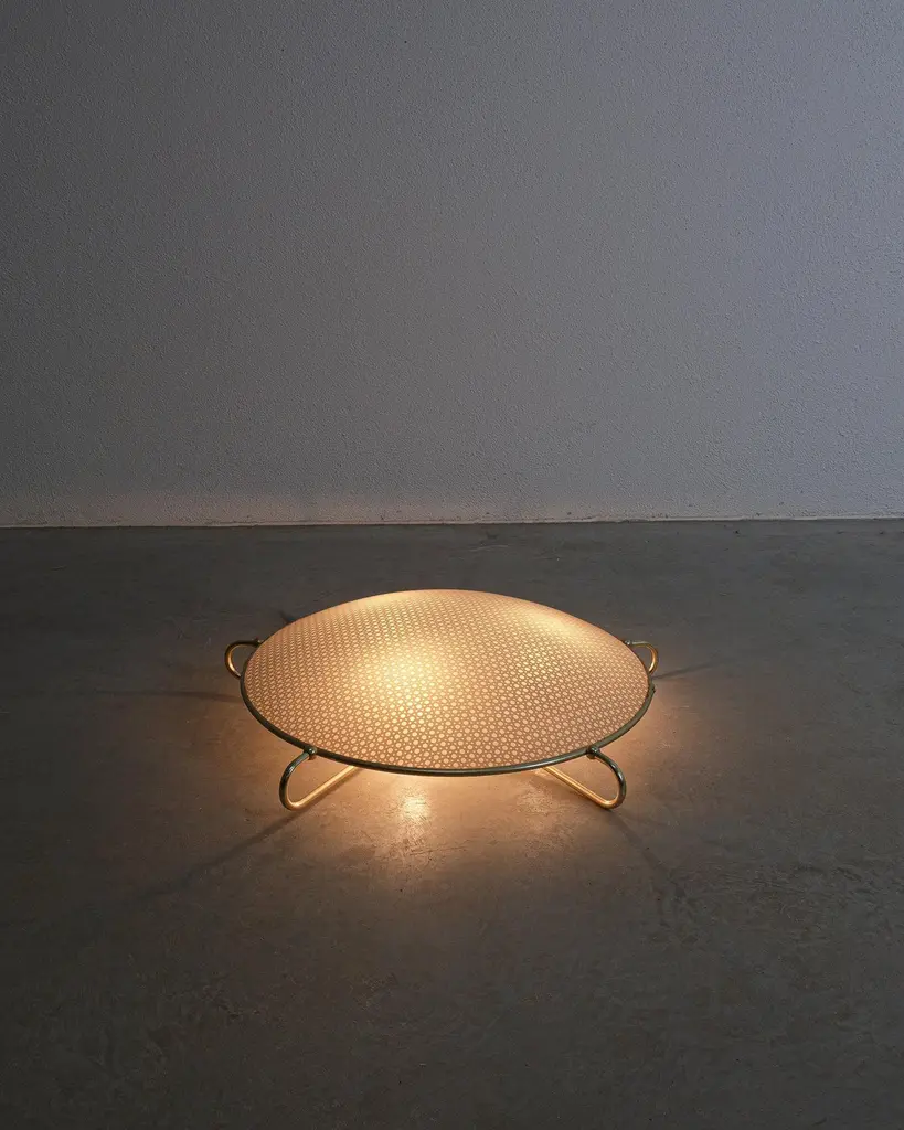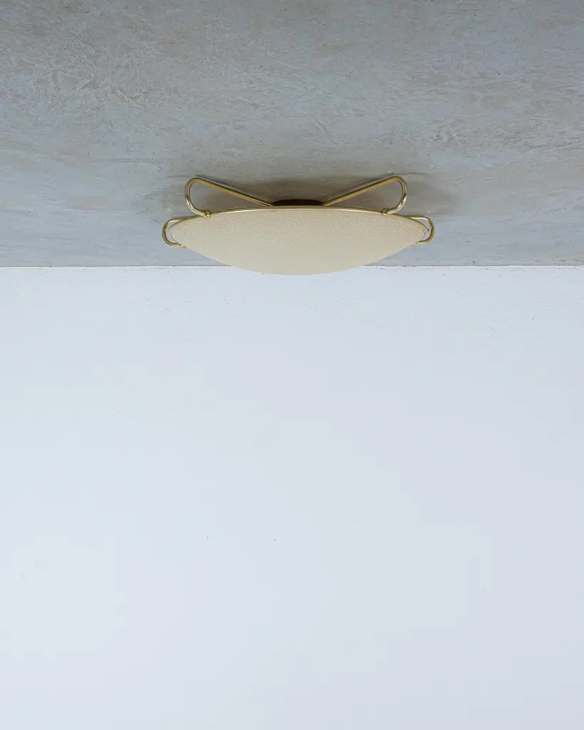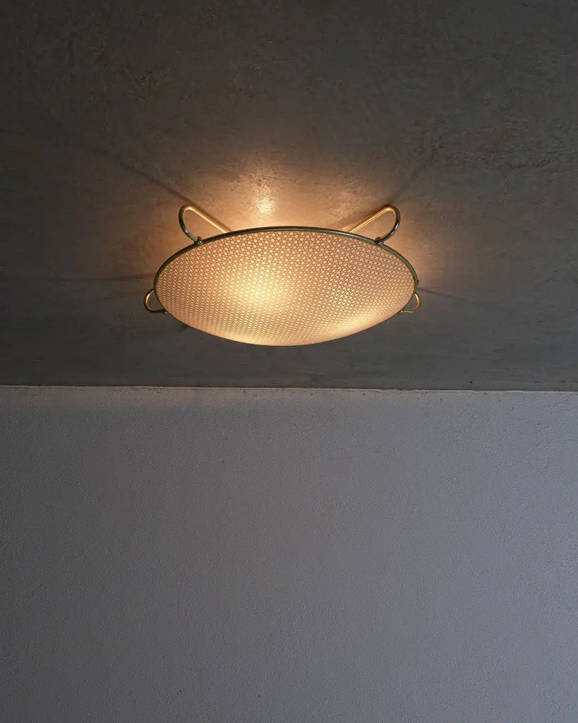 Large Mid-century Vinyl flush mount, Germany 1950- we have a pair available!Large 24" flush-mounts, circa 1955. This light features a stretched double layered shade with brass and aluminum hardware. It is in good vintage condition, working and rewired, no visible damages to the shade. Three bulbs with e27/26 each with 60W max. Led's are possible and recommended, dimmable (depending on the type of bulb) Rewired for the US.Dimensions 24.4" x 24.4" x 7.8"