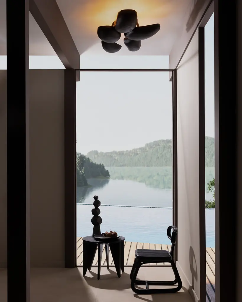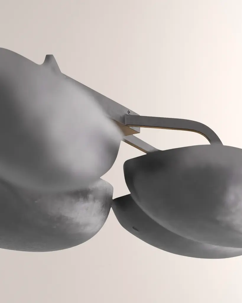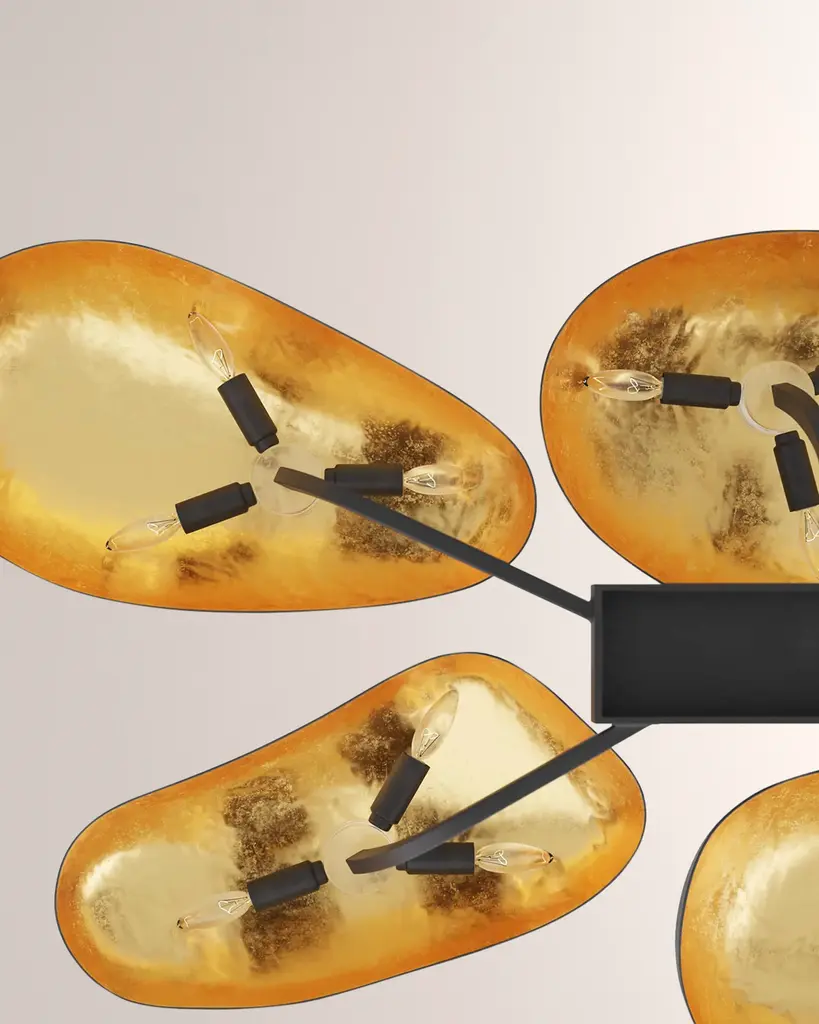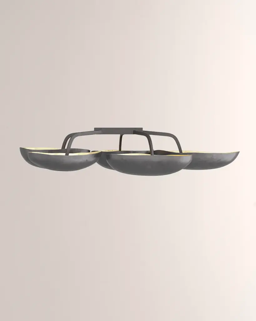 With five sculptural pod-shaped shades, the Theo Semi-Flush Mount is a bold accent in any space. Created in blackened iron with gold-leaf-lined interiors, the light is both organic and opulent. The lamp’s inverted shades illuminate a room with a warm, upwards glow. Handmade of iron Finish will vary Uses five 25-watt E12 candelabra bulbs Approx. 25"L x 54.5"W x 12.5"T Canopy, 14"W x 1.5"D x 5"T UL listed Includes hanging hardware Professional installation recommended Wipe clean Imported Weight, 26.0 lbs Boxed weight, approximately 51.7 lbs Shipping Direct from Vendor, usually ships within 60 business days. Backed by a limited manufacturer’s warranty. ( Click here for warranty information ) About Arteriors: For more than 30 years, Arteriors' pursuit of extraordinary product design, impeccable style, and artisanal quality craftsmanship have built their foundation as a premier resource within the lighting, furniture, wall décor, and decorative accessory categories. Arteriors continues to evolve their product offering, forming objects of perfect proportion and scale, resulting in bold interiors, influenced by art, architecture, and fashion. Every design is a unique statement of their commitment to bring art to every story, and a story to every interior.
