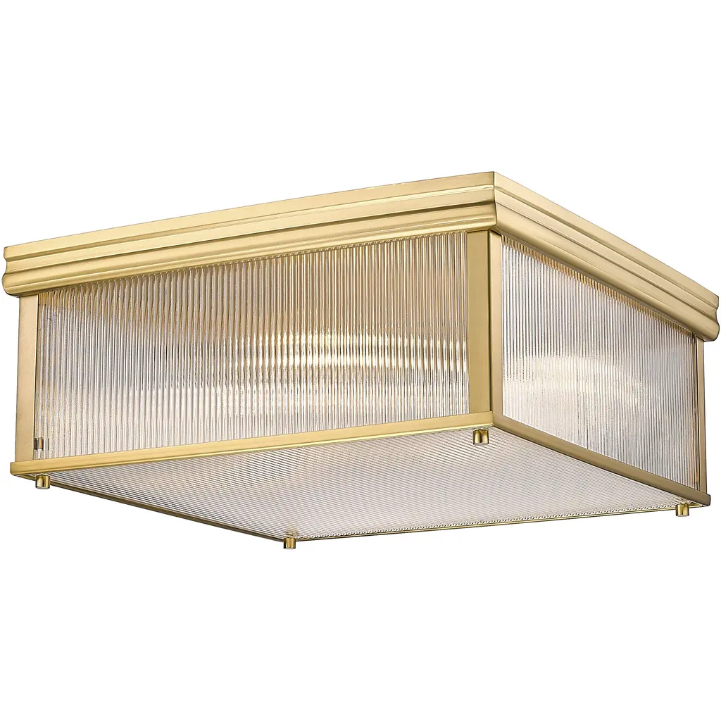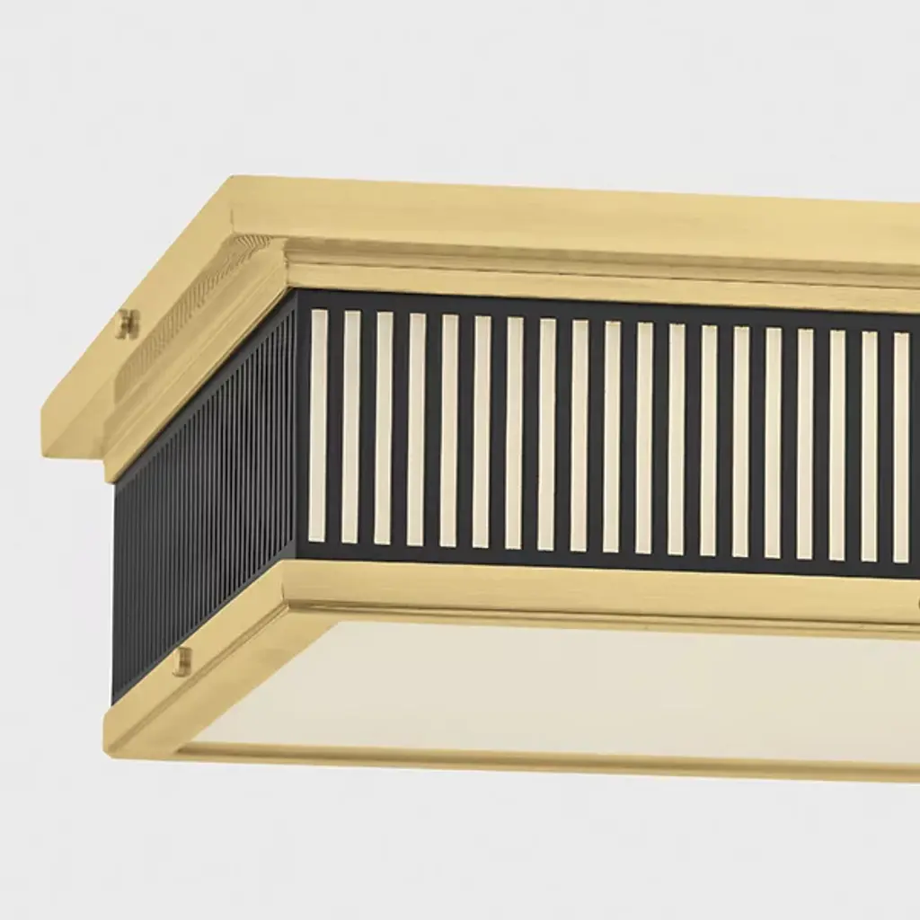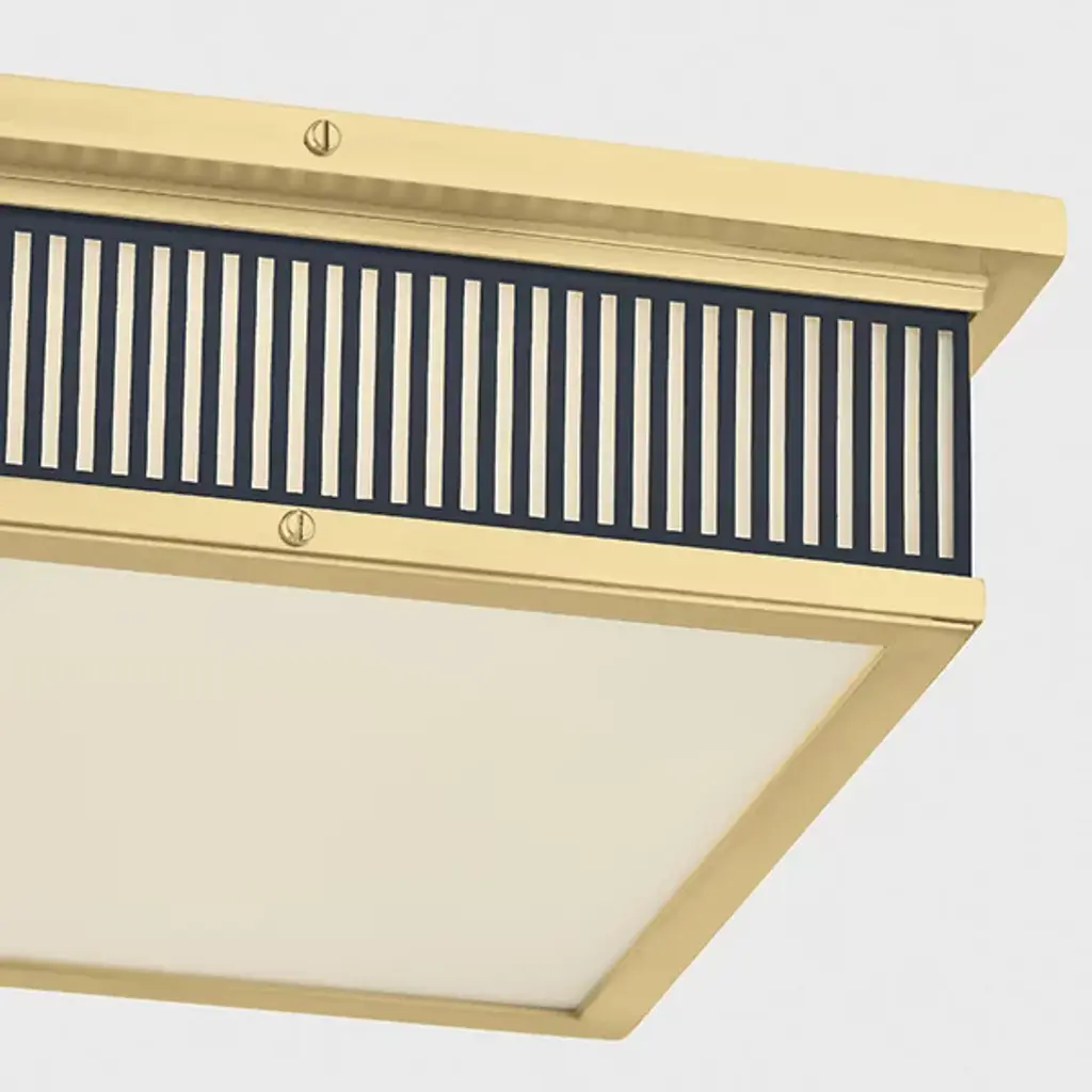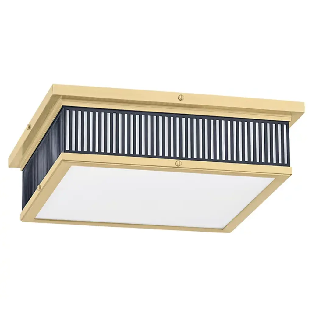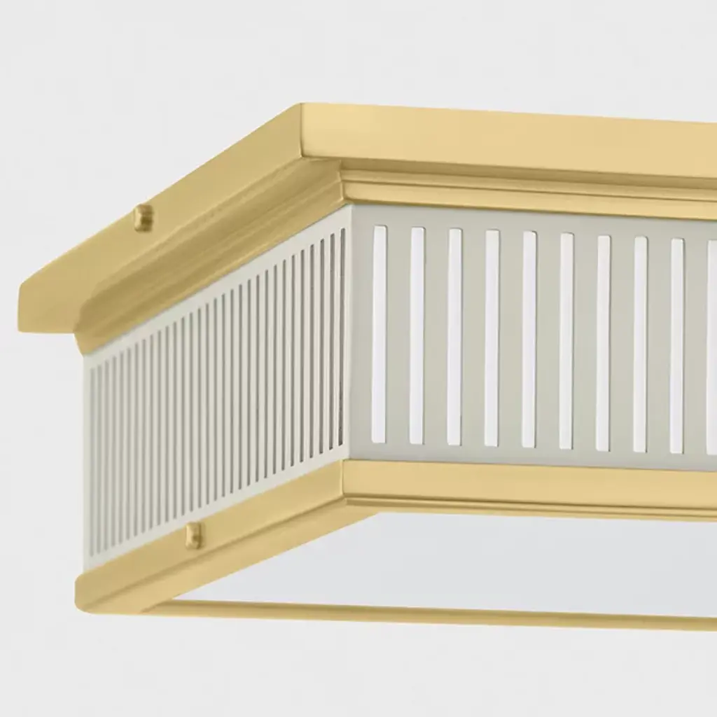 The Ashdown Square LED Flushmount from Hudson Valley Lighting encases glass in a geometric brass frame punctuated by designer Mark D. Sikes' characteristic screw details. Perforations along the frame edges let slivers of light escape, and white glass ensures even LED illumination spreads throughout your room while the brass framework provides architectural definition overhead. Sikes updates basic ceiling lighting into something worth noticing by paying attention to small details that add up to a cohesive whole. The square format offers a fresh alternative to traditional round fixtures without sacrificing functionality.