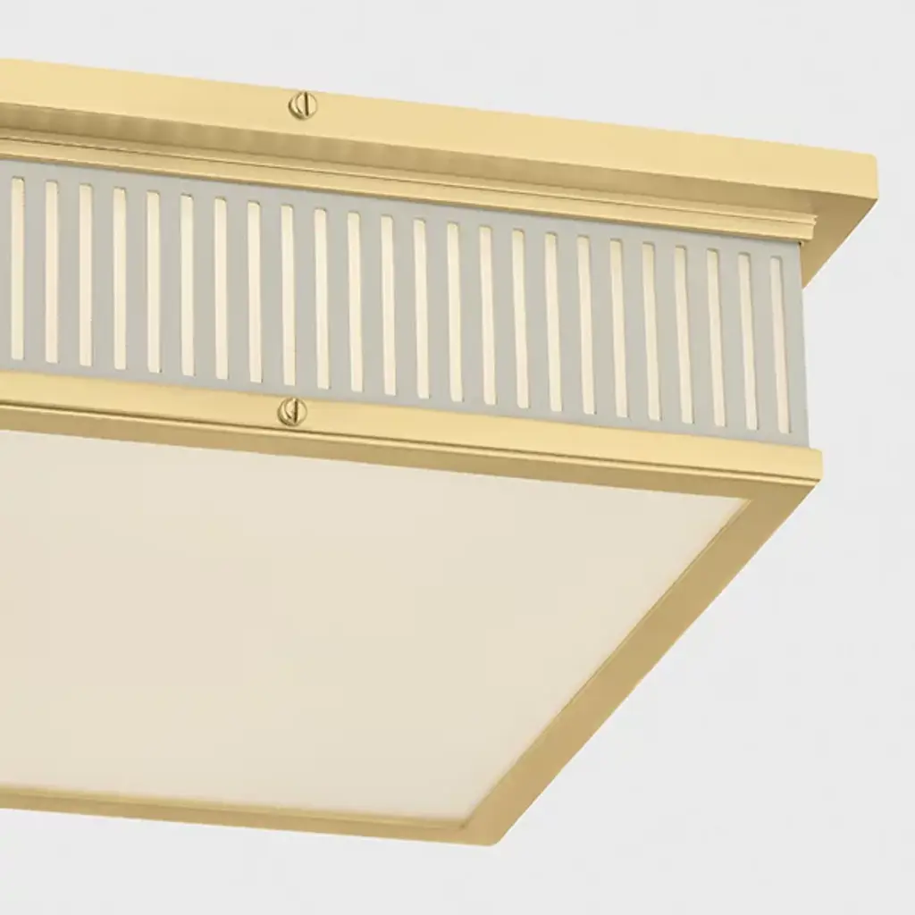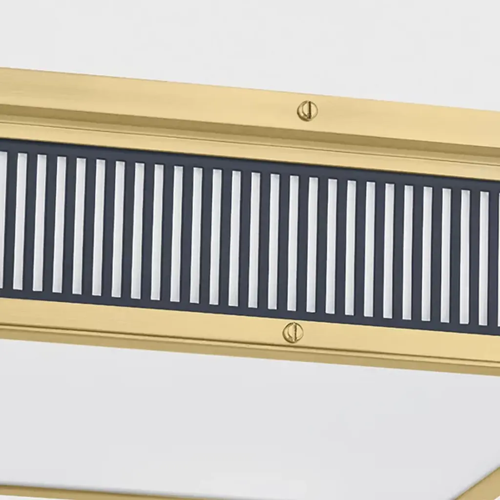 The Ashdown Square LED Flushmount from Hudson Valley Lighting encases glass in a geometric brass frame punctuated by designer Mark D. Sikes' characteristic screw details. Perforations along the frame edges let slivers of light escape, and white glass ensures even LED illumination spreads throughout your room while the brass framework provides architectural definition overhead. Sikes updates basic ceiling lighting into something worth noticing by paying attention to small details that add up to a cohesive whole. The square format offers a fresh alternative to traditional round fixtures without sacrificing functionality.