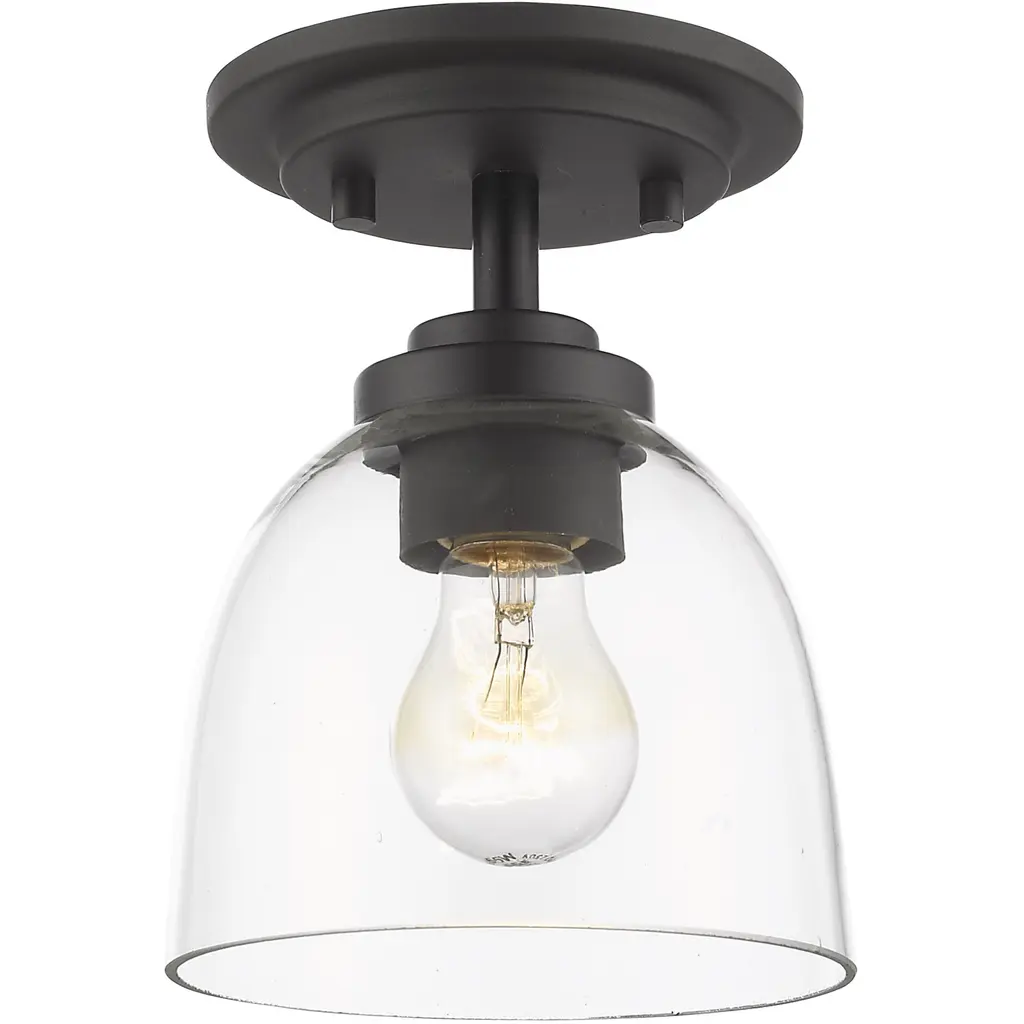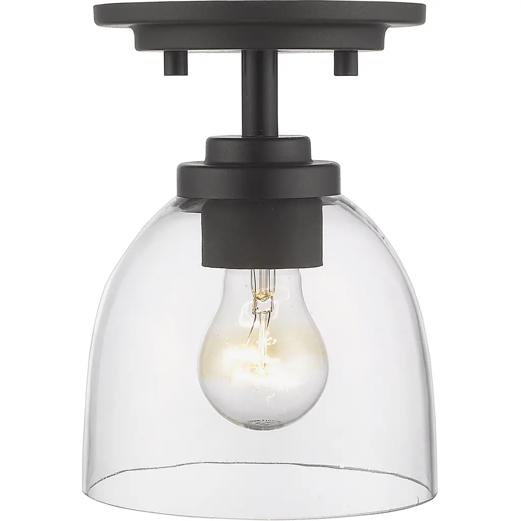 The flowing curves of the clear glass shade accentuates the smooth mount to add a touch of lovely appeal. An industrial farmhouse fusion style adds a charming warmth with the bronze finish of this one-light flush mount.