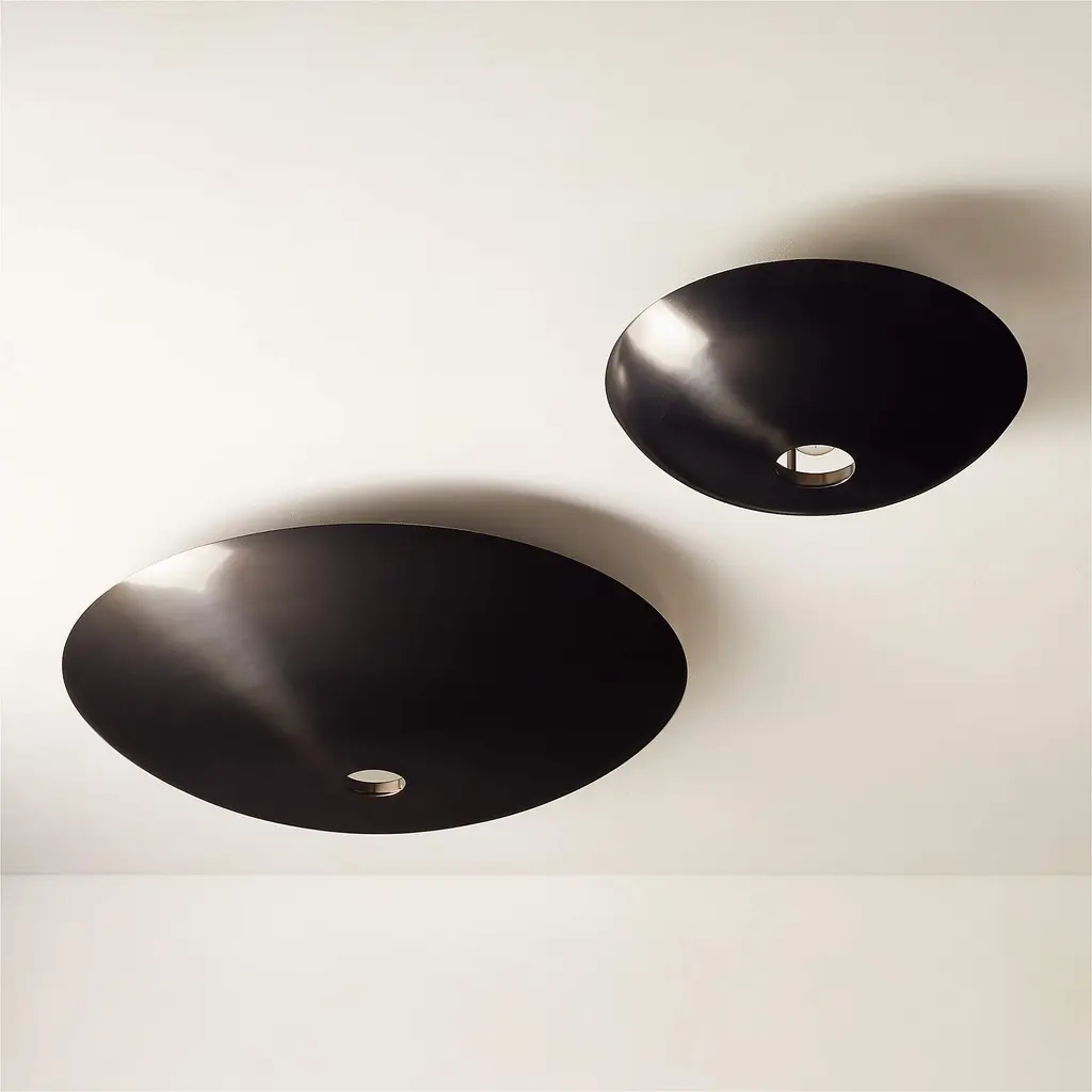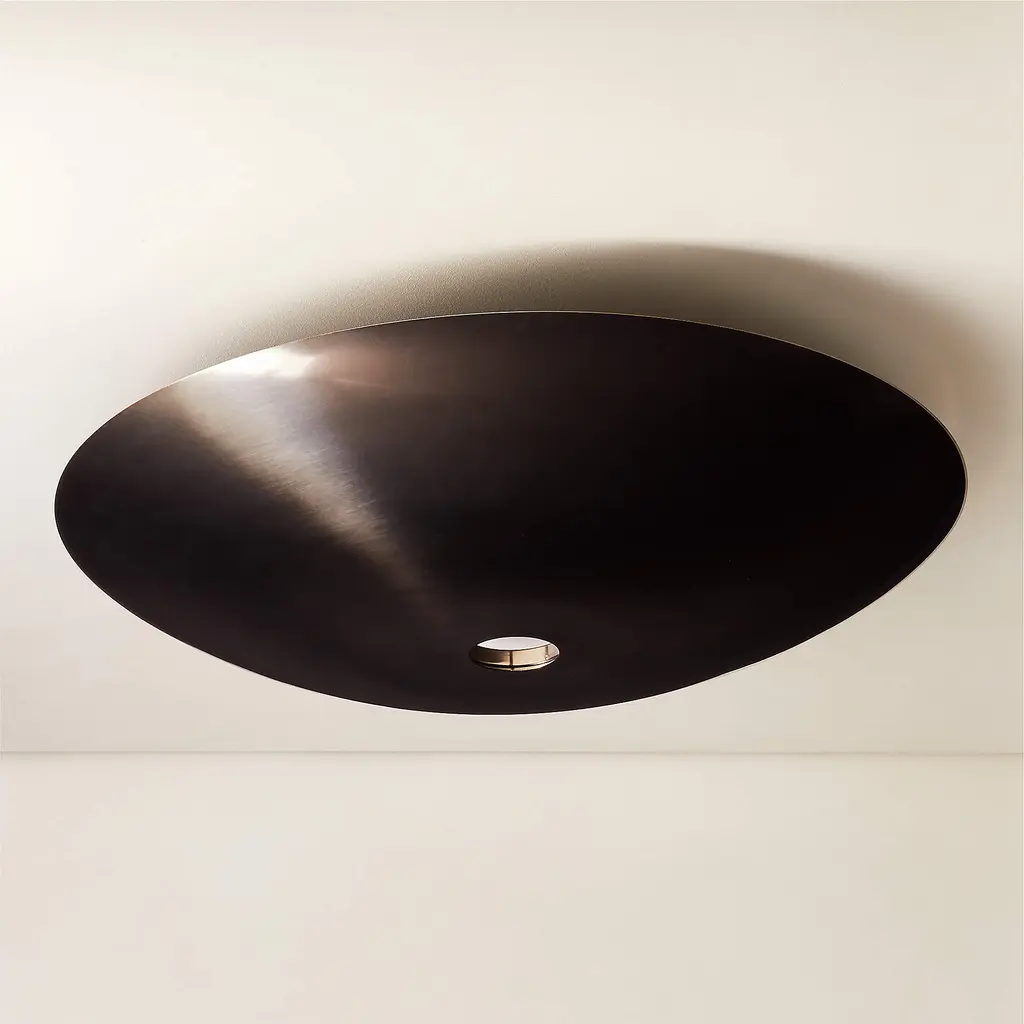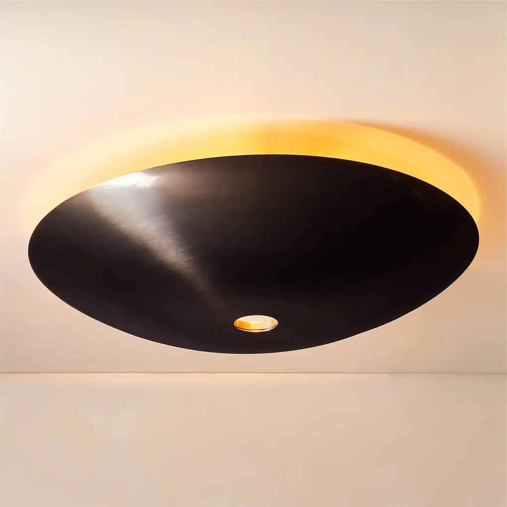 Sleek, simple flush mount design by Studio Anansi feels positively architectural. Crafted of solid blackened brass, a circular opening in the center allows light to shine through. CB2 exclusive.