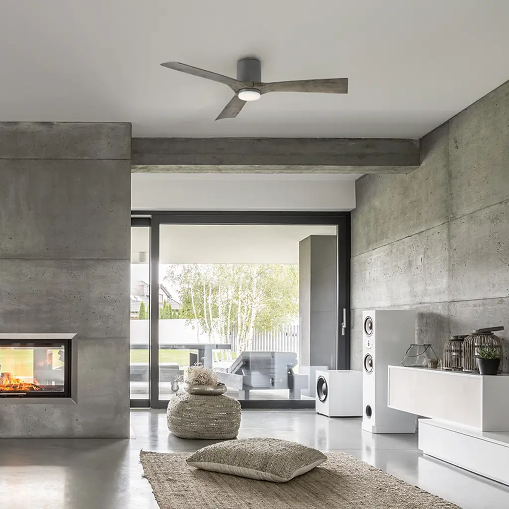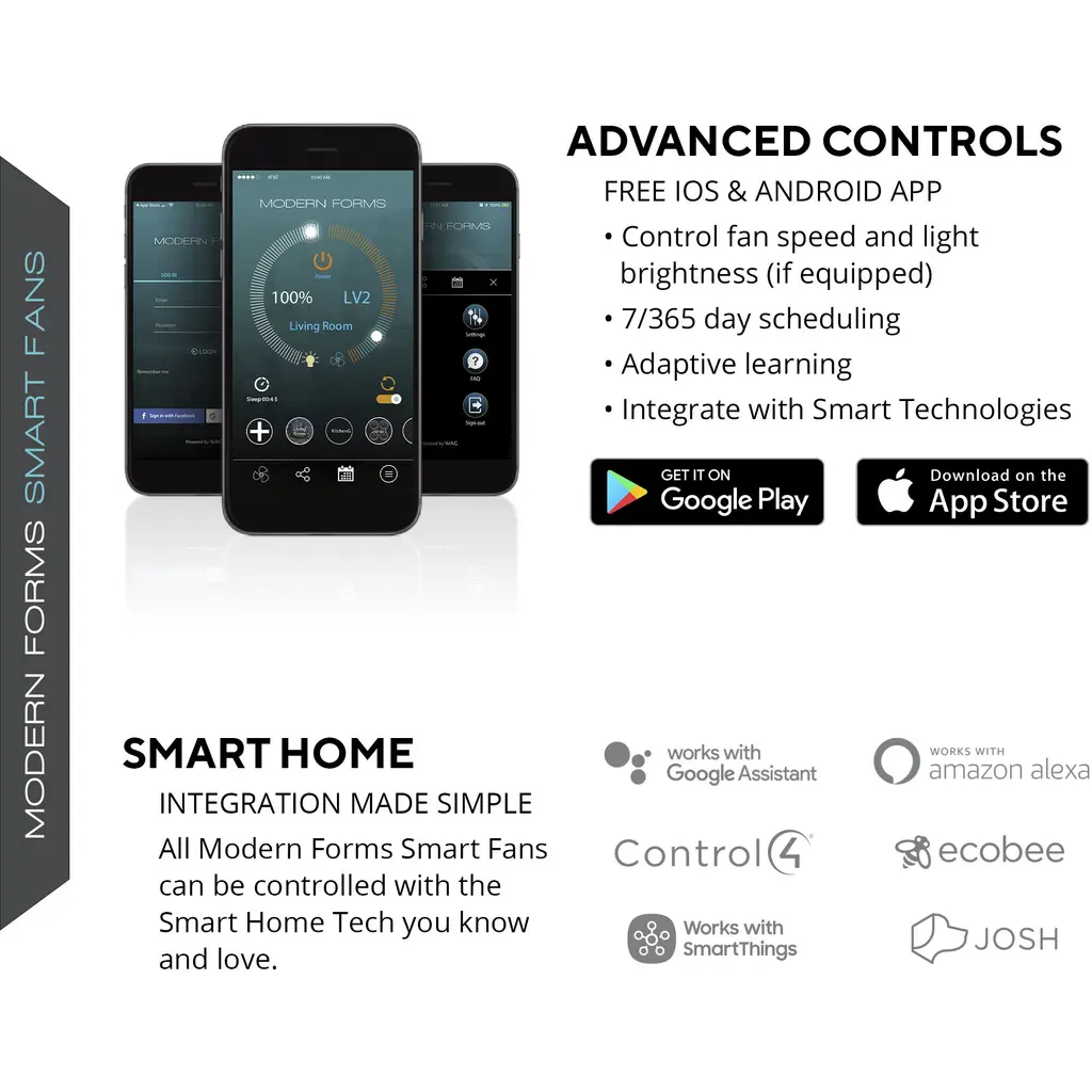 Inspired by the golden age of flying, this smart fan takes technology to the next level. Pair it with the exclusive Modern Forms app to save on energy costs and intuitively create schedules that adapt to your behavior. Two simulated wood finishes contrast with the matte black or graphite housings for an understated look in interior or exterior spaces. Available with an optional LED luminaire encased in opal glass.