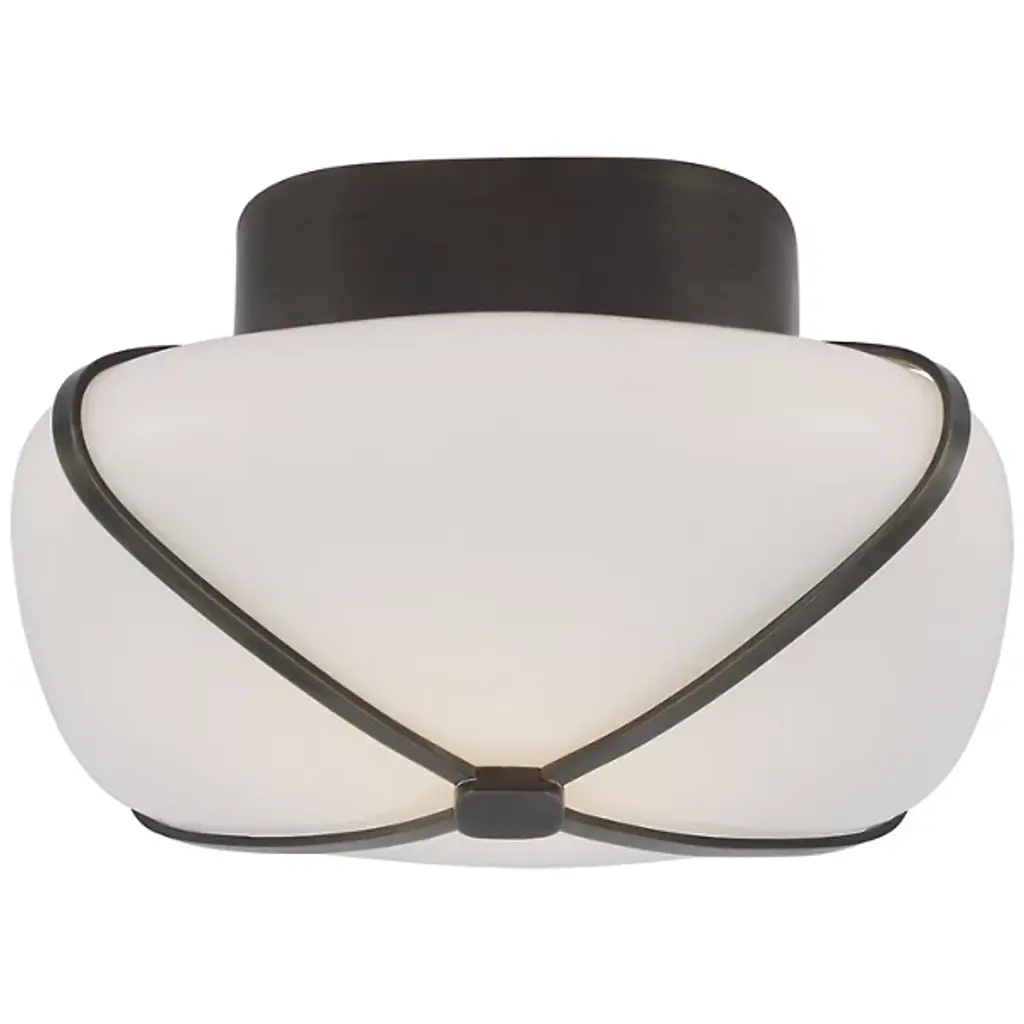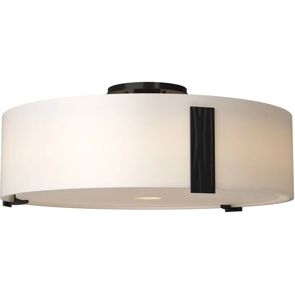 The Hubbardton Forge Axis Flushmount has a clean, simple form that focuses attention on the quality of workmanship and warm wash of light. The shade is a glass drum, held aloft by a three-pronged hand-forged wrought iron frame. Available in a variety of shade glass colors and metal finish options.