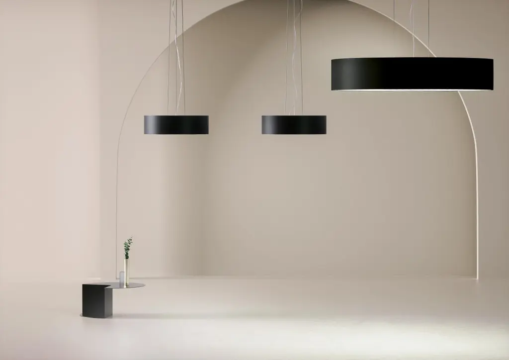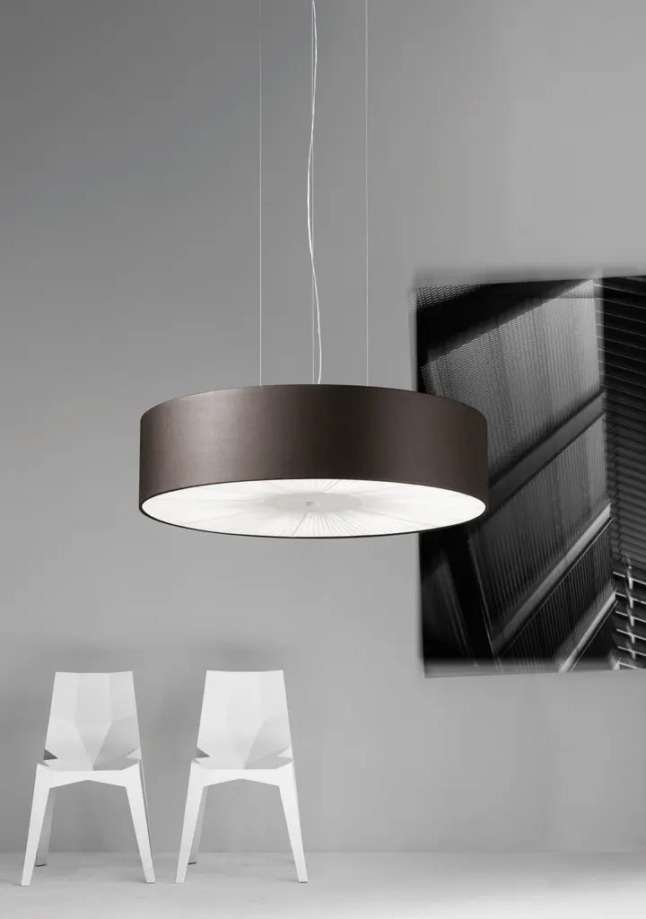 Axolight Skin Medium Flush Mount in Matt Black by Manuel VivianRefined rationality of perfect form. Skin reveals itself in its simplicity with multiple colors in fireproof eco-leather and different sizes, giving uniqueness and elegance to any environment.Culture and craftsmanship. Manuel Vivian, a long-experienced designer, is an unwitting guardian of the best in Italian artistic and manufacturing tradition. He is an expert in artisan production processes, in his creations he sets no limits to experimentation.Additional information:Materials: Steel frameFinish: WhiteColor: Matt BlackE26 - 2 x Max 20W fluoor GU24 LED VERSION- CCT 2700 K, CRI 80Dimmable ELV trailing edge, phase cut LED bulbsDownlightSurface installation over holesPower supply 120V ACSwitch mode: on-offDRY LOCATIONDimensions: Ø 70 x 21 H cm Available in other size options: L, XLAvailable in other color options: Ivory, white, brown