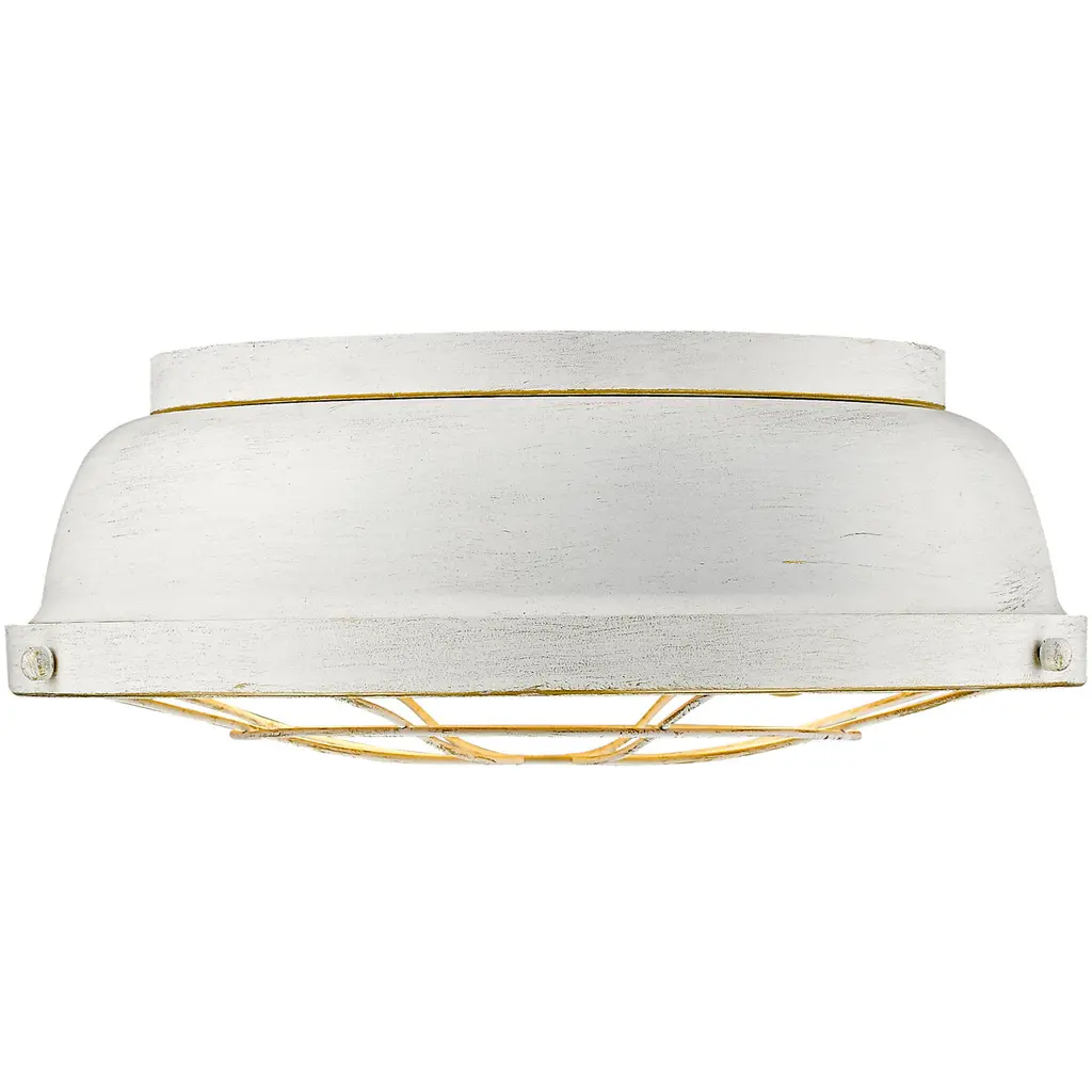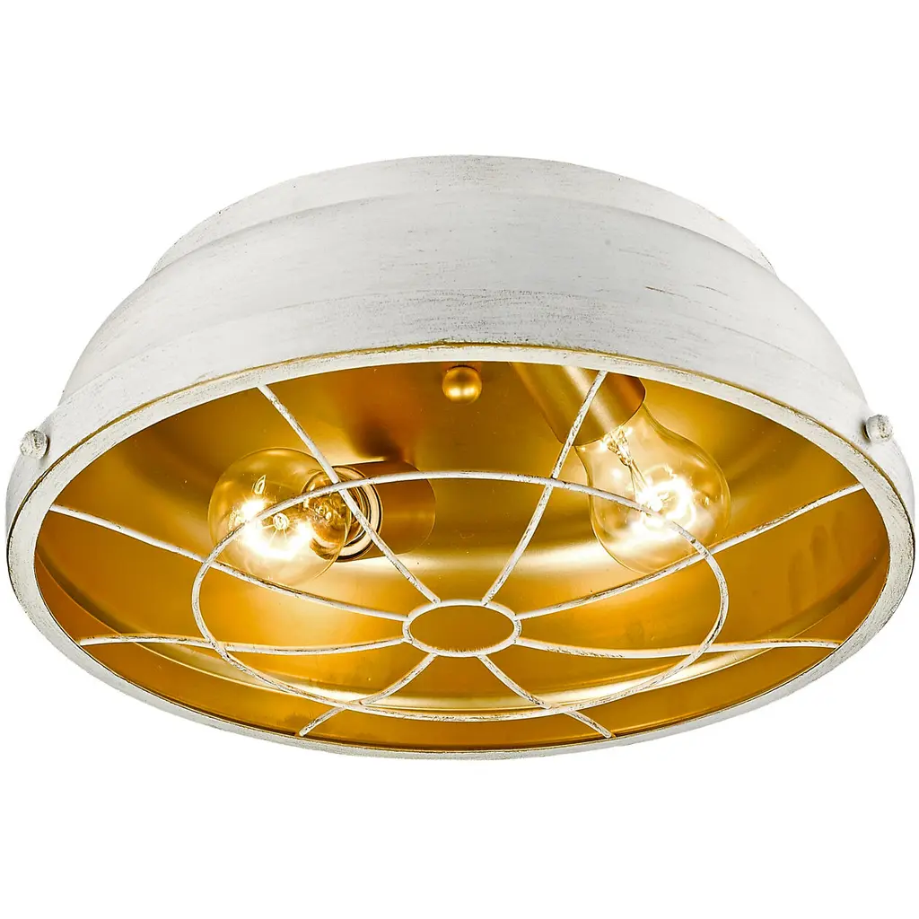 Bring timeless charm into your home with the Golden Lighting Bartlett 2-light Flush Mount. Featuring a metal shade and a French White frame, it creates a welcoming atmosphere. The metal shade beautifully diffuses light while contributing to the rustic aesthetic with its matte sheen. The finish is inspired by French country estates, hand-brushed for a deep, linear texture and a touch of warm gold undercoat that emerges through the white surface. Perfectly versatile, this fixture is ideal for low ceilings in hallways, closets, bathrooms, and more, and is rated for damp locations, making it suitable for covered spaces with occasional moisture.Overall Dimensions: 14"W x 5.5"H x 14"D. Requires 2 E26 Medium base bulbs (not included), with a maximum wattage of 60 per bulb. Enhance your home with this stylish piece that embodies quality craftsmanship and rustic charm.