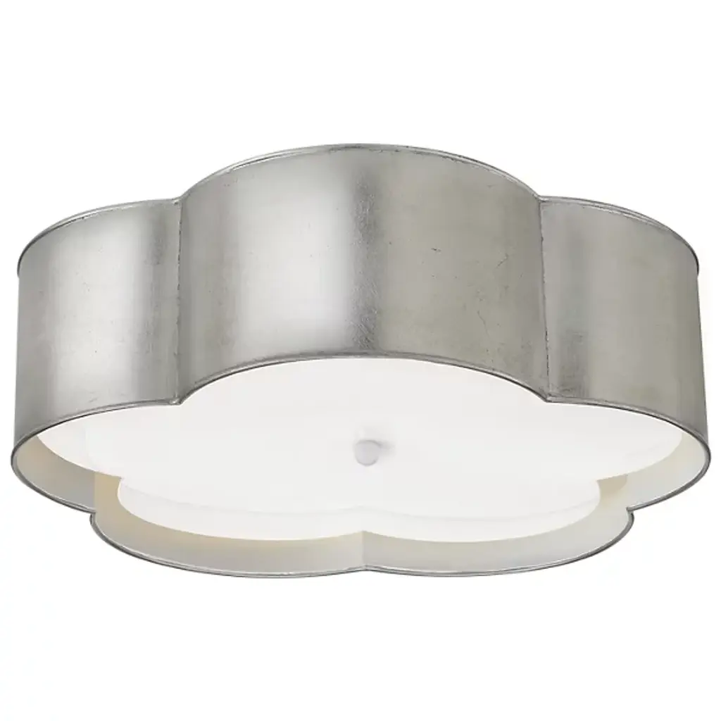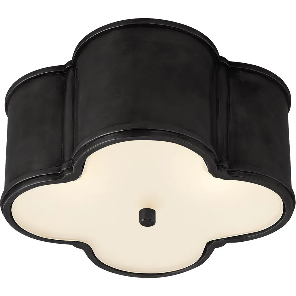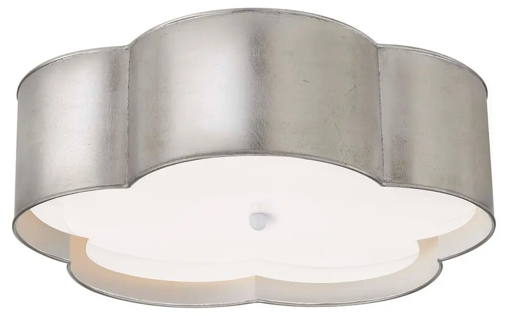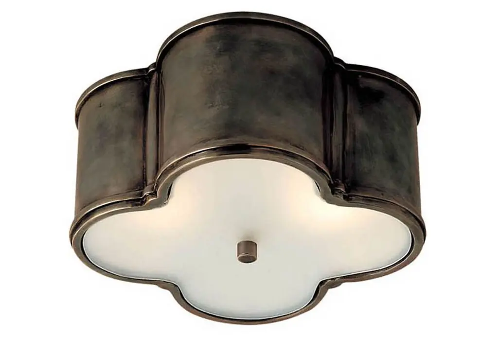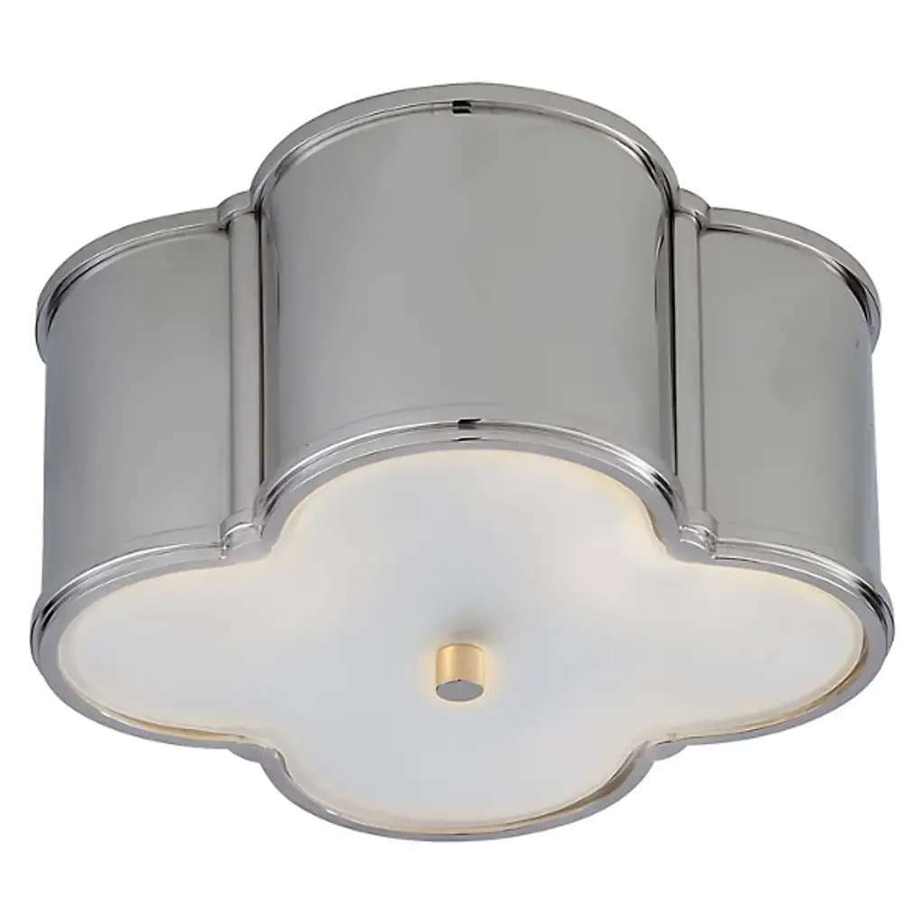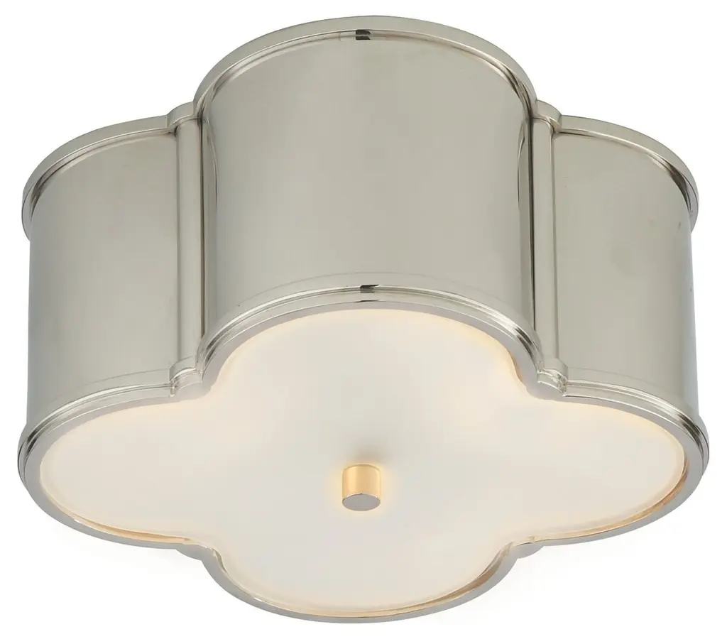The Basil Flushmount by Visual Comfort Signature, formerly known as Visual Comfort, draws on architectural history using a quatrefoil frame to show off detailed metal work and timeless finishes. A Frosted Glass diffuser smoothly distributes light from the bulbs within to illuminate your space with an even warmth. Dimmable with a standard incandescent dimmer (not included). Designed by Alexa Hampton.