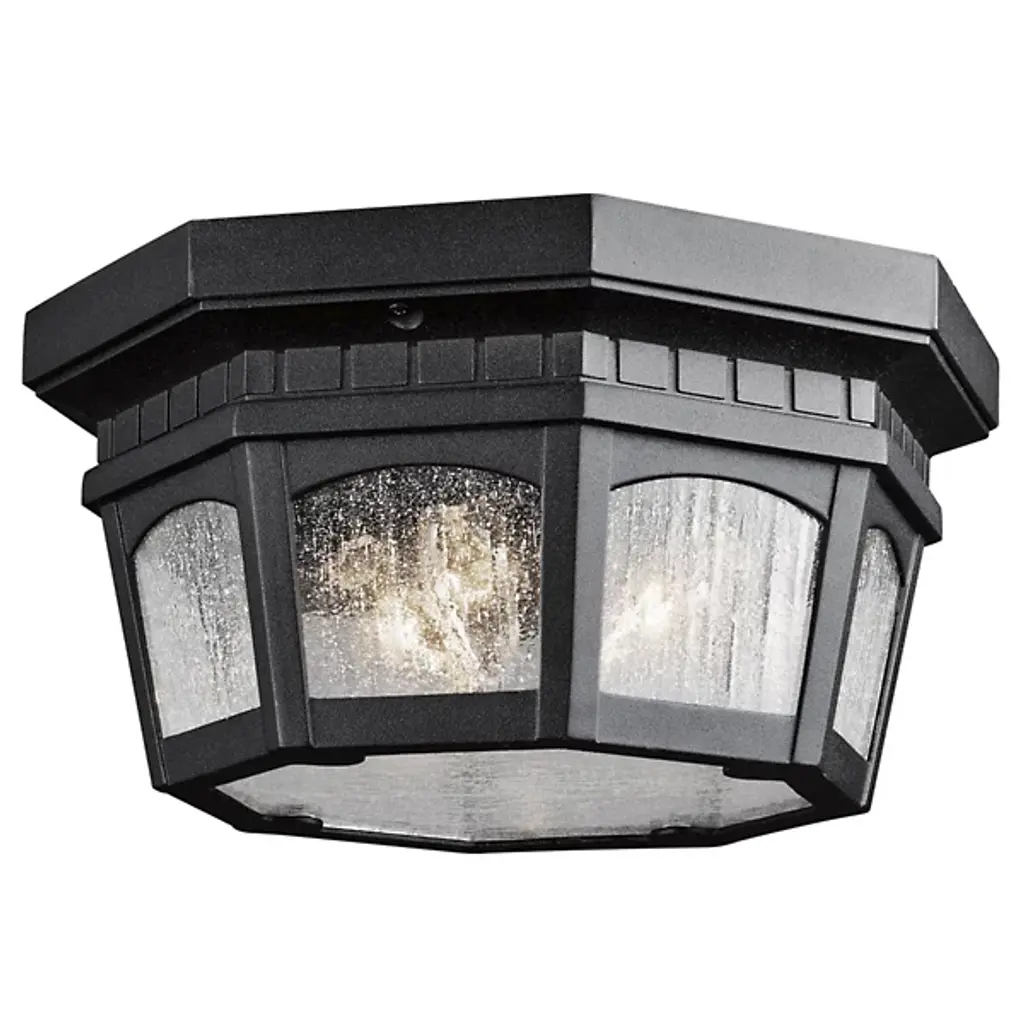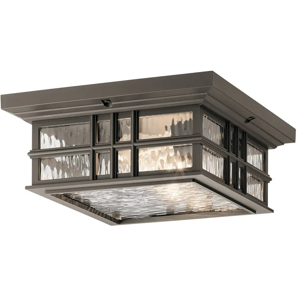 Classic craftsman architecture and contemporary flair meet in the Beacon Square Outdoor Flushmount by Kichler. Clear hammered glass alludes to the surface of the ocean while the matte framing creates a window for its soft, warm light. This fixture is crafted from a special material that is designed to weather harsh outdoor conditions, including UV rays and saltwater spray, making it a durable and lasting lighting solution for decks, outdoor entryways, and the like.
