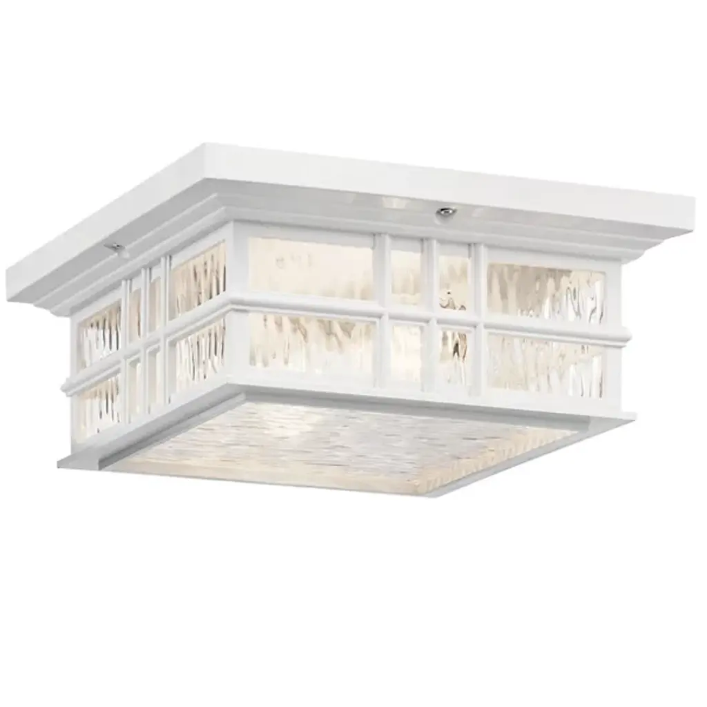 Classic craftsman architecture and contemporary flair meet in the Beacon Square Outdoor Flushmount by Kichler. Clear hammered glass alludes to the surface of the ocean while the matte framing creates a window for its soft, warm light. This fixture is crafted from a special material that is designed to weather harsh outdoor conditions, including UV rays and saltwater spray, making it a durable and lasting lighting solution for decks, outdoor entryways, and the like.